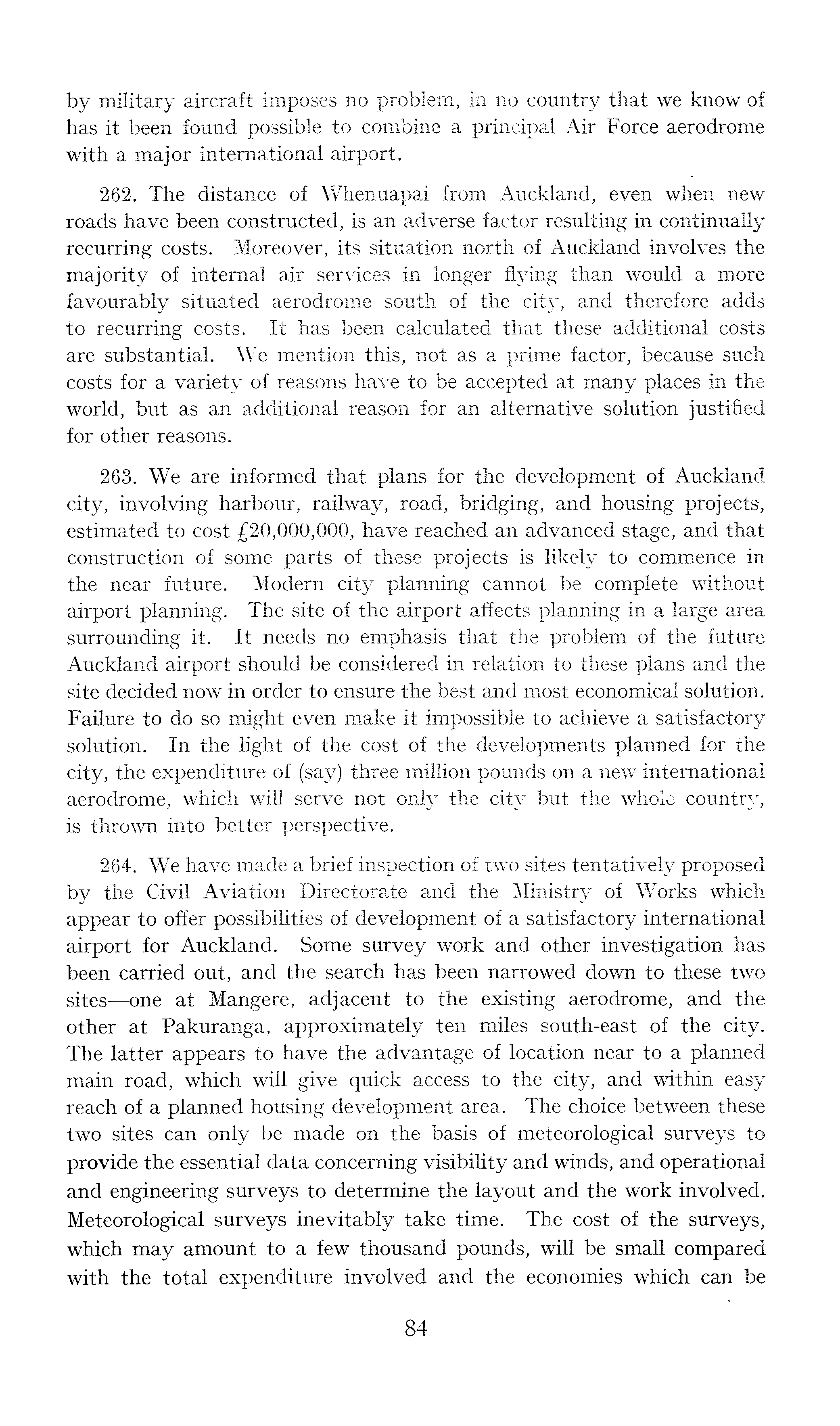by military aircraft imposes no problem, in no country that we know of has it been found possible to combine a principal Air Force aerodrome with a major international airport. 262. The distance of Whenuapai from Auckland, even when new roads have been constructed, is an adverse factor resulting in continually recurring costs. Moreover, its situation north of Auckland involves the majority of internal air services in longer flying than would a more favourably situated aerodrome south of the city, and therefore adds to recurring costs. It has been calculated that these additional costs are substantial. We mention this, not as a prime factor, because such costs for a variety of reasons have to be accepted at many places in the world, but as an additional reason for an alternative solution justified for other reasons. 263. We are informed that plans for the development of Auckland city, involving harbour, railway, road, bridging, and housing projects, estimated to cost £20,000,000, have reached an advanced stage, and that construction of some parts of these projects is likely to commence in the near future. Modern city planning cannot be complete without airport planning. The site of the airport affects planning in a large area surrounding it. It needs no emphasis that the problem of the future Auckland airport should be considered in relation to these plans and the site decided now in order to ensure the best and most economical solution. Failure to do so might even make it impossible to achieve a satisfactory solution. In the light of the cost of the developments planned for the city, the expenditure of (say) three million pounds on a new international aerodrome, which will serve not only the city but the whole country, is thrown into better perspective. 264. We have made a brief inspection of two sites tentatively proposed by the Civil Aviation Directorate and the Ministry of Works which appear to offer possibilities of development of a satisfactory international airport for Auckland. Some survey work and other investigation has been carried out, and the search has been narrowed down to these two sites —one at Mangere, adjacent to the existing aerodrome, and the other at Pakuranga, approximately ten miles south-east of the city. The latter appears to have the advantage of location near to a planned main road, which will give quick access to the city, and within easy reach of a planned housing development area. The choice between these two sites can only be made on the basis of meteorological surveys to provide the essential data concerning visibility and winds, and operational and engineering surveys to determine the layout and the work involved. Meteorological surveys inevitably take time. The cost of the surveys, which may amount to a few thousand pounds, will be small compared with the total expenditure involved and the economies which can be