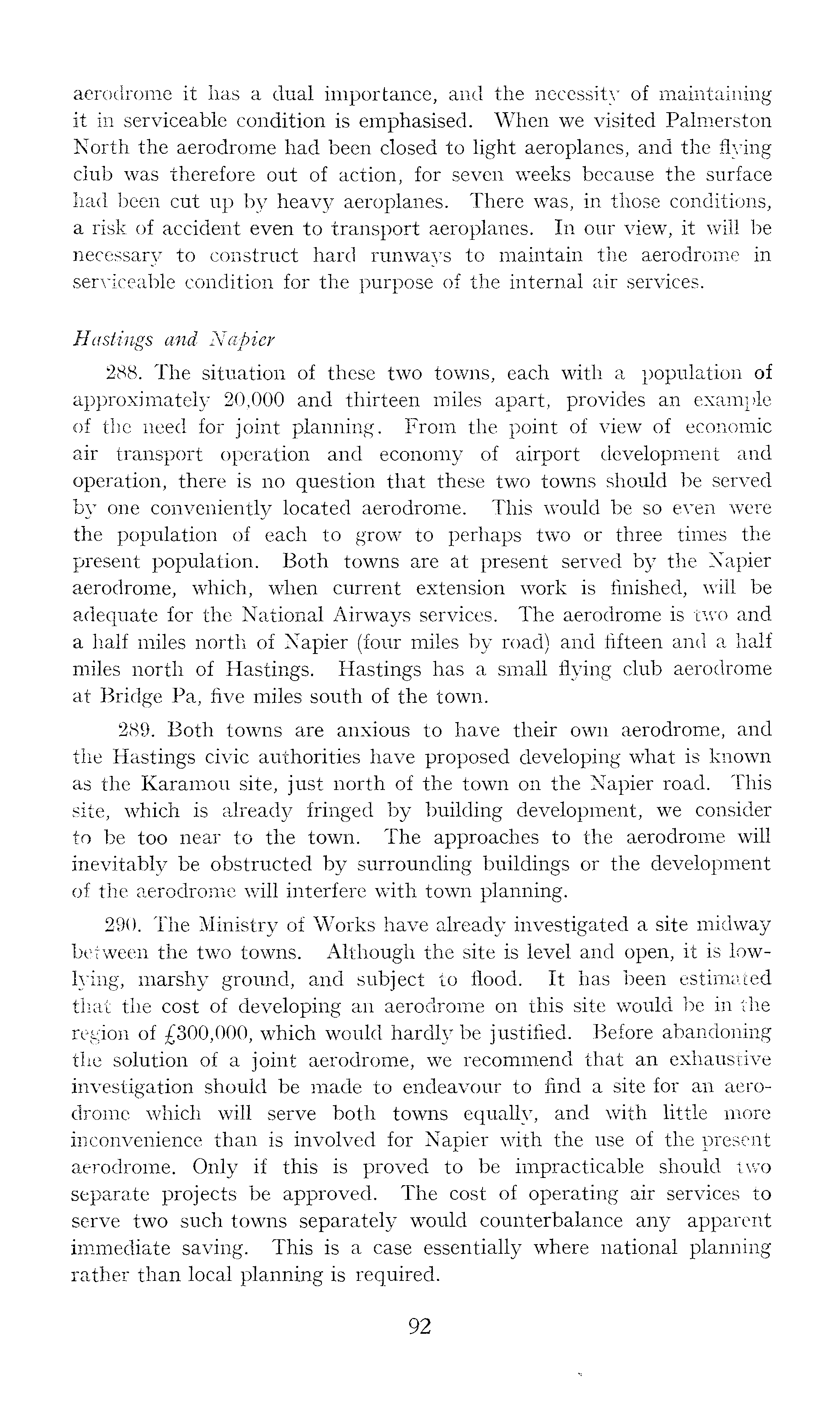 aerodrome it has a dual importance, and the necessity of maintaining it in serviceable condition is emphasised. When we visited Palmerston North the aerodrome had been closed to light aeroplanes, and the flying club was therefore out of action, for seven weeks because the surface had been cut up by heavy aeroplanes. There was, in those conditions, a risk of accident even to transport aeroplanes. In our view, it will be necessary to construct hard runways to maintain the aerodrome in serviceable condition for the purpose of the internal air services. Hastings and Napier 288. The situation of these two towns, each with a population of approximately 20,000 and thirteen miles apart, provides an example of the need for joint planning. From the point of view of economic air transport operation and economy of airport development and operation, there is no question that these two towns should be served by one conveniently located aerodrome. This would be so even were the population of each to grow to perhaps two or three times the present population. Both towns are at present served by the Napier aerodrome, which, when current extension work is finished, will be adequate for the National Airways services. The aerodrome is two and a half miles north of Napier (four miles by road) and fifteen and a half miles north of Hastings. Hastings has a small flying club aerodrome at Bridge Pa, five miles south of the town. 289. Both towns are anxious to have their own aerodrome, and the Hastings civic authorities have proposed developing what is known as the Karamou site, just north of the town on the Napier road. This site, which is already fringed by building development, we consider to be too near to the town. The approaches to the aerodrome will inevitably be obstructed by surrounding buildings or the development of the aerodrome will interfere with town planning. 290. The Ministry of Works have already investigated a site midway between the two towns. Although the site is level and open, it is lowlying, marshy ground, and subject to flood. It has been estimated that the cost of developing an aerodrome on this site would be in the region of £300,000, which would hardly be justified. Before abandoning the solution of a joint aerodrome, we recommend that an exhaustive investigation should be made to endeavour to find a site for an aerodrome which will serve both towns equally, and with little more inconvenience than is involved for Napier with the use of the present aerodrome. Only if this is proved to be impracticable should two separate projects be approved. The cost of operating air services to serve two such towns separately would counterbalance any apparent immediate saving. This is a case essentially where national planning rather than local planning is required.