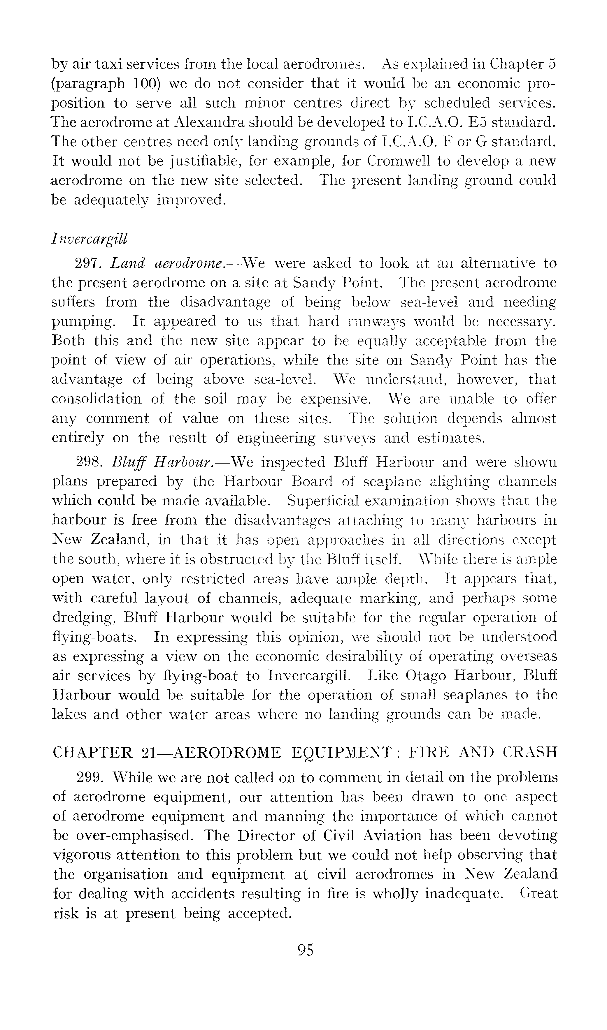 by air taxi services from the local aerodromes. As explained in Chapter 5 (paragraph 100) we do not consider that it would be an economic proposition to serve all such minor centres direct by scheduled services. The aerodrome at Alexandra should be developed to 1.C.A.0. E5 standard. The other centres need only landing grounds of 1.C.A.0. F or G standard. It would not be justifiable, for example, for Cromwell to develop a new aerodrome on the new site selected. The present landing ground could be adequately improved. Invercargill 297. Land aerodrome. —We were asked to look at an alternative to the present aerodrome on a site at Sandy Point. The present aerodrome suffers from the disadvantage of being below sea-level and needing pumping. It appeared to us that hard runways would be necessary. Both this and the new site appear to be equally acceptable from the point of view of air operations, while the site on Sandy Point has the advantage of being above sea-level. We understand, however, that consolidation of the soil may be expensive. We are unable to offer any comment of value on these sites. The solution depends almost entirely on the result Of engineering surveys and estimates. 298. Bluff Harbour. —We inspected Bluff Harbour and were shown plans prepared by the Harbour Board of seaplane alighting channels which could be made available. Superficial examination shows that the harbour is free from the disadvantages attaching to many harbours in New Zealand, in that it has open approaches in all directions except the south, where it is obstructed by the Bluff itself. While there is ample open water, only restricted areas have ample depth. It appears that, with careful layout of channels, adequate marking, and perhaps some dredging, Bluff Harbour would be suitable for the regular operation of flying-boats. In expressing this opinion, we should not be understood as expressing a view on the economic desirability of operating overseas air services by flying-boat to Invercargill. Like Otago Harbour, Bluff Harbour would be suitable for the operation of small seaplanes to the lakes and other water areas where no landing grounds can be made. CHAPTER 21—AERODROME EQUIPMENT: FIRE AND CRASH 299. While we are not called on to comment in detail on the problems of aerodrome equipment, our attention has been drawn to one aspect of aerodrome equipment and manning the importance of which cannot be over-emphasised. The Director of Civil Aviation has been devoting vigorous attention to this problem but we could not help observing that the organisation and equipment at civil aerodromes in New Zealand for dealing with accidents resulting in fire is wholly inadequate. Great risk is at present being accepted.