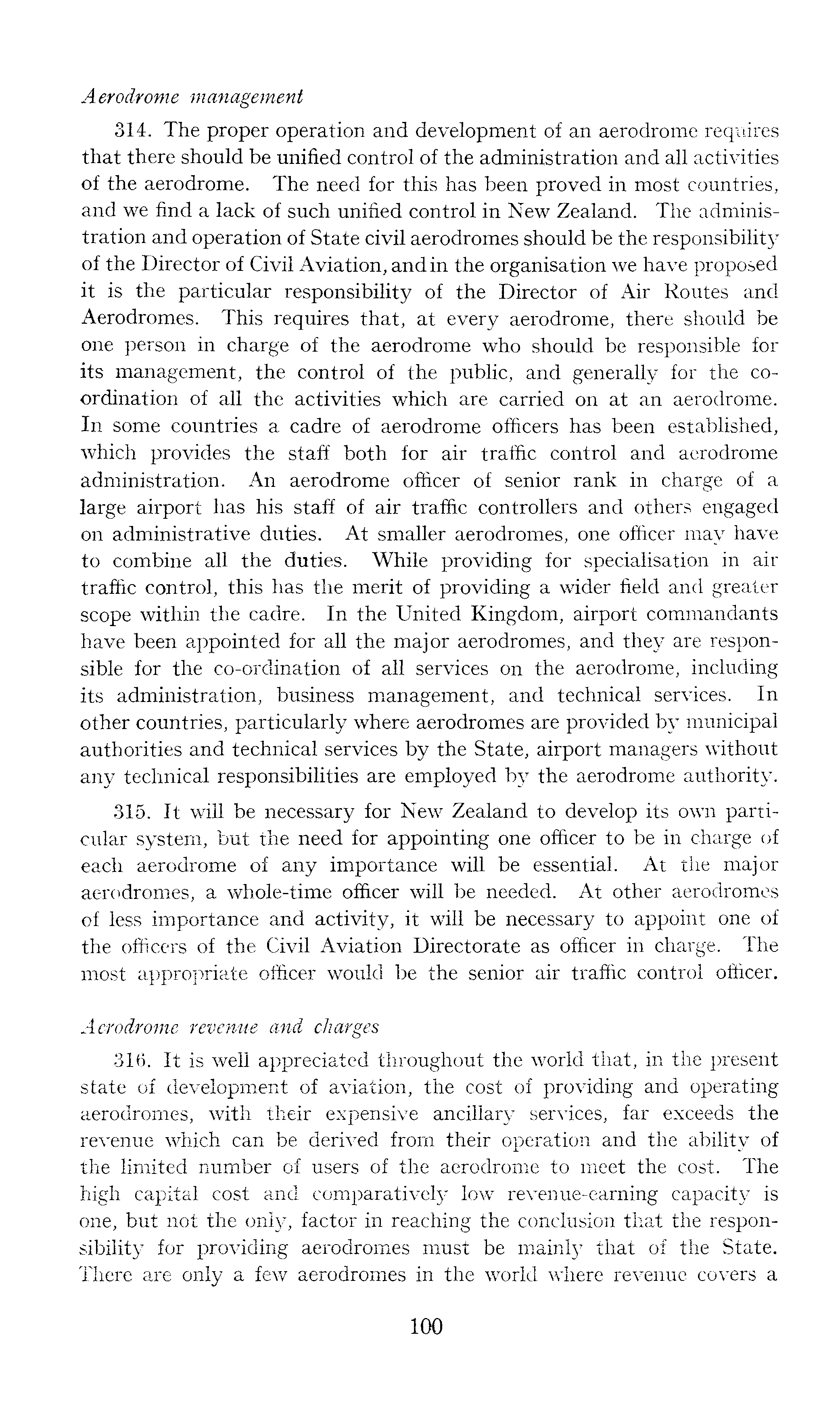 Aerodrome management 314. The proper operation and development of an aerodrome requires that there should be unified control of the administration and all activities of the aerodrome. The need for this has been proved in most countries, and we find a lack of such unified control in New Zealand. The administration and operation of State civil aerodromes should be the responsibility of the Director of Civil Aviation, and in the organisation we have proposed it is the particular responsibility of the Director of Air Routes and Aerodromes. This requires that, at every aerodrome, there should be one. person in charge of the aerodrome who should be responsible for its management, the control of the public, and generally for the coordination of all the activities which are carried on at an aerodrome. In some countries a cadre of aerodrome officers has been established, which provides the staff both for air traffic control and aerodrome administration. An aerodrome officer of senior rank in charge of a large airport has his staff of air traffic controllers and others engaged on administrative duties. At smaller aerodromes, one officer may have to combine all the duties. While providing for specialisation in air traffic control, this has the merit of providing a wider field and greater scope within the cadre. In the United Kingdom, airport commandants have been appointed for all the major aerodromes, and they are responsible for the co-ordination of all services on the aerodrome, including its administration, business management, and technical services. In other countries, particularly where aerodromes are provided by municipal authorities and technical services by the State, airport managers without any technical responsibilities are employed by the aerodrome authority. 315. It will be necessary for New Zealand to develop its own particular system, but the need for appointing one officer to be in charge of each aerodrome of any importance will be essential. At the major aerodromes, a whole-time officer will be needed. At other aerodromes of less importance and activity, it will be necessary to appoint one of the officers of the Civil Aviation Directorate as officer in charge. The most appropriate officer would be the senior air traffic control officer. Aerodrome revenue and charges 316. It is well appreciated throughout the world that, in the present state of development of aviation, the cost of providing and operating aerodromes, with their expensive ancillary services, far exceeds the revenue which can be derived from their operation and the ability of the limited number of users of the aerodrome to meet the cost. The high capital cost and comparatively low revenue-earning capacity is one, but not the only, factor in reaching the conclusion that the responsibility for providing aerodromes must be mainly that of the State. There are only a few aerodromes in the world where revenue covers a