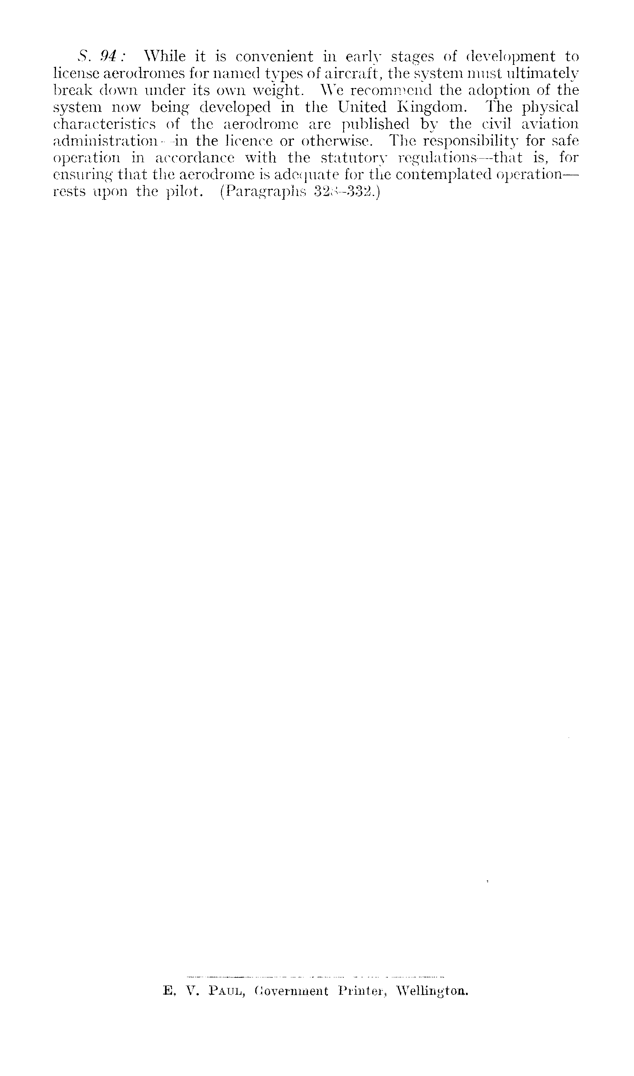 S. 94: While it is convenient in early stages of development to license aerodromes for named types of aircraft, the system must ultimately break down under its own weight. We recommend the adoption of the system now being developed in the United Kingdom. The physical characteristics of the aerodrome are published by the civil aviation administration —in the licence or otherwise. The responsibility for safe operation in accordance with the statutory regulations —that is, for ensuring that the aerodrome is adequate for the contemplated operation — rests upon the pilot. (Paragraphs 328-332.)