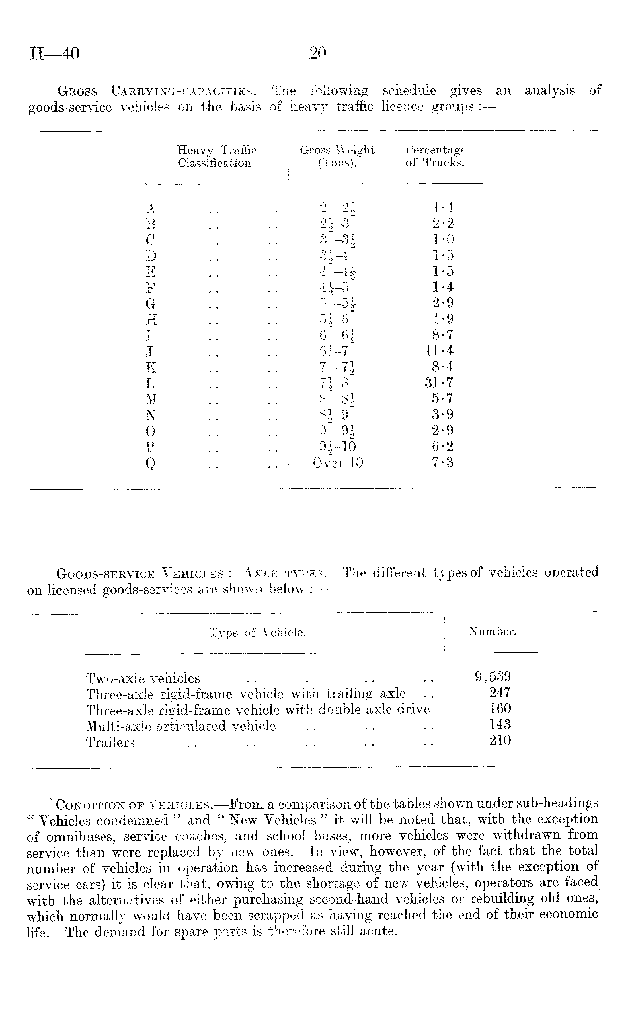 * Condition of Vehicles. —From a comparison of the tables shown under sub-headings " Vehicles condemned " and "New Vehicles " it will be noted that, with the exception of omnibuses, service coaches, and school buses, more vehicles were withdrawn from service than were replaced by new ones. In view, however, of the fact that the total number of vehicles in operation has increased during the year (with the exception of service cars) it is clear that, owing to the shortage of new vehicles, operators are faced with the alternatives of either purchasing second-hand vehicles or rebuilding old ones, which normally would have been scrapped as having reached the end of their economic life. The demand for spare parts is therefore still acute.