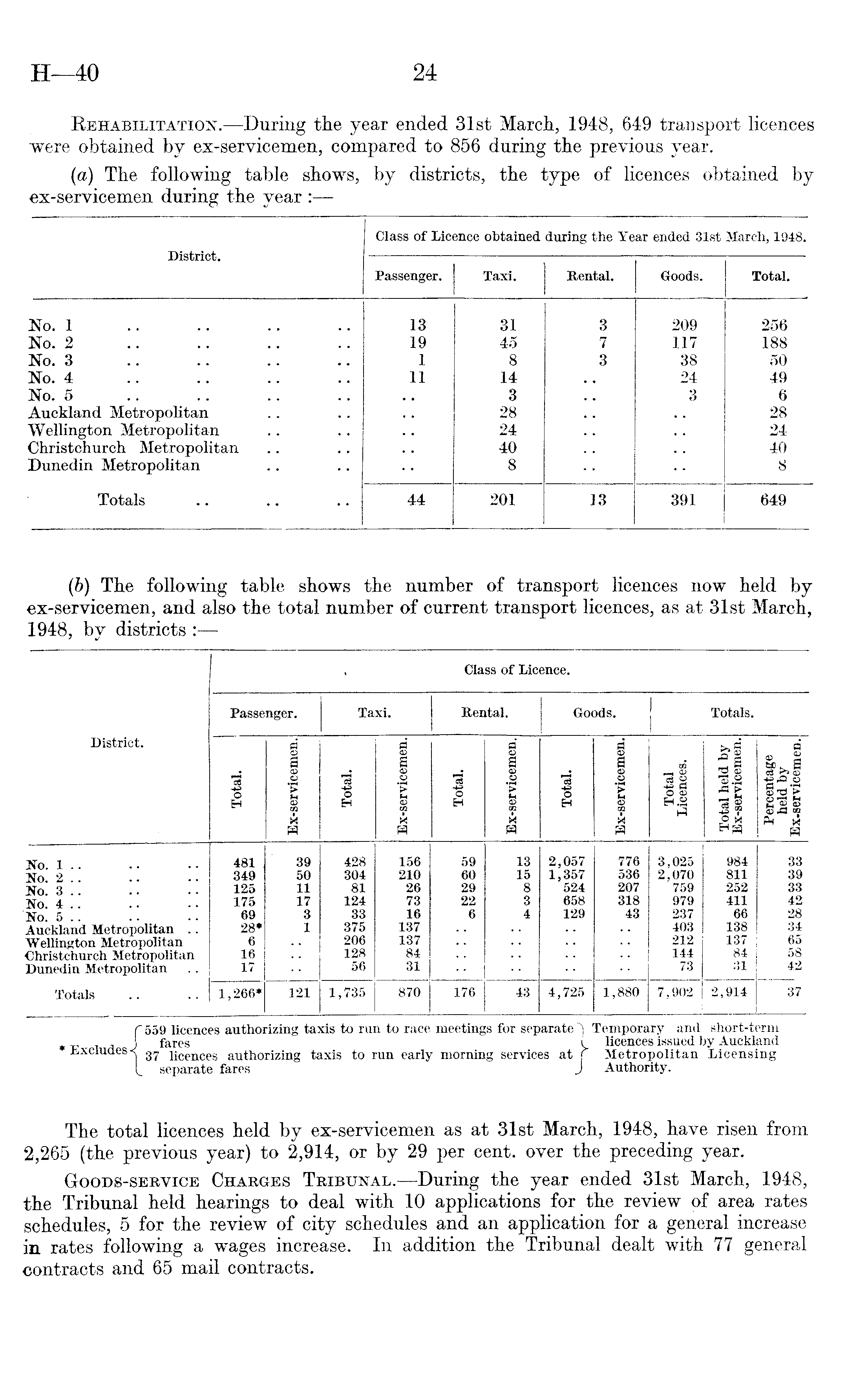 f 559 licences authorizing taxis to run to race meetings for separate "j Temporary and short-term J fares i licences issued by Auckland excludes 37 licences authorizing taxis to run early morning services at [ Metropolitan Licensing L separate fares J Authority. The total licences held by ex-servicemen as at 31st March, 1948, have risen from 2,265 (the previous year) to 2,914, or by 29 per cent, over the preceding year. Goods-service Charges Tribunal.—During the year ended 31st March, 1948, the Tribunal held hearings to deal with 10 applications for the review of area rates schedules, 5 for the review of city schedules and an application for a general increase in rates following a wages increase. In addition the Tribunal dealt with 77 general contracts and 65 mail contracts.