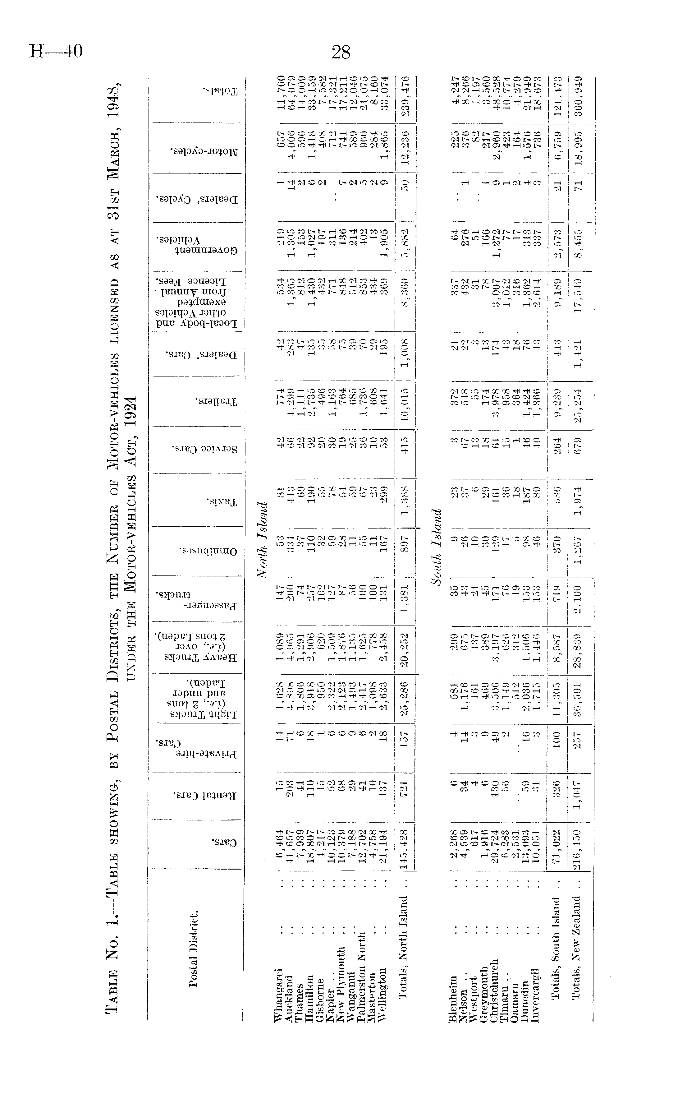 Postal District. Cars. Rental Cars. Private-hire Cars. Light Trucks (i.e., 2 tons and under Laden). Heavy Trucks (i.e., over 2 tons Laden). Passengertrucks. Omnibuses. Taxis. Service Cars. 0 £ 5 Dealers' Cars. Local-body and other Vehicles exempted from Annual Licence Pees. Government Vehicles. Dealers' Cycles. Motor-cycles. Totals. Whangarei Auckland Thames Hamilton Gisborne Napier New Plymouth Wanganui Palmerston North Masterton "Wellington Totals, North Island .. Blenheim Nelson Westport Greymouth Christchurch Timaru Oamaru' Dunedin Invercargil Totals, South Island .. Totals, New Zealand .. 6,464 41,657 7,939 18,807 4,217 10,123 10,379 7,188 12,702 4,758 21,194 15 203 41 110 15 52 68 29 41 10 137 14 71 6 18 1 6 6 9 6 2 18 1,628 4,898 1,806 3,918 950 2,322 2,123 1,493 2,417 1,098 2,633 1,089 4,965 1,291 2,906 620 1,509 1,876 1,135 1,625 778 2,458 147 200 74 257 102 127 87 56 100 100 131 North li 53 334 37 110 32 59 28 11 55 11 167 'land 81 413 69 190 55 78 54 59 67 23 299 42 66 22 92 20 30 19 25 36 10 53 774 4,299 1,114 2.735 496 1,163 764 685 1.736 608 1,641 42 283 47 135 35 58 75 39 70 29 195 534 1,365 812 1,430 432 771 848 512 853 434 369 219 1,305 153 1,027 197 311 136 214 402 13 1,905 1 14 2 6 2 7 2 5 2 9 657 4,006 596 1,418 408 712 741 589 960 284 1,865 11,760 64,079 14,009 33,159 7,582 17,321 17,211 12,046 21,075 8,160 33,074 145,428 721 157 25,286 20,252 1,381 897 1,388 415 16,015 1,008 8,360 5,882 50 12,236 239,476 2,268 4,539 617 1,916 29,724 6,283 2,531 13,093 10,051 6 34 4 6 130 56 ' 59 31 4 14 3 9 49 2 ' 16 3 581 1,176 161 469 3,506 1,149 512 2,036 1,715 299 675 137 389 3,197 626 312 1,506 1,446 S 35 43 24 45 171 76 19 153 153 OUtll Islt 9 26 10 30 129 17 5 98 46 %nd 23 37 6 29 161 36 18 187 89 3 67 13 18 61 15 1 46 40 372 548 55 174 3,978 958 364 1,424 1,366 21 22 3 13 174 43 18 76 43 337 432 31 78 3,007 1,012 316 1,362 2,614 9,189 64 276 51 166 1,272 77 17 313 337 1 1 9 1 2 4 3 225 376 82 217 2,960 423 164 1,576 736 4,247 8,266 1,197 3,560 48,528 10,774 4,279 21,949 18,673 71,022 326 100 11,305 8,587 719 370 586 264 9,239 413 2,573 21 6,759 121,473 216,450 1,047 257 36,591 28,839 2,100 1,267 1,974 679 25,254 1,421 17,549 8,455 71 18,995 360,949