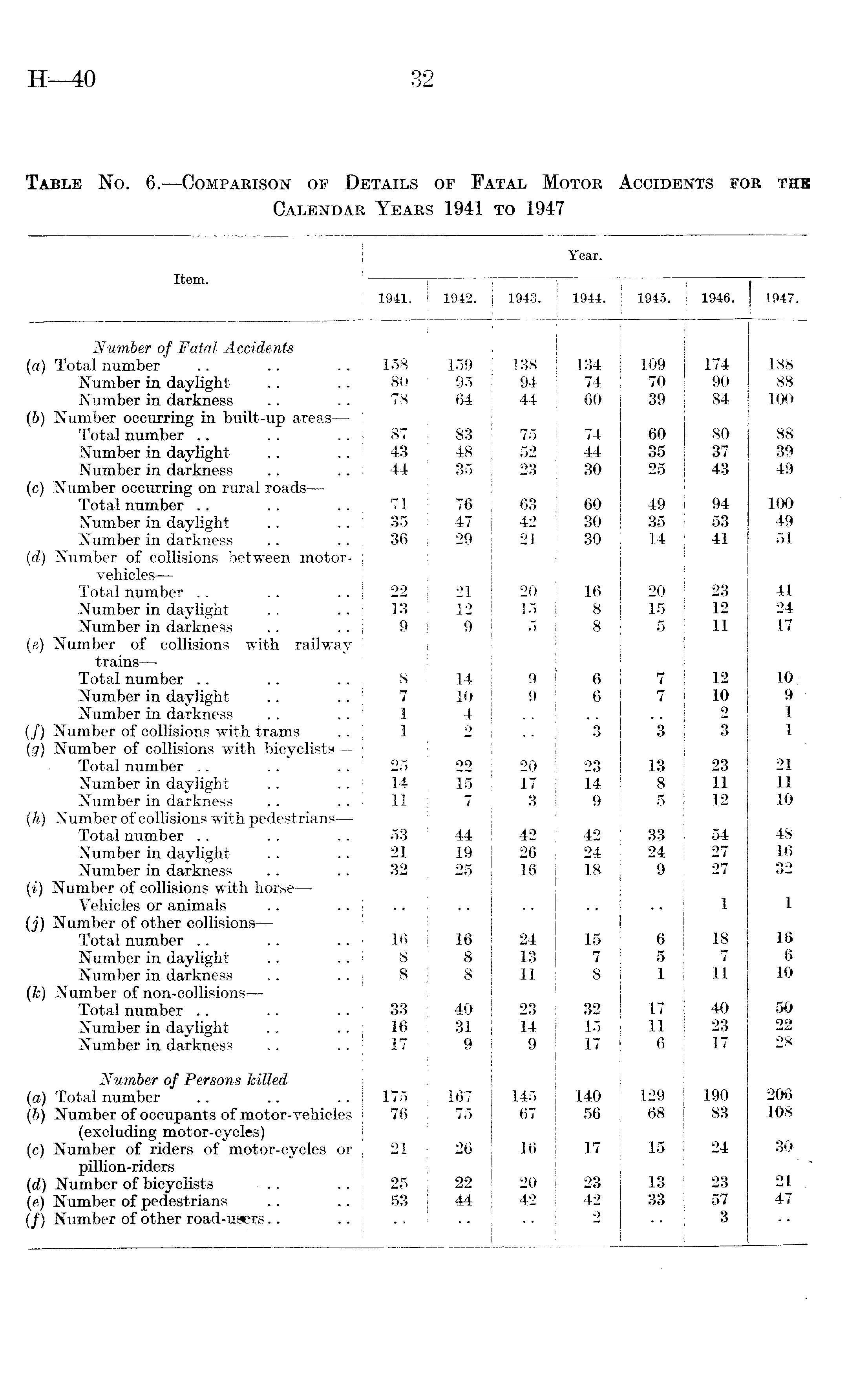 Table No. 6.—Comparison of Details of Fatal Motor Accidents for the Calendar Years 1941 to 1947