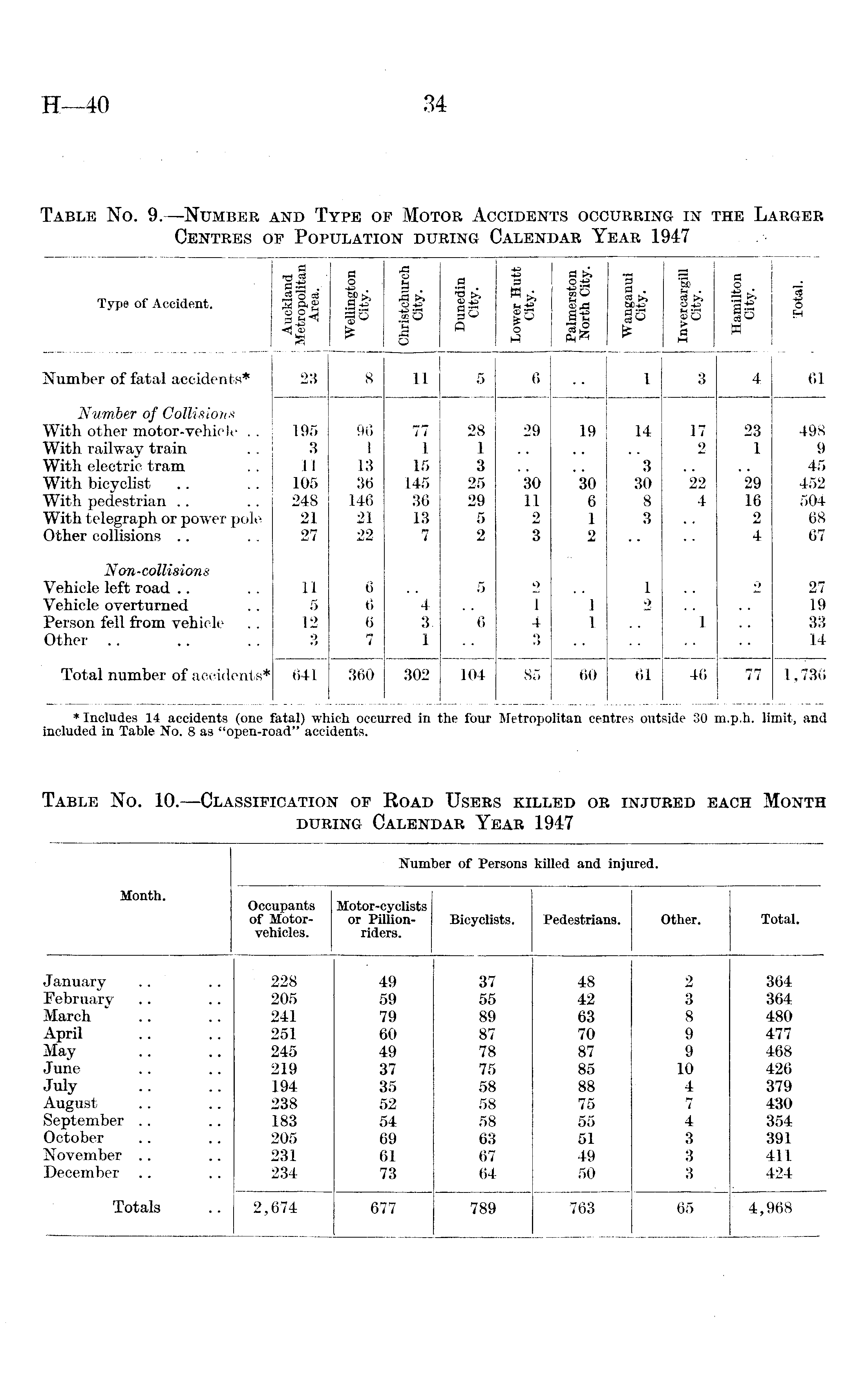 Table No. 9. —Number and Type of Motor Accidents occurring in the Larger Centres of Population during Calendar Year 1947