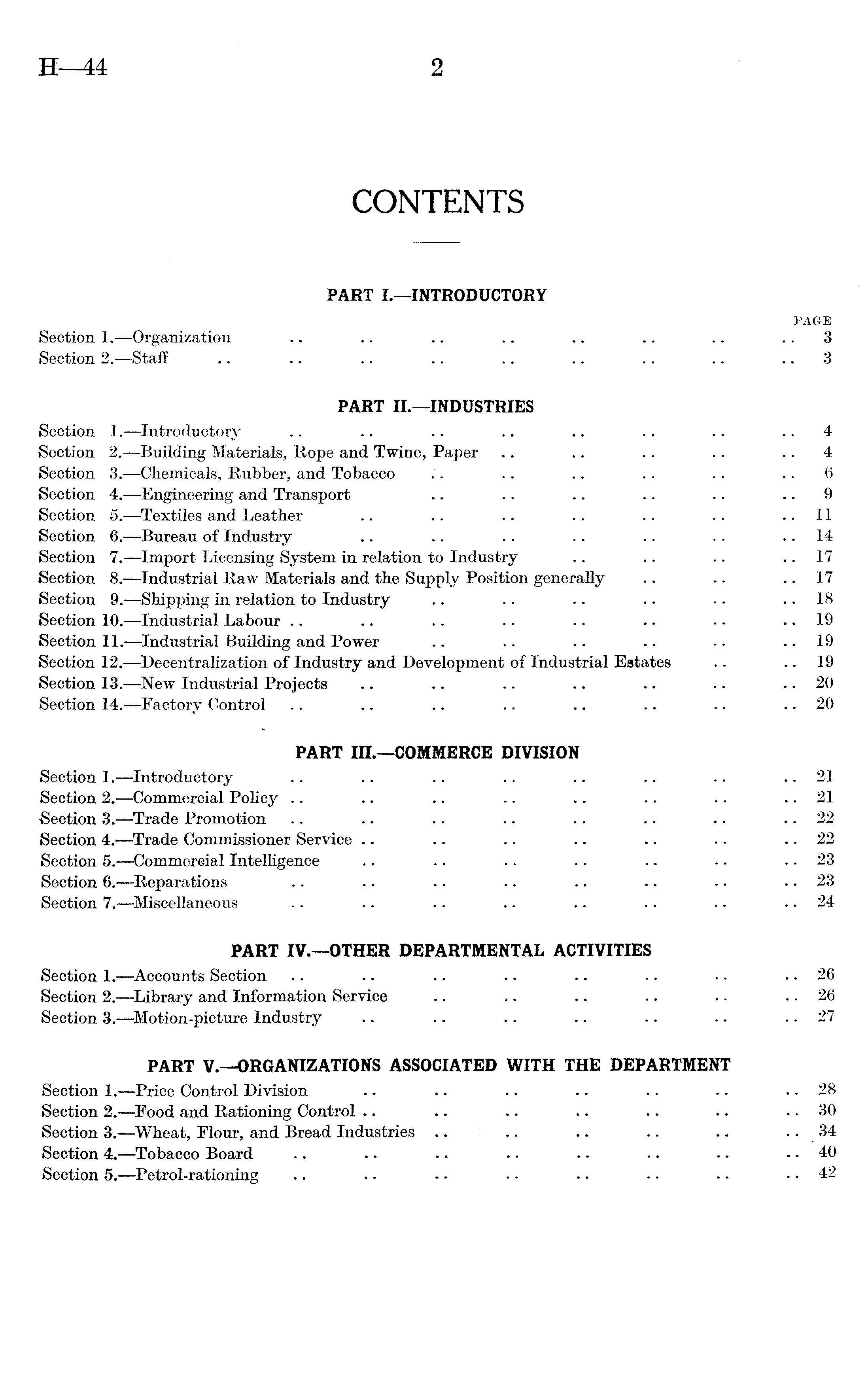 CONTENTS PART I.—INTRODUCTORY PAGE Section I.—Organization .. .. .. .. .. .. .. 3 Section 2. —Staff .. .. .. .. .. .. .. .. 3 PART lI.—INDUSTRIES Section I.—lntroductory .. .. .. .. .. .. .. 4 Section 2. —Building Materials, Rope and Twine, Paper .. .. .. .. 4 Section 3. —Chemicals, Rubber, and Tobacco .. .. .. .. .. 6 Section 4. —Engineering and Transport .. .. .. .. .. .. 9 Section 5. —Textiles and Leather .. .. .. .. .. .. 11 Section 6. —Bureau of Industry .. .. .. .. .. .. .. 14 Section 7.—lmport Licensing System in relation to Industry .. .. .. 17 Section B.—lndustrial Raw Materials and the Supply Position generally .. .. .. 17 Section 9. —Shipping in relation to Industry .. .. .. .. .. .. 18 Section 10.—Industrial Labour .. .. .. .. .. .. •• ..19 Section 11. —Industrial Building and Power .. .. .. .. .. .. 19 Section 12. —Decentralization of Industry and Development of Industrial Estates .. .. 19 Section 13. —New Industrial Projects .. .. .. .. .. .. .. 20 Section 14. —Factory Control .. .. .. .. .. .. .. .. 20 PART in.—COMMERCE DIVISION Section I.—lntroductory .. .. .. .. .. .. .. .. 21 Section 2. —Commercial Policy .. .. .. .. .. .. .. .. 21 Section 3. —Trade Promotion .. .. .. .. .. .. .. .. 22 Section 4. —Trade Commissioner Service .. .. .. .. .. .. .. 22 Section 5. —Commercial Intelligence .. .. .. .. .. .. .. 23 Section 6. —Reparations .. .. .. .. .. .. .. .. 23 Section 7. —Miscellaneous .. .. .. .. .. .. ..... 24 PART IV.—OTHER DEPARTMENTAL ACTIVITIES Section 1. —Accounts Section .. .. .. .. .. .. .. .. 26 Section 2. —Library and Information Service .. .. .. .. .. .. 26 Section 3. —Motion-picture Industry .. .. .. .. .. .. .. 27 PART V.—ORGANIZATIONS ASSOCIATED WITH THE DEPARTMENT Section 1. —Price Control Division .. .. .. .. .. .. .. 28 Section 2. —Food and Rationing Control .. .. .. .. .. .. .. 30 Section 3. —Wheat, Flour, and Bread Industries .. .. .. .. .. .. 34 Section 4. —Tobacco Board .. .. .. .. .. .. .. .. 40 Section 5. —Petrol-rationing .. .. .. • • .. .. •. .. 42