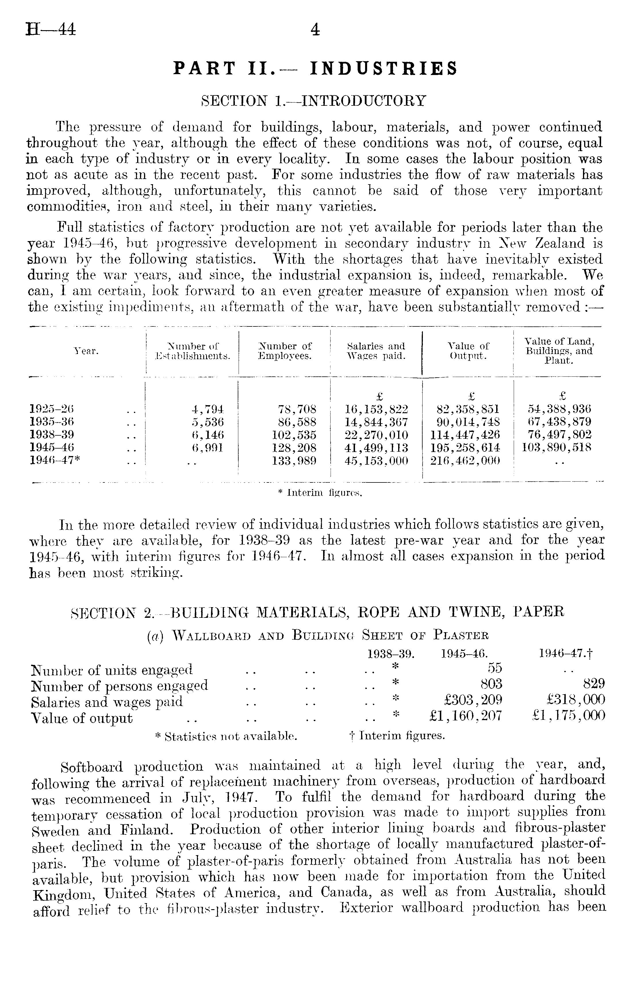 In the more detailed review of individual industries which follows statistics are given, where they are available, for 1938-39 as the latest pre-war year and for the year 1945-46, with interim figures for 1946-47. In almost all cases expansion in the period has been most striking. SECTION 2.—BUILDING MATERIALS, ROPE AND TWINE, PAPER (a) Wallboard and Building Sheet of Plaster 1938-39. 1945-46. 1946-47.f Number of units engaged .. .. .. * 55 Number of persons engaged .. .. * 803 829 Salaries and wages paid .. .. * £303,209 £318,000 Value of output * £1,160,207 £1,175,000 * Statistics not available. f Interim figures. Softboard production was maintained at a high level during the year, and, following the arrival of replacement machinery from overseas, production of hardboard was recommenced in July, 1947. To fulfil the demand for hardboard during the temporary cessation of local production provision was made to import supplies from Sweden and Finland. Production of other interior lining boards and fibrous-plaster sheet declined in the year because of the shortage of locally manufactured plaster-of-paris. The volume of plaster-of-paris formerly obtained from Australia has not been available, but provision which has now been made for importation from the United Kingdom, United States of America, and Canada, as well as from Australia, should afford relief to the fibrous-plaster industry. Exterior wallboard production has been