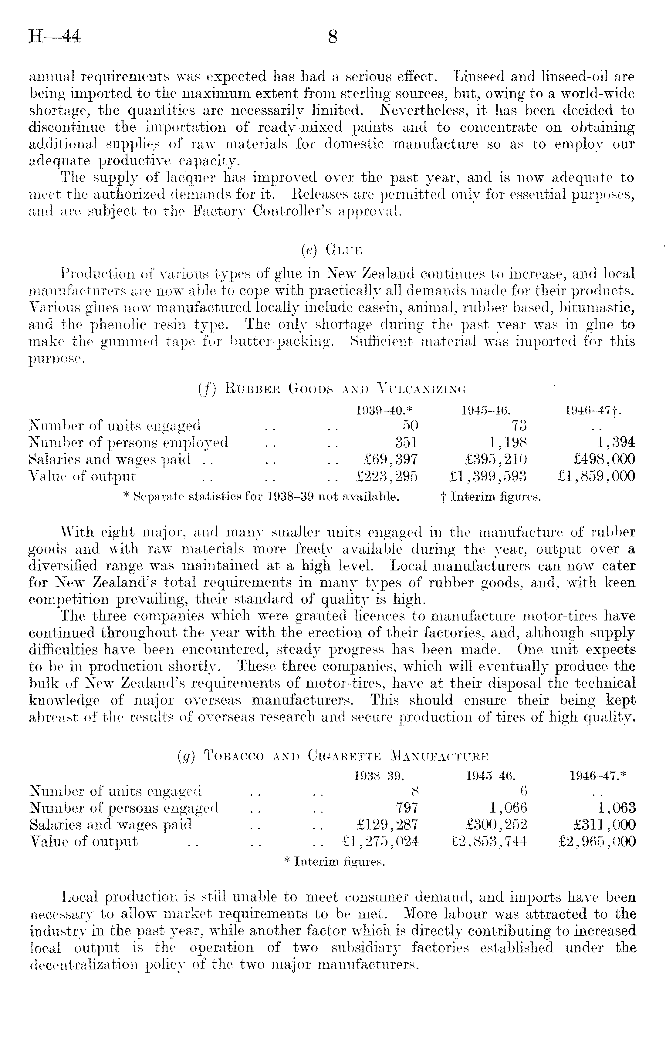 annual requirements was expected lias had a serious effect. Linseed and linseed-oil are being imported to the maximum extent from sterling sources, but, owing to a world-wide shortage, the quantities are necessarily limited. Nevertheless, it has been decided to discontinue the importation of ready-mixed paints and to concentrate on obtaining additional supplier of raw materials for domestic manufacture so as to employ our adequate productive capacity. The supply of lacquer has improved over the past year, and is now adequate to meet the authorized demands for it. Releases are permitted only for essential purposes, and are subject to the Factory Controller's approval. (e) Glue Production of various types of glue in New Zealand continues to increase, and local manufacturers are now able to cope with practically all demands made for their products. Various glues now manufactured locally include casein, animal, rubber based, bitumastic, and the phenolic resin type. The only shortage during the past year was in glue to make the gummed tape for butter-packing. Sufficient material was imported for this purpose. (/) Rubber Goods and Vulcanizing 1939-40.* 1945-46. 1946-47f. Number of units engaged .. .. 50 73 Number of persons employed .. .. 351 1,198 1,394 Salaries and wages paid .. .. .. £69,397 £395,210 £498,000 Value of output .. .. .. £223,295 £1,399,593 £1,859,000 * Separate statistics for 1938-39 not available. f Interim figures. With eight major, and many smaller units engaged in the manufacture of rubber goods and with raw materials more freely available during the year, output over a diversified range was maintained at a high level. Local manufacturers can now cater for New Zealand's total requirements in many types of rubber goods, and, with keen competition prevailing,, their standard of quality is high. The three companies which were granted licences to manufacture motor-tires have continued throughout the year with the erection of their factories, and, although supply difficulties have been encountered, steady progress has been made. One unit expects to be in production shortly. These three companies, which will eventually produce the bulk of New Zealand's requirements of motor-tires, have at their disposal the technical knowledge of major overseas manufacturers. This should ensure their being kept abreast of the results of overseas research and secure production of tires of high quality. (g) Tobacco and Cigarette Manufacture 1938-39. 1945-46. 1946-47.* Number of units engaged .. .. 8 6 Number of persons engaged .. .. 797 1,066 1,063 Salaries and wages paid .. .. £129,287 £300,252 £311,000 Value of output .. .. .. £1,275,024 £2,853,744 £2,965,000 * Interim figures. Local production is still unable to meet consumer demand, and imports have been necessary to allow market requirements to be met. More labour was attracted to the industry in the past year, while another factor which is directly contributing to increased local output is the operation of two subsidiary factories established under the decentralization policy of the two major manufacturers.