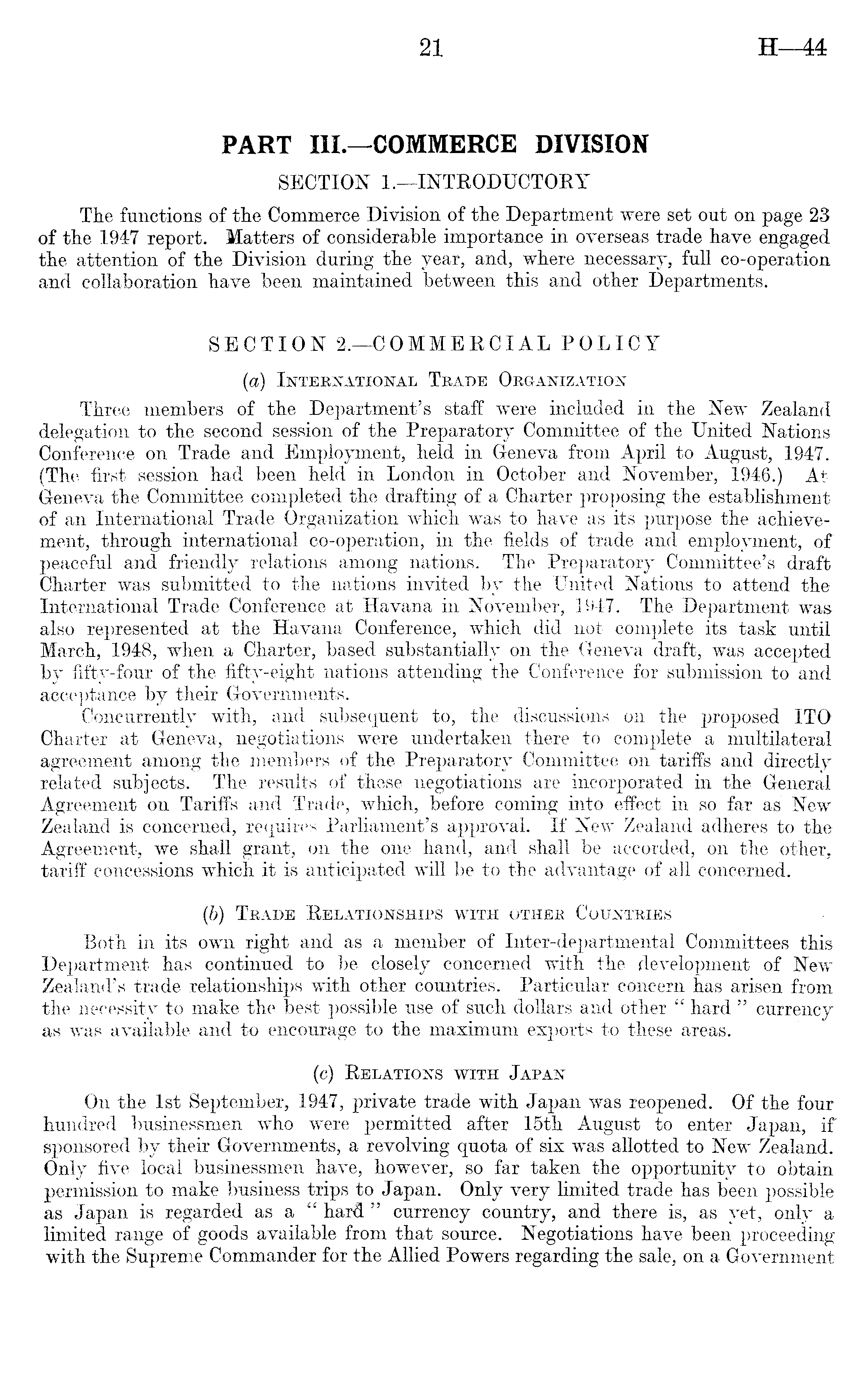 PART lII.—COMMERCE DIVISION SECTION I.—INTBODUCTOBY The functions of the Commerce Division of the Department were set out on page 23 of the 1947 report. Matters of considerable importance in overseas trade have engaged the attention of the Division during the year, and, where necessary, full co-operation and collaboration have been maintained between this and other Departments. SECTION 2.—COMMERCIAL POLICY (a) International Trade Organization Three members of the Department's staff were included in the New Zealand delegation to the second session of the Preparatory Committee of the United Nations Conference on Trade and Employment, held in Geneva from April to August, 1947. (The first session had been held in London in October and November, 1946.) At Geneva the Committee completed the drafting of a Charter proposing the establishment of an International Trade Organization which was to have as its purpose the achievement, through international co-operation, in the fields of trade and employment, of peaceful and friendly relations among nations. The Preparatory Committee's draft Charter was submitted to the nations invited by the United Nations to attend the International Trade Conference at Havana in November, 1947. The Department was also represented at the Havana Conference, which did not complete its task until March, 1948, when a Charter, based substantially on the Geneva draft, was accepted by fifty-four of the fifty-eight nations attending the Conference for submission to and acceptance by their Governments. Concurrently with, and subsequent to, the discussions on the proposed ITO Charter at Geneva, negotiations were undertaken there to complete a multilateral agreement among the members of the Preparatory Committee on tariffs and directly related subjects. The results of these negotiations are incorporated in the General Agreement on Tariffs and Trade, which, before coming into effect in so far as New Zealand is concerned, requires Parliament's approval. If New Zealand adheres to the Agreement, we shall grant, on the one hand, and shall be accorded, on the other, tariff concessions which it is anticipated will be to the advantage of all concerned. (b) Trade Relationships with other Countries Both in its own right and as a member of Inter-departmental Committees this Department has continued to be closely concerned with the development of New Zealand's trade relationships with other countries. Particular concern has arisen from the necessity to make the best possible use of such dollars and other " hard " currency as was available and to encourage to the maximum exports to these areas. (c) Belations with Japan On the Ist September, 1947, private trade with Japan was reopened. Of the four hundred businessmen who were permitted after 15th August to enter Japan, if sponsored by their Governments, a revolving quota of six was allotted to New Zealand. Only five local businessmen have, however, so far taken the opportunity to obtain permission to make business trips to Japan. Only very limited trade has been possible as Japan is regarded as a " hard " currency country, and there is, as yet, only a limited range of goods available from that source. Negotiations have been proceeding with the Supreme Commander for the Allied Powers regarding the sale, on a Government