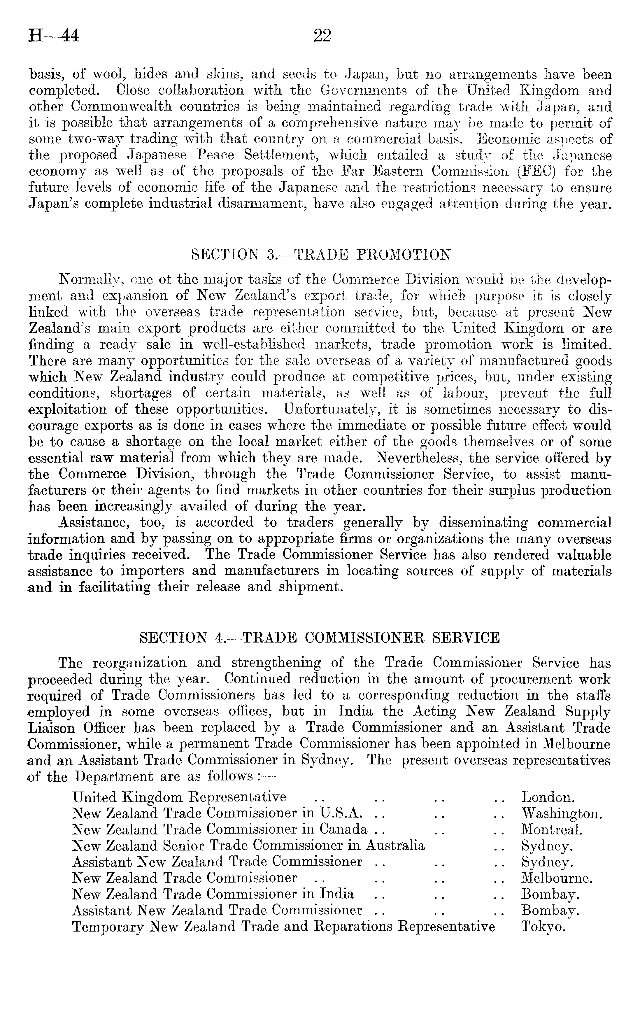 basis, of wool, hides and skins, and seeds to Japan, but no arrangements have been completed. Close collaboration with the Governments of the United Kingdom and other Commonwealth countries is being maintained regarding trade with Japan, and it is possible that arrangements of a comprehensive nature may be made to permit of some two-way trading with that country on a commercial basis. Economic aspects of the proposed Japanese Peace Settlement, which entailed a study of the Japanese economy as well as of the proposals of the Far Eastern Commission (FEC) for the future levels of economic life of the Japanese and the restrictions necessary to ensure Japan's complete industrial disarmament, have also engaged attention during the year. SECTION 3.—TRADE PROMOTION Normally, one ot the major tasks of the Commerce Division would be the development and expansion of New Zealand's export trade, for which purpose it is closely linked with the overseas trade representation service, but, because at present New Zealand's main export products are either committed to the United Kingdom or are finding a ready sale in well-established markets, trade promotion work is limited. There are many opportunities for the sale overseas of a variety of manufactured goods which New Zealand industry could produce at competitive prices, but, under existing conditions, shortages of certain materials, as well as of labour, prevent the full exploitation of these opportunities. Unfortunately, it is sometimes necessary to discourage exports as is done in cases where the immediate or possible future effect would be to cause a shortage on the local market either of the goods themselves or of some essential raw material from which they are made. Nevertheless, the service offered by the Commerce Division, through the Trade Commissioner Service, to assist manufacturers or their agents to find markets in other countries for their surplus production has been increasingly availed of during the year. Assistance, too, is accorded to traders generally by disseminating commercial information and by passing on to appropriate firms or organizations the many overseas trade inquiries received. The Trade Commissioner Service has also rendered valuable assistance to importers and manufacturers in locating sources of supply of materials and in facilitating their release and shipment. SECTION 4.—TRADE COMMISSIONER SERVICE The reorganization and strengthening of the Trade Commissioner Service has proceeded during the year. Continued reduction in the amount of procurement work required of Trade Commissioners has led to a corresponding reduction in the staffs employed in some overseas offices, but in India the Acting New Zealand Supply Liaison Officer has been replaced by a Trade Commissioner and an Assistant Trade Commissioner, while a permanent Trade Commissioner has been appointed in Melbourne and an Assistant Trade Commissioner in Sydney. The present overseas representatives of the Department are as follows : United Kingdom Representative .. .. .. .. London. New Zealand Trade Commissioner in U.S.A. .. .. .. Washington. New Zealand Trade Commissioner in Canada .. .. .. Montreal. New Zealand Senior Trade Commissioner in Australia .. Sydney. Assistant New Zealand Trade Commissioner .. .. .. Sydney. New Zealand Trade Commissioner .. .. .. .. Melbourne. New Zealand Trade Commissioner in India .. .. .. Bombay. Assistant New Zealand Trade Commissioner .. .. .. Bombay. Temporary New Zealand Trade and Reparations Representative Tokyo.