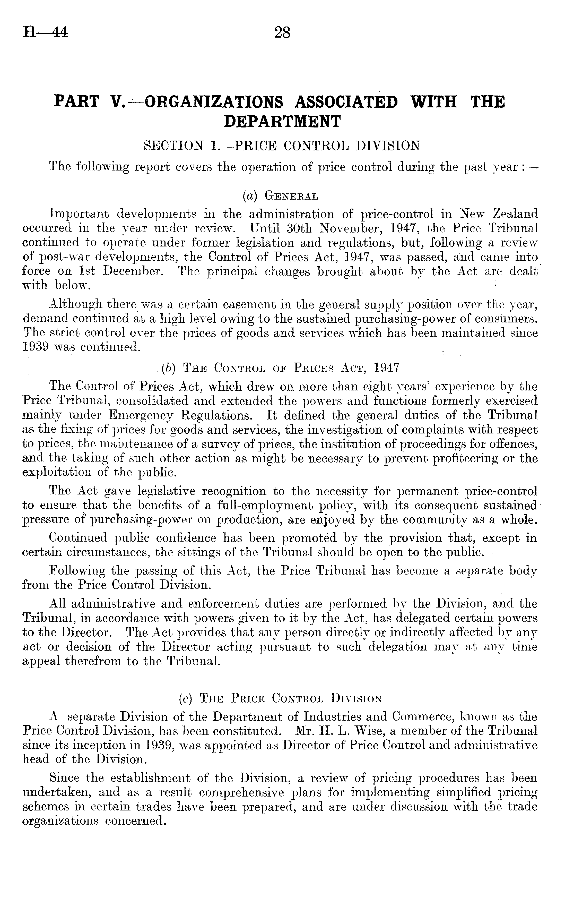 PART V.—ORGANIZATIONS ASSOCIATED WITH THE DEPARTMENT SECTION I.—PRICE CONTROL DIVISION The following report covers the operation of price control during the past year : (a) General Important developments in the administration of price-control in New Zealand occurred in the year under review. Until 30th November, 1947, the Price Tribunal continued to operate under former legislation and regulations, but, following a review of post-war developments, the Control of Prices Act, 1947, was passed, and came into force on Ist December. The principal changes brought about by the Act are dealt with below. : Although there was a certain easement in the general supply position over the year, demand continued at a high level owing to the sustained purchasing-power of consumers. The strict control over the prices of goods and services which has been maintained since 1939 was continued. . (b.) The Control of Prices Act, 1947 The Control of Prices Act, which drew on more than eight years' experience by the Price Tribunal, consolidated and extended the powers and functions formerly exercised mainly under Emergency Regulations. It defined the general duties of the Tribunal as the fixing of prices for goods and services, the investigation of complaints with respect to prices, the maintenance of a survey of prices, the institution of proceedings for offences, and the taking of such other action as might be necessary to prevent profiteering or the exploitation of the public. The Act gave legislative recognition to the necessity for permanent price-control to ensure that the benefits of a full-employment policy, with its consequent sustained pressure of purchasing-power on production, are enjoyed by the community as a whole. Continued public confidence has been promoted by the provision that, except in certain circumstances, the sittings of the Tribunal should be open to the public. Following the passing of this Act, the Price Tribunal has become a separate body from the Price Control Division. All administrative and enforcement duties are performed by the Division, and the Tribunal, in accordance with powers given to it by the Act, has delegated certain powers to the Director. The Act provides that any person directly or indirectly affected by any act or decision of the Director acting pursuant to such delegation may at any time appeal therefrom to the Tribunal. (c) The Price Control Division A separate Division of the Department of Industries and Commerce, known as the Price Control Division, has been constituted. Mr. H. L. Wise, a member of the Tribunal since its inception in 1939, was appointed as Director of Price Control and administrative head of the Division. Since the establishment of the Division, a review of pricing procedures has been undertaken, and as a result comprehensive plans for implementing simplified pricing schemes in certain trades have been prepared, and are under discussion with the trade organizations concerned.
