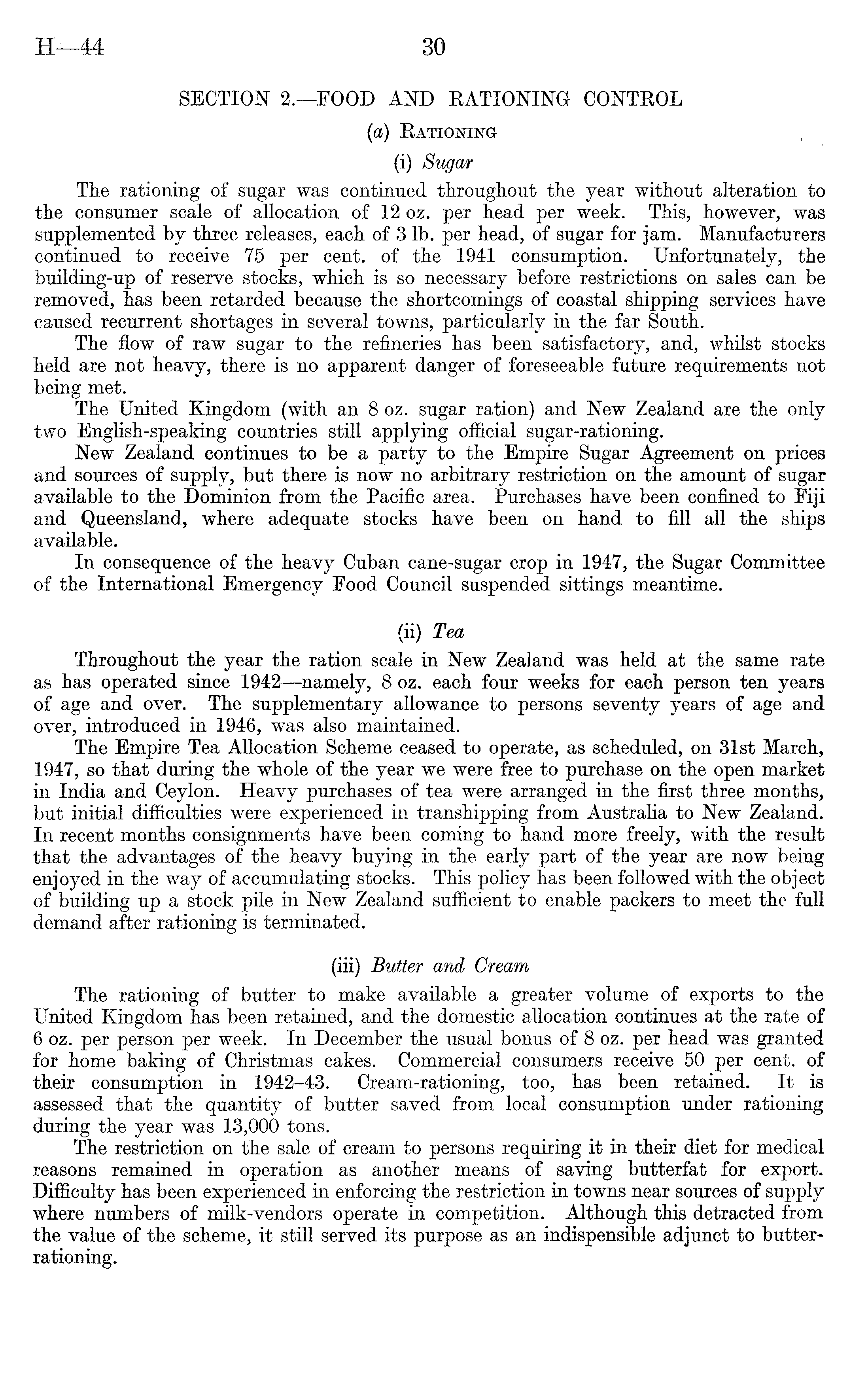 SECTION 2.—FOOD AND RATIONING CONTROL (a) Rationing (i) Sugar The rationing of sugar was continued throughout the year without alteration to the consumer scale of allocation of 12 oz. per head per week. This, however, was supplemented by three releases, each of 3 lb. per head, of sugar for jam. Manufacturers continued to receive 75 per cent, of the 1941 consumption. Unfortunately, the building-up of reserve stocks, which is so necessary before restrictions on sales can be removed, has been retarded because the shortcomings of coastal shipping services have caused recurrent shortages in several towns, particularly in the far South. The flow of raw sugar to the refineries has been satisfactory, and, whilst stocks held are not heavy, there is no apparent danger of foreseeable future requirements not being met. The United Kingdom (with an 8 oz. sugar ration) and New Zealand are the only two English-speaking countries still applying official sugar-rationing. New Zealand continues to be a party to the Empire Sugar Agreement on prices and sources of supply, but there is now no arbitrary restriction on the amount of sugar available to the Dominion from the Pacific area. Purchases have been confined to Fiji and Queensland, where adequate stocks have been on hand to fill all the ships available. In consequence of the heavy Cuban cane-sugar crop in 1947, the Sugar Committee of the International Emergency Food Council suspended sittings meantime. (ii) Tea Throughout the year the ration scale in New Zealand was held at the same rate as has operated since 1942 —namely, 8 oz. each four weeks for each person ten years of age and over. The supplementary allowance to persons seventy years of age and over, introduced in 1946, was also maintained. The Empire Tea Allocation Scheme ceased to operate, as scheduled, on 31st March, 1947, so that during the whole of the year we were free to purchase on the open market in India and Ceylon. Heavy purchases of tea were arranged in the first three months, but initial difficulties were experienced in transhipping from Australia to New Zealand. In recent months consignments have been coming to hand more freely, with the result that the advantages of the heavy buying in the early part of the year are now being enjoyed in the way of accumulating stocks. This policy has been followed with the object of building up a stock pile in New Zealand sufficient to enable packers to meet the full demand after rationing is terminated. (iii) Butter and Cream The rationing of butter to make available a greater volume of exports to the United Kingdom has been retained, and the domestic allocation continues at the rate of 6 oz. per person per week. In December the usual bonus of 8 oz. per head was granted for home baking of Christmas cakes. Commercial consumers receive 50 per cent, of their consumption in 1942-43. Cream-rationing, too, has been retained. It is assessed that the quantity of butter saved from local consumption under rationing during the year was 13,000 tons. The restriction on the sale of cream to persons requiring it in their diet for medical reasons remained in operation as another means of saving butterfat for export. Difficulty has been experienced in enforcing the restriction in towns near sources of supply where numbers of milk-vendors operate in competition. Although this detracted from the value of the scheme, it still served its purpose as an indispensible adjunct to butterrationing.