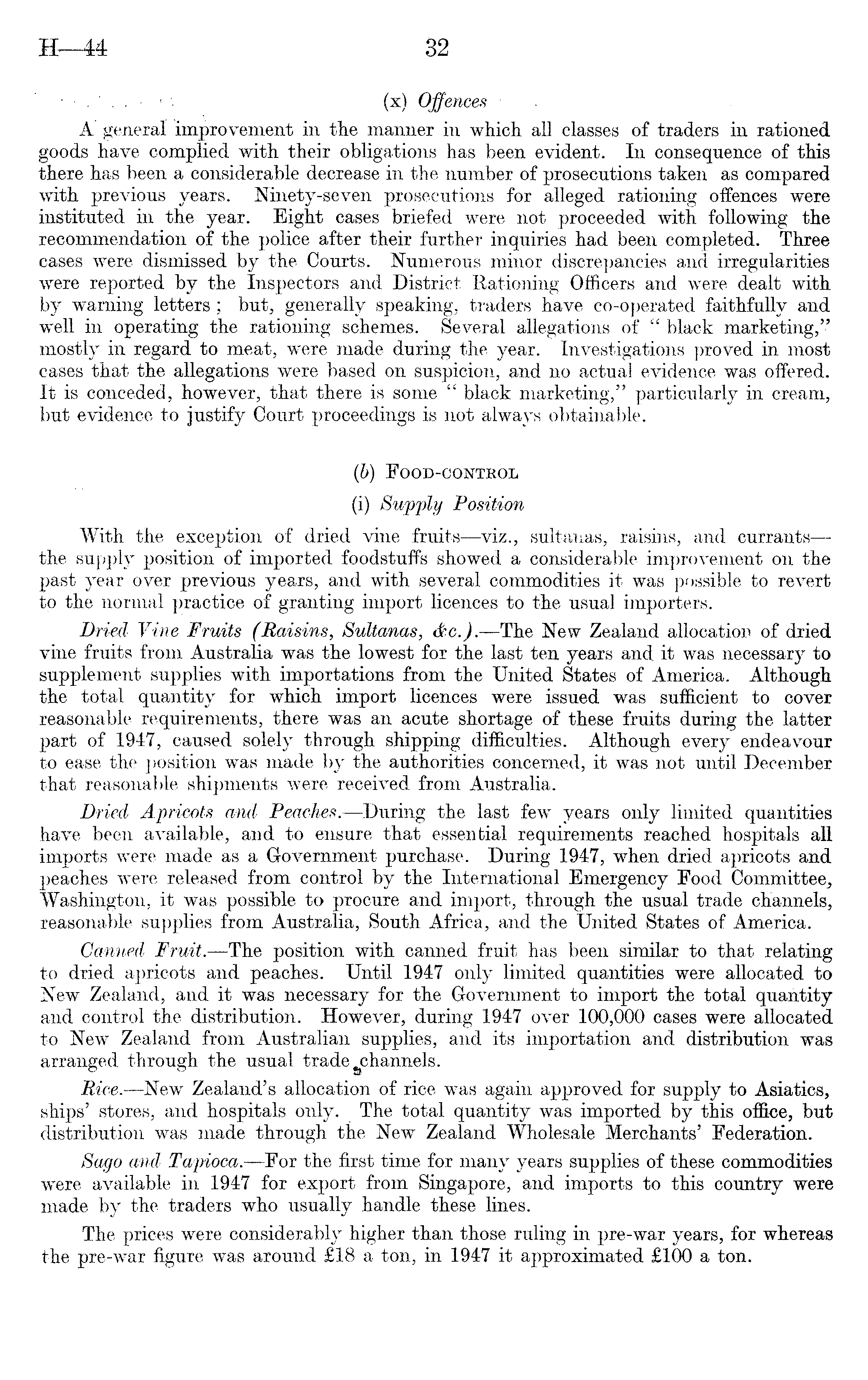 (x) Offences A general improvement in the manner in which all classes of traders in rationed goods have complied with their obligations has been evident. In consequence of this there has been a considerable decrease in the number of prosecutions taken as compared with previous years. Ninety-seven prosecutions for alleged rationing offences were instituted in the year. Eight cases briefed were not proceeded with following the recommendation of the police after their further inquiries had been completed. Three cases were dismissed by the Courts. Numerous minor discrepancies and irregularities were reported by the Inspectors and District Rationing Officers and were dealt with by warning letters ; but, generally speaking, traders have co-operated faithfully and well in operating the rationing schemes. Several allegations of " black marketing," mostly in regard to meat, were made during the year. Investigations proved in most cases that the allegations were based on suspicion, and no actual evidence was offered. It is conceded, however, that there is some " black marketing," particularly in cream, but evidence to justify Court proceedings is not always obtainable. (b) Food-control (i) Supply Position With the exception of dried vine fruits —viz., sultanas, raisins, and currants—the supply position of imported foodstuffs showed a considerable improvement on the past year over previous years, and with several commodities it was possible to revert to the normal practice of granting import licences to the usual importers. Dried Vine Fruits (Raisins, Sultanas, &c.). —The New Zealand allocation of dried vine fruits from Australia was the lowest for the last ten years and it was necessary to supplement supplies with importations from the United States of America. Although the total quantity for which import licences were issued was sufficient to cover reasonable requirements, there was an acute shortage of these fruits during the latter part of 1947, caused solely through shipping difficulties. Although every endeavour to ease the position was made by the authorities concerned, it was not until December that reasonable shipments were received from Australia. Dried Apricots and Peaches.—During the last few years only limited quantities have been available, and to ensure that essential requirements reached hospitals all imports were made as a Government purchase. During 1947, when dried apricots and peaches were released from control by the International Emergency Food Committee, Washington, it was possible to procure and import, through the usual trade channels, reasonable supplies from Australia, South Africa, and the United States of America. Canned Fruit. —The position with canned fruit has been similar to that relating to dried apricots and peaches. Until 1947 only limited quantities were allocated to New Zealand, and it was necessary for the Government to import the total quantity and control the distribution. However, during 1947 over 100,000 cases were allocated to New Zealand from Australian supplies, and its importation and distribution was arranged through the usual trade Rice.—New Zealand's allocation of rice was again approved for supply to Asiatics, ships' stores, and hospitals only. The total quantity was imported by this office, but distribution was made through the New Zealand Wholesale Merchants' Federation. Sago and Tapioca.—For the first time for many years supplies of these commodities were available in 1947 for export from Singapore, and imports to this country were made by the traders who usually handle these lines. The prices were considerably higher than those ruling in pre-war years, for whereas the pre-war figure was around £lB a ton, in 1947 it approximated £lOO a ton.