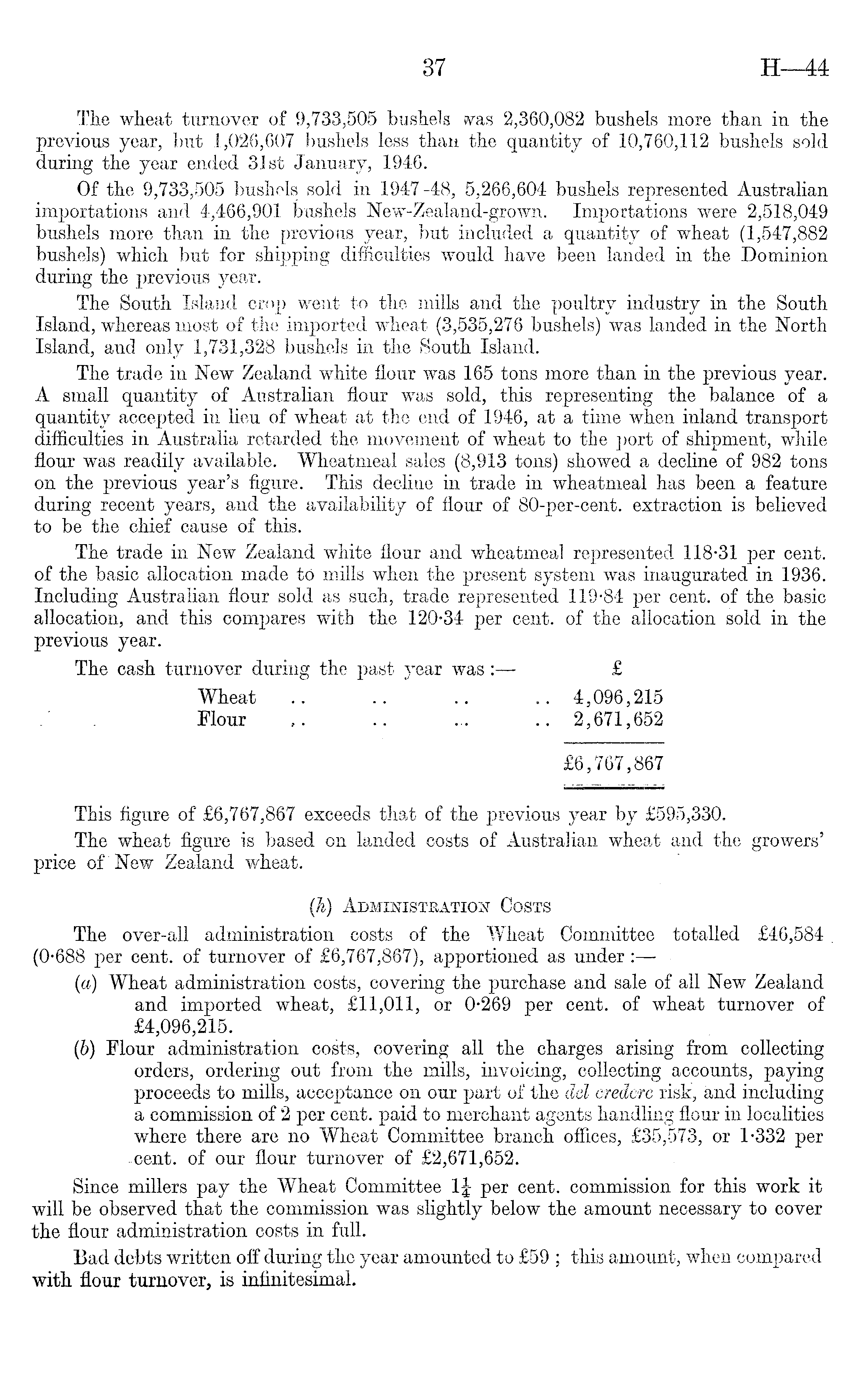 The wheat turnover of 9,733,505 bushels tvas 2,360,082 bushels more than in the previous year, but 1,026,607 bushels less than the quantity of 10,760,112 bushels sold during the year ended 31st January, 1946. Of the 9,733,505 bushels sold in 1947-48, 5,266,604 bushels represented Australian importations and 4,466,901 bushels New-Zealand-grown. Importations were 2,518,049 bushels more than in the previous year, but included a quantity of wheat (1,547,882 bushels) which but for shipping difficulties would have been landed in the Dominion during the previous year. The South Island crop went to the mills and the poultry industry in the South Island, whereas most of the imported wheat (3,535,276 bushels) was landed in the North Island, and only 1,731,328 bushels in the South Island. The trade in New Zealand white flour was 165 tons more than in the previous year. A small quantity of Australian flour was sold, this representing the balance of a quantity accepted in lieu of wheat at the end of 1946, at a time when inland transport difficulties in Australia retarded the movement of wheat to the port of shipment, while flour was readily available. Wheatmeal sales (8,913 tons) showed a decline of 982 tons on the previous year's figure. This decline in trade in wheatmeal has been a feature during recent years, and the availability of flour of 80-per-cent. extraction is believed to be the chief cause of this. The trade in New Zealand white flour and wheatmeal represented 118-31 per. cent, of the basic allocation made to mills when the present system was inaugurated in 1936. Including Australian flour sold as such, trade represented 119-84 per cent, of the basic allocation, and this compares with the 120-34 per cent, of the allocation sold in the previous year. The cash turnover during the past year was : £ Wheat .. .. .. .. 4,096,215 Flour ~ .. ... .. 2,671,652 £6,767,867 This figure of £6,767,867 exceeds that of the previous year by £595,330. The wheat figure is based on landed costs of Australian wheat and the growers' price of New Zealand wheat. (h) Administration Costs The over-all administration costs of the Wheat Committee totalled £46,584 (0-688 per cent, of turnover of £6,767,867), apportioned as under: — {a) Wheat administration costs, covering the purchase and sale of all New Zealand and imported wheat, £ll,Oll, or 0-269 per cent, of wheat turnover of £4,096,215. (b) Flour administration costs, covering all the charges arising from collecting orders, ordering out from the mills, invoicing, collecting accounts, paying proceeds to mills, acceptance on our part of the del credere risk, and including a commission of 2 per cent, paid to merchant agents handling flour in localities where there are no Wheat Committee branch offices, £35,573, or 1-332 per cent, of our flour turnover of £2,671,652. Since millers pay the Wheat Committee 1J per cent, commission for this work it will be observed that the commission was slightly below the amount necessary to cover the flour administration costs in full. Bad debts written off during the year amounted to £59 ; this amount, when compared with flour turnover, is infinitesimal.