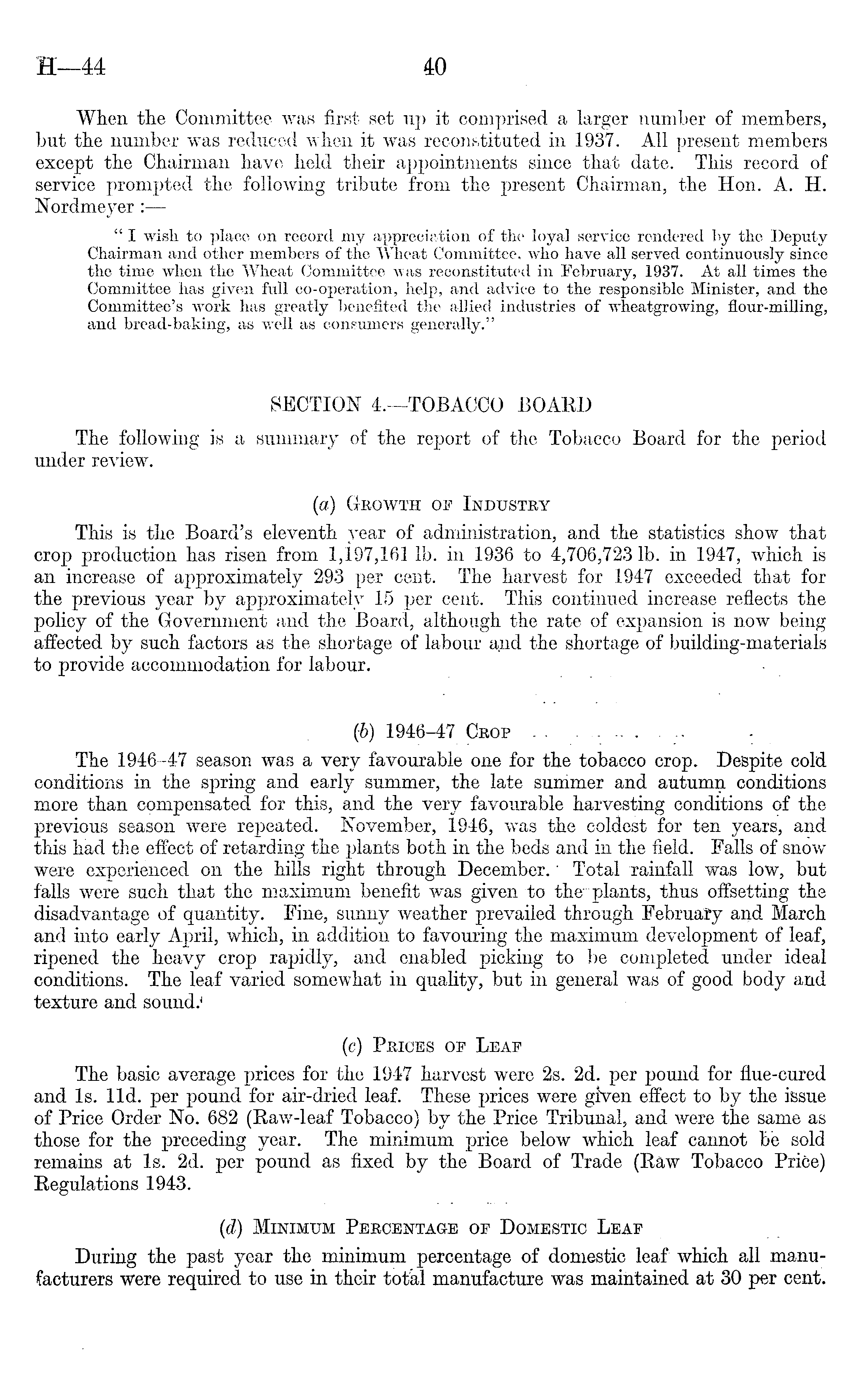 When the Committee was first set up it comprised a larger number of members, but the number was reduced when it was reconstituted in 1937. All present members except the Chairman have held their appointments since that date. This record of service prompted the following tribute from the present Chairman, the Hon. A. H. Nordmeyer: — " I wish to place on record my appreciation of the loyal service rendered by the Deputy Chairman and other members of the Wheat Committee, who have all served continuously since the time when the Wheat Committee was reconstituted in February, 1937. At all times the Committee has given full co-operation, help, and advice to the responsible Minister, and the Committee's work has greatly benefited the allied industries of wheatgrowing, flour-milling, and bread-baking, as well as consumers generally." SECTION 4.—TOBACCO BOARD The following is a summary of the report of the Tobacco Board for the period under review. (a) Growth op Industry This is the Board's eleventh year of administration, and the statistics show that crop production has risen from 1,i97,161 lb. in 1936 to 4,706,723 lb. in 1947, which is an increase of approximately 293 per cent. The harvest for 1947 exceeded that for the previous year by approximately 15 per cent. This continued increase reflects the policy of the Government and the Board, although the rate of expansion is now being affected by such factors as the shortage of labour and the shortage of building-materials to provide accommodation for labour. (•6) 1946-47 Crop . . ...... . . - The 1946 -47 season was a very favourable one for the tobacco crop. Despite cold conditions in the spring and early summer, the late summer and autumn conditions more than compensated for this, and the very favourable harvesting conditions of the previous season were repeated. November, 1946, was the coldest for. ten years, and this had the effect of retarding the plants both in the beds and in the field. Falls of snow were experienced on the hills right through December.' Total rainfall was low, but falls were such that the maximum benefit was given to the plants, thus offsetting the disadvantage of quantity. Fine, sunny weather prevailed through February and March and into early April, which, in addition to favouring the maximum development of leaf, ripened the heavy crop rapidly, and enabled picking to be completed under ideal conditions. The leaf varied somewhat in quality, but in general was of good body and texture and sound. 1 (c) Prices of Leap The basic average prices for the 1947 harvest were 2s. 2d. per pound for flue-cured and Is. lid. per pound for air-dried leaf. These prices were given effect to by the issue of Price Order No. 682 (Raw-leaf Tobacco) by the Price Tribunal, and were the same as those for the preceding year. The minimum price below which leaf cannot be sold remains at Is. 2d. per pound as fixed by the Board of Trade (Raw Tobacco Price) Regulations 1943. (d) Minimum Percentage of Domestic Leap During the past year the minimum percentage of domestic leaf which all manufacturers were required to use in their total manufacture was maintained at 30 per cent.