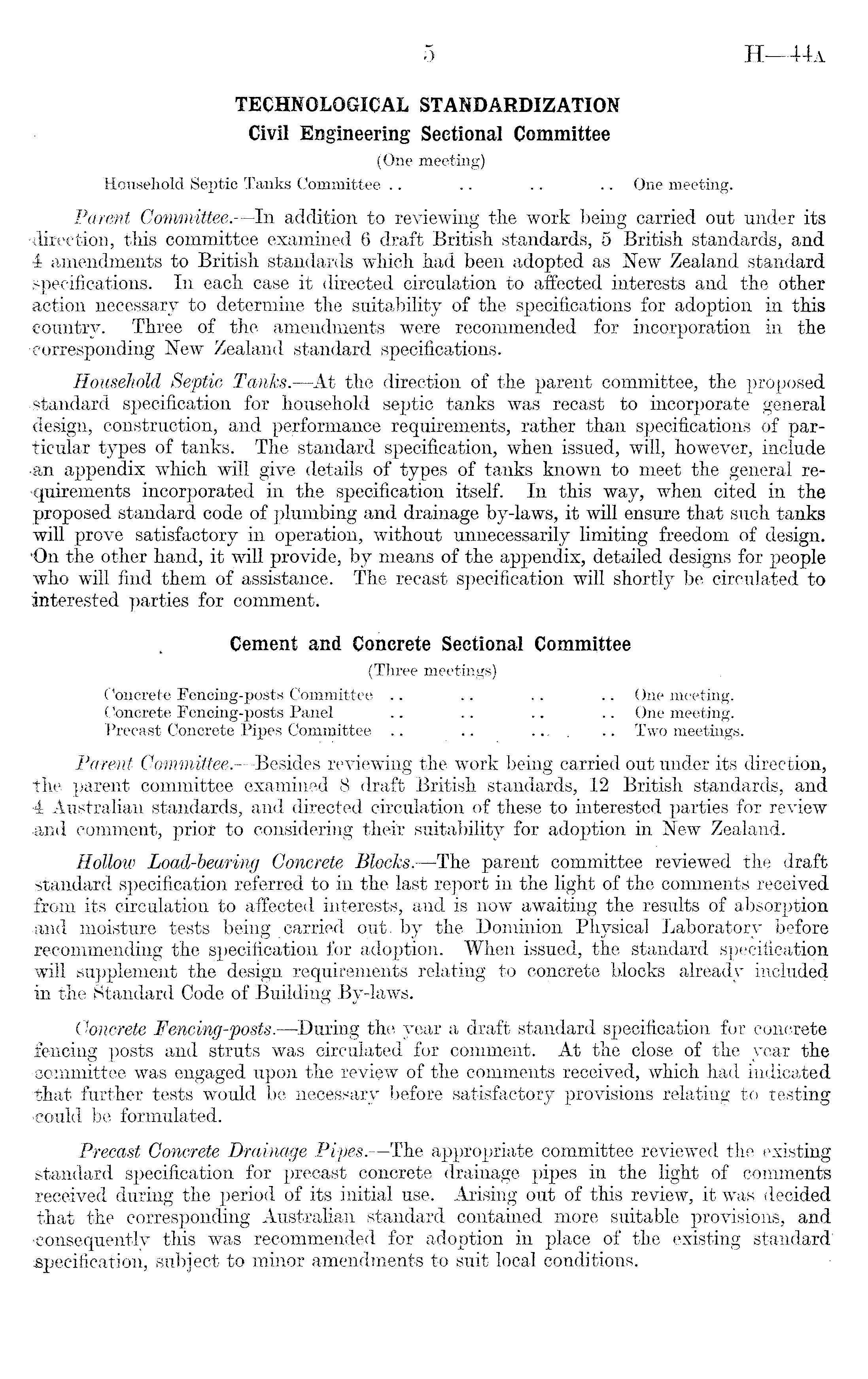 TECHNOLOGICAL STANDARDIZATION Civil Engineering Sectional Committee (One meeting) Household Septic Tanks Committee .. .. .. .. One meeting. Parent Committee. —In addition to reviewing the work being carried out under its -direction, this committee examined 6 draft British, standards, 5 British standards, and 4 amendments to British standards which had been adopted as New Zealand standard specifications. In each case it directed circulation to affected interests and the other action necessary to determine the suitability of the specifications for adoption in this country. Three of the amendments were recommended for incorporation in the corresponding New Zealand standard specifications. Household Septic Tanks.—At the direction of the parent committee, the proposed standard specification for household septic tanks was recast to incorporate general design, construction, and performance requirements, rather than specifications of particular types of tanks. The standard specification, when issued, will, however, include •an appendix which will give details of types of tanks known to meet the general re•quirements incorporated in the specification itself. In this way, when cited in the proposed standard code of plumbing and drainage by-laws, it will ensure that such tanks will prove satisfactory in operation, without unnecessarily limiting freedom of design.. 'On the other hand, it will provide, by means of the appendix, detailed designs for people who will find them of assistance. The recast specification will shortly be circulated to interested parties for comment. Cement and Concrete Sectional Committee (Three meetings) Concrete Fencing-posts Committee .. .. .. .. One meeting. Concrete Fencing-posts Panel .. .. .. .. One meeting. Precast Concrete Pipes Committee .. .. .... .. Two meetings. Parent Committee.—Besides reviewing the work being carried out under its direction, the parent committee examined 8 draft British standards, 12 British standards, and 4 Australian standards, and directed circulation of these to interested parties for review •and comment, prior to considering their suitability for adoption in New Zealand. Hollow Load-bearing Concrete Blocks.—The parent committee reviewed the draft standard specification referred to in the last report in the light of the comments received from its circulation to affected interests, and is now awaiting the results of absorption and moisture tests being carried out. by the Dominion Physical Laboratory before recommending the specification for adoption. When issued, the standard specification will supplement the design requirements relating to concrete blocks already included in the Standard Code of Building By-laws. Concrete Fencing-posts.—During the year a draft standard specification for concrete fencing .posts and struts was circulated for comment. At the close of the year the committee was engaged upon the review of the comments received, which had indicated that further tests would be necessary before satisfactory provisions relating to testing could be formulated. Precast Concrete Drainage Pipes.—The appropriate committee reviewed the existing standard specification for precast concrete drainage pipes in the light of comments received during the period of its initial use. Arising out of this review, it was decided that the corresponding Australian standard contained more suitable provisions, and •consequently this was recommended for adoption in place of the existing standard' specification, subject to minor amendments to suit local conditions.