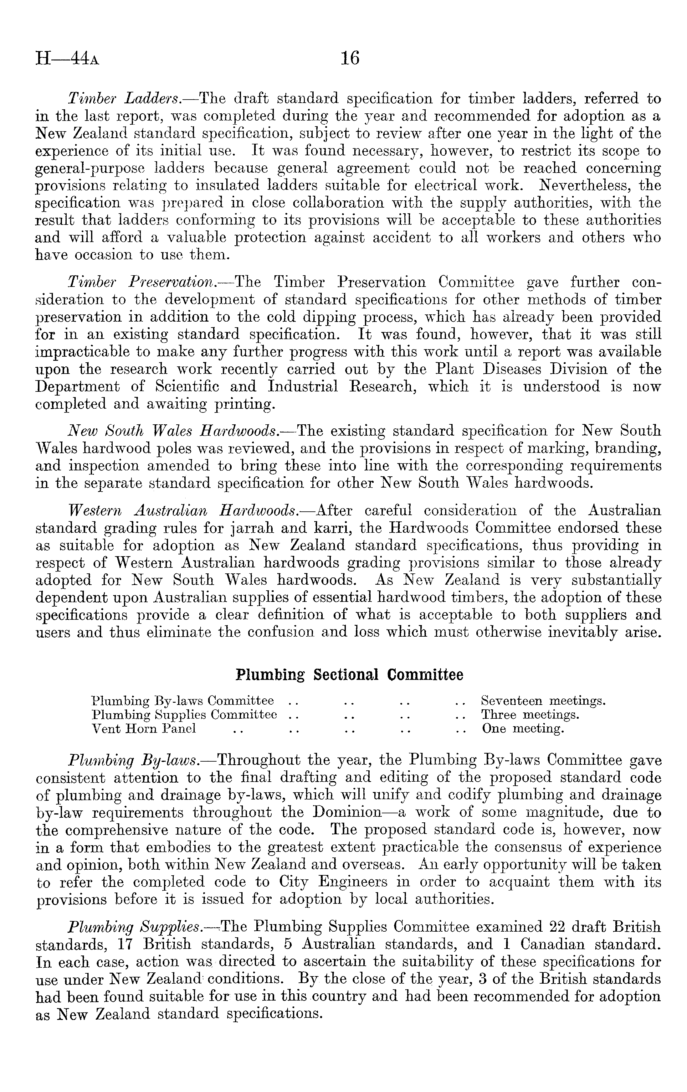 Timber Ladders. —The draft standard specification for timber ladders, referred to in the last report, was completed during, the year and recommended for adoption as a New Zealand standard specification, subject to review after one year in the light of the experience of its initial use. It was found necessary, however, to restrict its scope to general-purpose ladders because general agreement could not be reached concerning provisions relating to insulated ladders suitable for electrical work. Nevertheless, the specification was prepared in close collaboration with the supply authorities, with the result that ladders conforming to its provisions will be acceptable to these authorities and will afford a valuable protection against accident to all workers and others who have occasion to use them. Timber Preservation. —The Timber Preservation Committee gave further consideration to the development of standard specifications for other methods of timber preservation in addition to the cold dipping process, which has already been provided for in an existing standard specification. It was found, however, that it was still impracticable to make any further progress with this work until a report was available upon the research work recently carried out by the Plant Diseases Division of the Department of Scientific and Industrial Research, which it is understood is now completed and awaiting printing. New South Wales Hardwoods. —The existing standard specification for New South Wales hardwood poles was reviewed, and the provisions in respect of marking, branding, and inspection amended to bring these into line with the corresponding requirements in the separate standard specification for other New South Wales hardwoods. Western Australian Hardwoods. —After careful consideration of the Australian standard grading rules for jarrah and karri, the Hardwoods Committee endorsed these as suitable for adoption as New Zealand standard specifications, thus providing in respect of Western Australian hardwoods grading provisions similar to those already adopted for New South Wales hardwoods. As New Zealand is very substantially dependent upon Australian supplies of essential hardwood timbers, the adoption of these specifications provide a clear definition of what is acceptable to both suppliers and users and thus eliminate the confusion and loss which must otherwise inevitably arise. Plumbing Sectional Committee Plumbing By-laws Committee .. .. .. .. Seventeen meetings. Plumbing Supplies Committee .. ~ .. .. Three meetings. Vent Horn Panel .. .. .. .. .. One meeting. Plumbing By-laws.- —Throughout the year, the Plumbing By-laws Committee gave consistent attention to the final drafting and editing of the proposed standard code of plumbing and drainage by-laws, which will unify and codify plumbing and drainage by-law requirements throughout the Dominion—a work of some magnitude, due to the comprehensive nature of the code. The proposed standard code is, however, now in a form that embodies to the greatest extent practicable the consensus of experience and opinion, both within New Zealand and overseas. An early opportunity will be taken to refer the completed code to City Engineers in order to acquaint them with its provisions before it is issued for adoption by local authorities. Plumbing Supplies—The. Plumbing Supplies Committee examined 22 draft British standards, 17 British standards, 5 Australian standards, and 1 Canadian standard. In each case, action was/directed to ascertain the suitability of these specifications for use under New Zealand conditions. By the close of the year, 3of the British standards had been found suitable for- use in this country and had been recommended for adoption as New Zealand standard specifications.