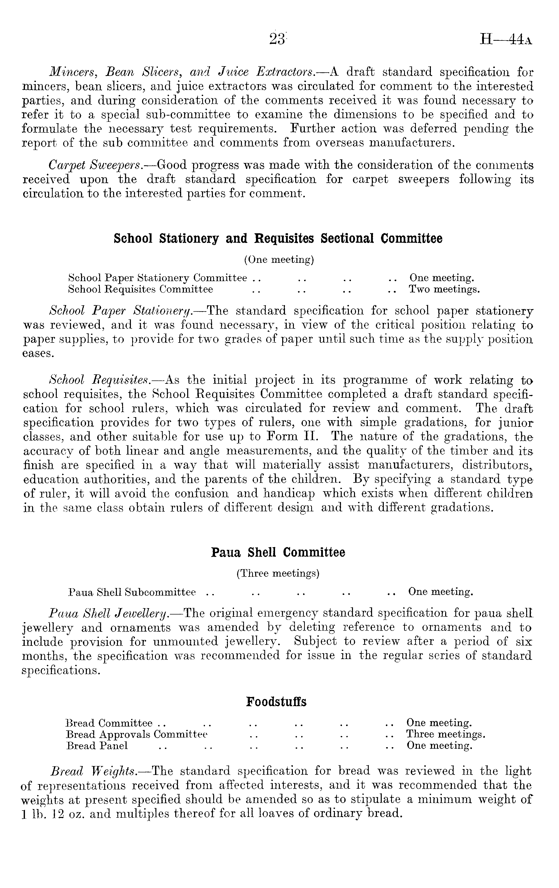 Mincers, Bean Slicers, and Juice Extractors. —A draft standard specification for mincers, bean slicers, and juice extractors was circulated for comment to tlie interested parties, and during consideration of the comments received it was found necessary to refer it to a special sub-committee to examine the dimensions to be specified and to formulate the necessary test requirements. Further action was deferred pending the report of the sub committee and comments from overseas manufacturers. Carpet Sweepers.—Good progress was made with the consideration of the comments received upon the draft standard specification for carpet sweepers following its circulation to the interested parties for comment. School Stationery and Requisites Sectional Committee (One meeting) School Paper Stationery Committee .. .. .. .. One meeting. School Requisites Committee .. .. .. .. Two meetings. School Paper Stationery. —The standard specification for school paper stationery was reviewed, and it was found necessary, in view of the critical position relating to paper supplies, to provide for two grades of paper until such time as the supply position eases. School Bequisites.—-As the initial project in its programme of work relating to school requisites, the School Requisites Committee completed a draft standard specification for school rulers, which was circulated for review and comment. The draft specification provides for two types of rulers, one with simple gradations, for junior classes, and other suitable for use up to Form 11. The nature of the gradations, the accuracy of both linear and angle measurements, and the quality of the timber and its finish are specified in a way that will materially assist manufacturers, distributors, education authorities, and the parents of the children. By specifying a standard type of ruler, it will avoid the confusion and handicap which exists when different children in the same class obtain rulers of different design and with different gradations. Paua Shell Committee (Three meetings) Paua Shell Subcommittee .. .. .. .. .. One meeting. Paua Shell Jewellery. —The original emergency standard specification for paua shell jewellery and ornaments was amended by deleting reference to ornaments and to include provision for unmounted jewellery. Subject to review after a period of six months, the specification was recommended for issue in the regular series of standard specifications. Foodstuffs Bread Committee .. .. .. .. .. .. One meeting. Bread Approvals Committee .. .. .. .. Three meetings. Bread Panel .. .. .. .. .. .. One meeting. Bread Weights.—The standard specification for bread was reviewed in the light of representations received from affected interests, and it was recommended that the weights at present specified should be amended so as to stipulate a minimum weight of 1 lb. 12 oz. and multiples thereof for all loaves of ordinary bread.