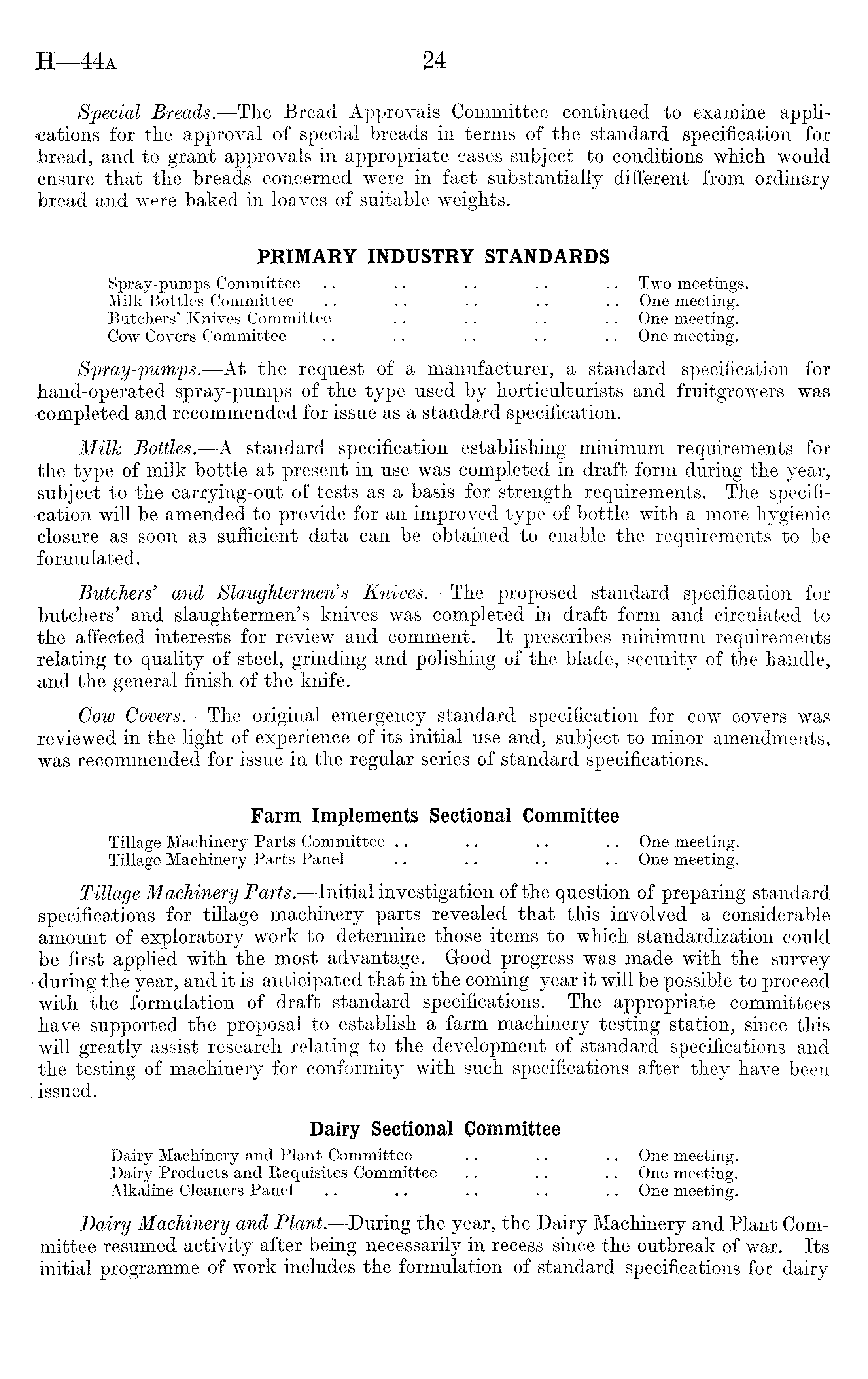 Special Breads. —The Bread Approvals Committee continued to examine applications for the approval of special breads in terms of the standard specification for bread, and to grant approvals in appropriate cases subject to conditions which would ensure that the breads concerned were in fact substantially different from ordinary bread and were baked in loaves of suitable weights. PRIMARY INDUSTRY STANDARDS Spray-pumps Committee .. .. .. .. .. Two meetings. Milk Bottles Committee .. .. .. .. .. One meeting. Butchers' Knives Committee .. .. .. .. One meeting. Cow Covers Committee .. .. .. .. .. One meeting. Spray-pumps. —At the request of a manufacturer, a standard specification for hand-operated spray-pumps of the type used by horticulturists and fruitgrowers was •completed and recommended for issue as a standard specification. Milk Bottles.—A standard specification establishing minimum requirements for the type of milk bottle at present in use was completed in draft form during the year, subject to the carrying-out of tests as a basis for strength requirements. The specification will be amended to provide for an improved type of bottle with a more hygienic closure as soon as sufficient data can be obtained to enable the requirements to be formulated. Butchers' and Slaughtermen's Knives. —The proposed standard specification for butchers' and slaughtermen's knives was completed in draft form and circulated to the affected interests for review and comment. It prescribes minimum requirements relating to quality of steel, grinding and polishing of the blade, security of the handle, and the general finish of the knife. Cow Covers.—The original emergency standard specification for cow covers was reviewed in the light of experience of its initial use and, subject to minor amendments, was recommended for issue in the regular series of standard specifications. Farm Implements Sectional Committee Tillage Machinery Parts Committee .. .. .. .. One meeting. Tillage Machinery Parts Panel .. .. .. .. One meeting. Tillage Machinery Parts.—lnitial investigation of the question of preparing standard for tillage machinery parts revealed that this involved a considerable amount of exploratory work to determine those items to which standardization could be first applied with the most advantage. Good progress was made with the survey i.during the year, and it is anticipated that in the coming year it will be possible to proceed with the formulation of draft standard specifications. The appropriate committees have supported the proposal to establish a farm machinery testing station, since this will greatly assist research relating to the development of standard specifications and the testing of machinery for conformity with such specifications after they have been . issued* Dairy Sectional Committee Dairy Machinery and Plant Committee .. .. .. One meeting. Dairy Products and Requisites Committee .. .. .. One meeting. Alkaline Cleaners Panel .. .. .. .. .. One meeting. Dairy Machinery and Plant.—During the year, the Dairy Machinery and Plant Committee resumed activity after being necessarily in recess since the outbreak of war. Its . initial programme of work includes the formulation of standard specifications for dairy