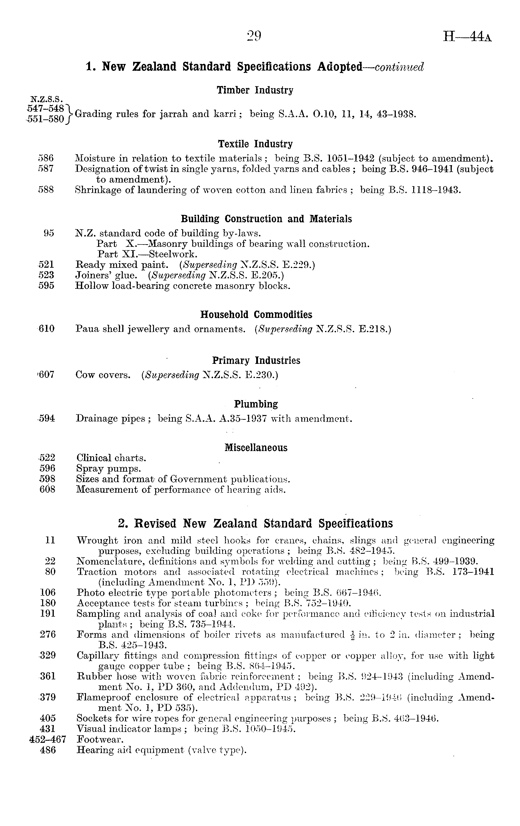 1. New Zealand Standard Specifications Adopted—continued Timber Industry N.Z.S.S. Grading rules for jarrah and karri; being S.A.A. 0.10, 11, 14, 43-1938. Textile Industry 586 Moisture in relation to textile materials ; being B.S. 1051-1942 (subject to amendment). 587 Designation of twist in single yarns, folded yarns and cables ; being B.S. 946-1941 (subject to amendment). 588 Shrinkage of laundering of woven cotton and linen fabrics ; being B.S. 1118-1943. Building Construction and Materials 95 N.Z. standard code of building by-laws. Part X.—Masonry buildings of bearing wall construction. Part XI. —Steelwork. 521 Ready mixed paint. ( Superseding N.Z.S.S. E. 229.) 523 Joiners' glue. (Superseding N.Z.S.S. E. 205.) 595 Hollow load-bearing concrete masonry blocks. Household Commodities 610 Paua shell jewellery and ornaments. (Superseding N.Z.S.S. E. 218.) Primary Industries '607 Cow covers. (Superseding N.Z.S.S. E. 230.) Plumbing -594 Drainage pipes ; being S.A.A. A.35-1937 with amendment. Miscellaneous 522 Clinical charts. 596 Spray pumps. 598 Sizes and format of Government publications. 608 Measurement of performance of hearing aids. 2. Revised New Zealand Standard Specifications 11 Wrought iron and mild steel hooks for cranes, chains, slings and general engineering purposes, excluding building operations ; being B.S. 482-1945. 22 Nomenclature, definitions and symbols for welding and cutting ; being B.S. 499-1939. 80 Traction motors and associated rotating electrical machines; being B.S. 173-1941 (including Amendment No. 1, PD 559). 106 Photo electric type portable photometers ; being B.S. 667-1946. 180 Acceptance tests for steam turbines ; being B.S. 752-1940. 191 Sampling and analysis of coal and coke for performance and efficiency tests on industrial plants ; being B.S. 735-1944. 276 Forms and dimensions of boiler rivets as manufactured f in. to 2 in. diameter ; being B.S. 425-1943. , 329 Capillary fittings and compression fittings of copper or copper alloy, for use with light gauge copper tube ; being B.S. 864-1945. 361 Rubber hose with woven fabric reinforcement; being B.S. 924-1943 (including Amendment No. 1, PD 360, and Addendum, PD 492). 379 Flameproof enclosure of electrical apparatus ; being B.S. 229-1946 (including Amendment No. 1, PD 535). 405 Sockets for wire ropes for general engineering purposes ; being B.S. 463-1946. 431 Visual indicator lamps ; being B.S. 1050-1945. 452-467 Footwear. 486 Hearing aid equipment (valve type).
