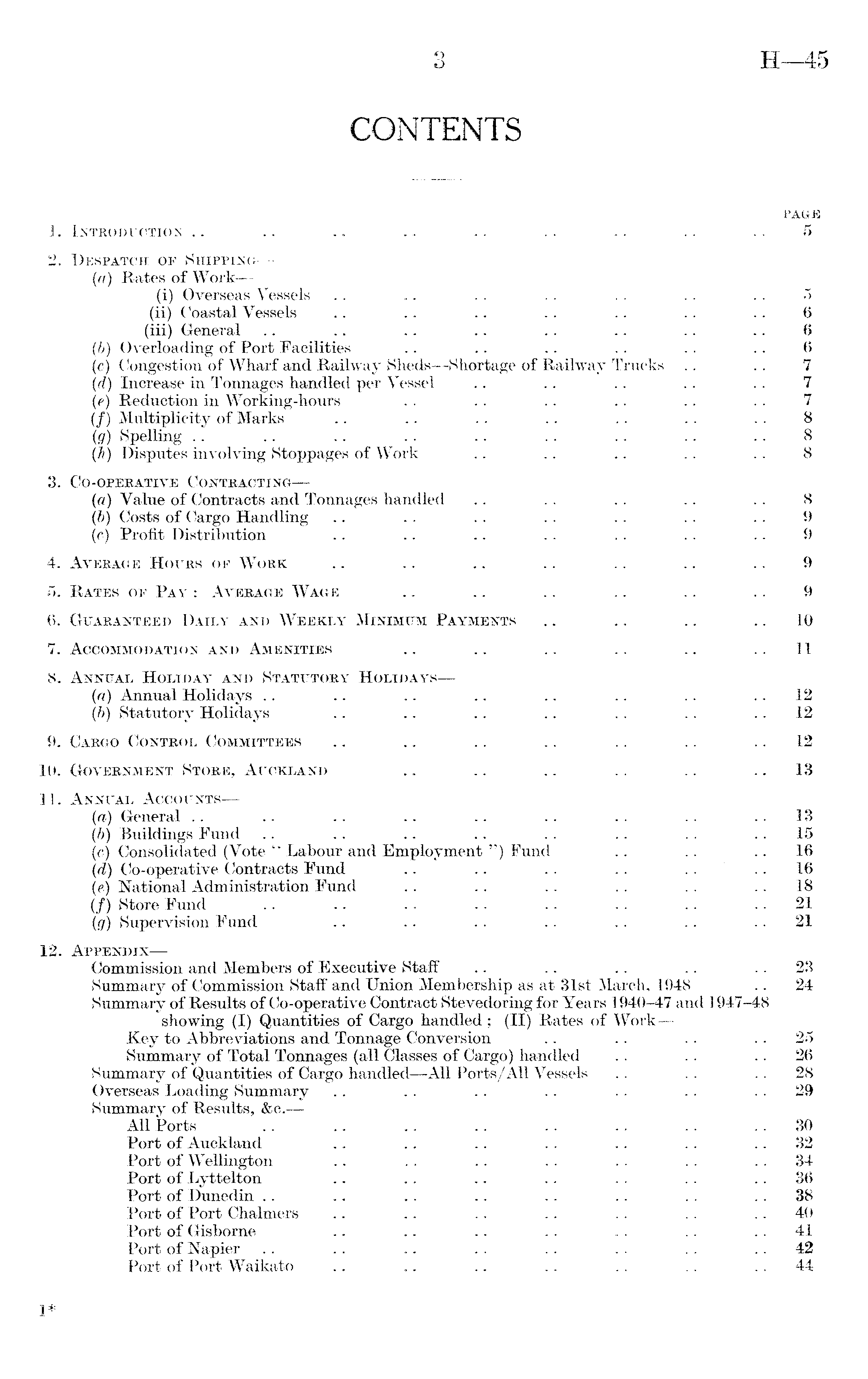 CONTENTS PAGI 1. Introduction .. .. .. .. .. .. .. .. .. 5 2. Despatch op Shipping—(а) Rates of Work — (i) Overseas Vessels .. .. .. .. .. .. .. 5 (ii) Coastal Vessels .. .. .. .. .. .. .. 6 (iii) General .. .. .. .. .. .. .. .. 6 (б) Overloading of Port Facilities .. .. .. .. .. .. 6 (c) Congestion of Wharf and Railway Sheds —Shortage of Railway Trucks . . .. 7 (d) Increase in Tonnages handled per Vessel .. .. .. .. .. 7 (e) Reduction in Working-hours .. .. .. .. .. .. 7 (/) Multiplicity of Marks .. .. .. . . .. .. . . 8 (g) Spelling .. .. .. .. .. .. .. .. .. 8 (h) Disputes involving Stoppages of Work .. .. .. .. .. 8 3. Co-operative Contracting—(a) Value of Contracts and Tonnages handled .. .. .. .. . . 8 (b) Costs of Cargo Handling .. .. .. .. .. .. .. 9 (c) Profit Distribution .. .. .. .. .. .. .. 9 4. Average Hours of Work .. .. .. .. .. .. .. 9 5. Rates of Pay : Average Wage .. .. .. .. .. .. 9 6. Guaranteed Daily and Weekly Minimum Payments .. .. .. .. 10 7. Accommodation and Amenities .. .. .. .. .. .. 11 8. Annual Holiday and Statutory Holidays—(a) Annual Holidays .. .. .. .. .. .... 12 (b) Statutory Holidays .. .. .. .. .. .. 12 9. Cargo Control Committees .. .. .. .. .. .. 12 10. Government Store, Auckland .. • .. .. .. .. .. 13 11. Annual Accounts — (а) General . . .. .. .. .. .. .. .. 13 (б) Buildings Fund .. .. .. .. .. .. . . 15 (c) Consolidated (Vote " Labour and Employment ") Fund .. .. .. 16 (d) Co-operative Contracts Fund .. .. . . . . .... 16 (e) National Administration Fund .. .. .. .. . . 18 (/) Store Fund .. .. .. .. .. .. .. 21 (g) Supervision Fund .. .. .. .. .. .. 21 12. Appendix— Commission and Members of Executive Staff .. .. .. .. 23 Summary of Commission Staff and Union Membership as at 31st March, 1948 .. 24 Summary of Results of Co-operative Contract Stevedoring for Years 1940-47 and 1947-48 showing (I) Quantities of Cargo handled; (II) Rates of Work— Key to Abbreviations and Tonnage Conversion .. .. .. .. 25 Summary of Total Tonnages (all Classes of Cargo) handled .. .. 26 Summary of Quantities of Cargo handled—All Ports/All Vessels .. .. .. 28 Overseas Loading Summary .. .. .. .. .. .. 29 Summary of Results, &c.— All Ports . . .. .. .. .. .. .. 30 Port of Auckland .. .. .. .. .. .. 32 Port of Wellington .. .. .. .. .. .. 34 Port of Lyttelton .. .. .. .. .. .. 36 Port of Dunedin .. .. .. .. .. .. .. 38 Port of Port Chalmers .. .. .. .. .. .. 40 Port of Gisborne .. .. .. .. .. .. 41 Port of Napier .. .. .. .. .. .. .. 42 Port of Port Waikato .. .. .. .. .. .. 44 1*