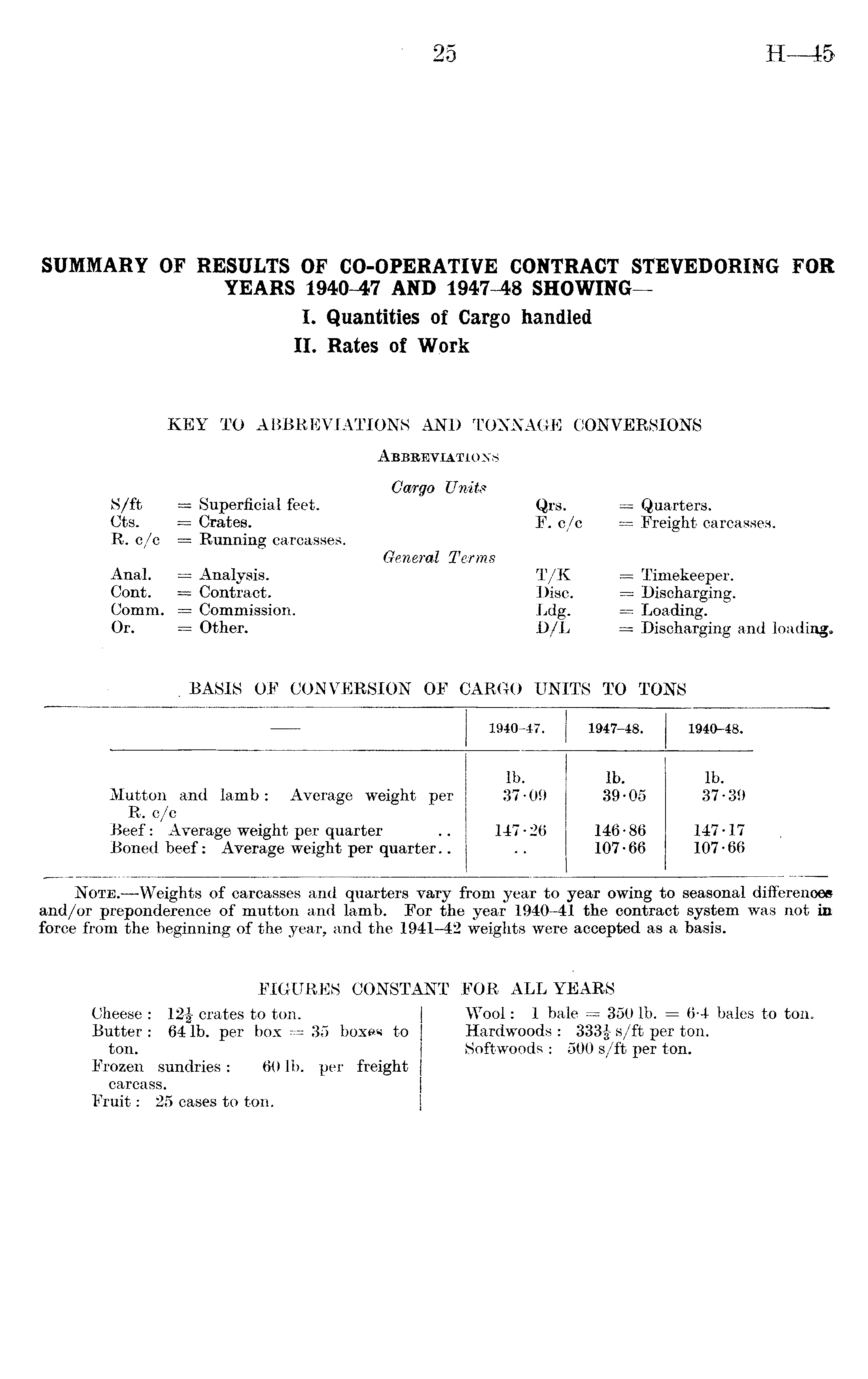 SUMMARY OF RESULTS OF CO-OPERATIVE CONTRACT STEVEDORING FOR YEARS 1940-47 AND 1947-48 SHOWING— I. Quantities of Cargo handled 11. Rates of Work KEY TO ABBREVIATIONS AND TONNAGE CONVERSIONS Abbreviations Cargo Units S/ft = Superficial feet. Qrs. = Quarters. Cts. = Crates. F. c/c = Freight carcasses. R. c/c == Running carcasses. General Terms Anal. = Analysis. T/K Timekeeper. Cont. = Contract. Disc. = Discharging. Comm. = Commission. Ldg. = Loading. Or. = Other. D/L = Discharging and loading.
