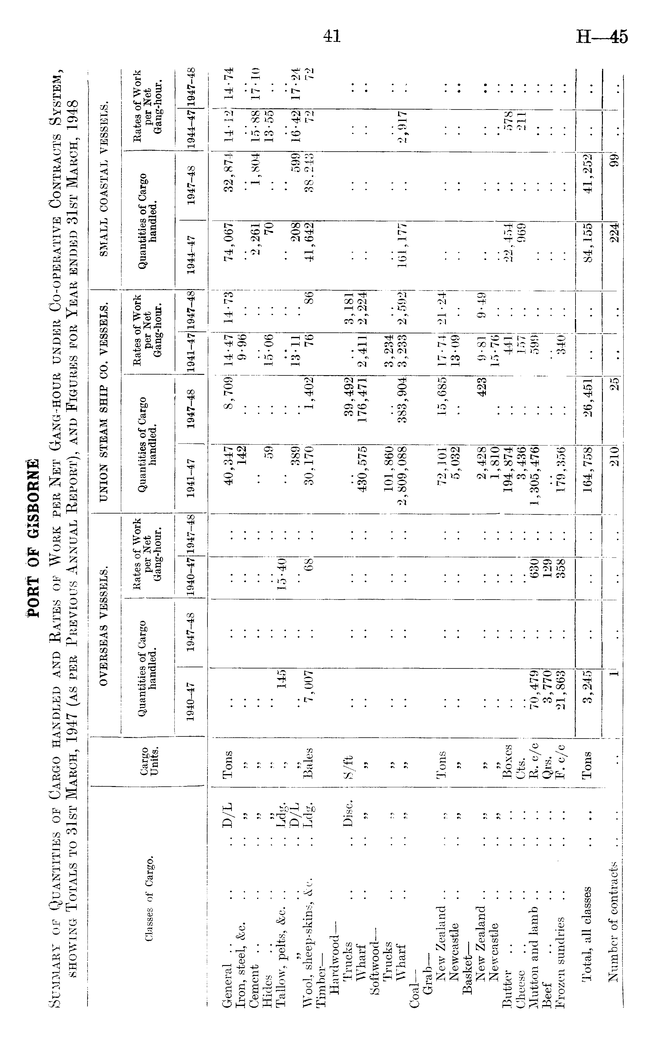 PORT OF GISBORNE Summary of Quantities of Cargo handled and Rates of Work per Net Gang-hour under Co-operative Contracts System, showing Totals to 31st March, 1947 (as per Previous Annual Report), and Figures for Year ended 31st March, 1948