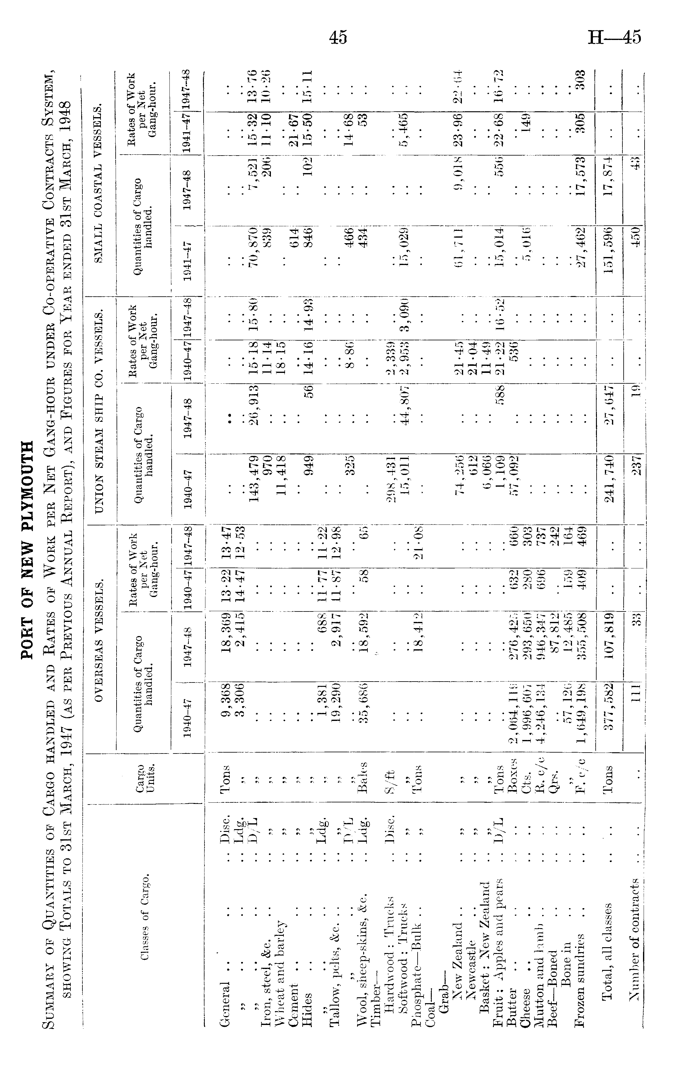 PORT OF NEW PLYMOUTH Summary of Quantities of Cargo handled and Rates of Work per Net Gang-hour under Co-operative Contracts System, showing Totals to 31st March, 1947 (as per Previous Annual Report), and Figures for Year ended 31st March, 1948