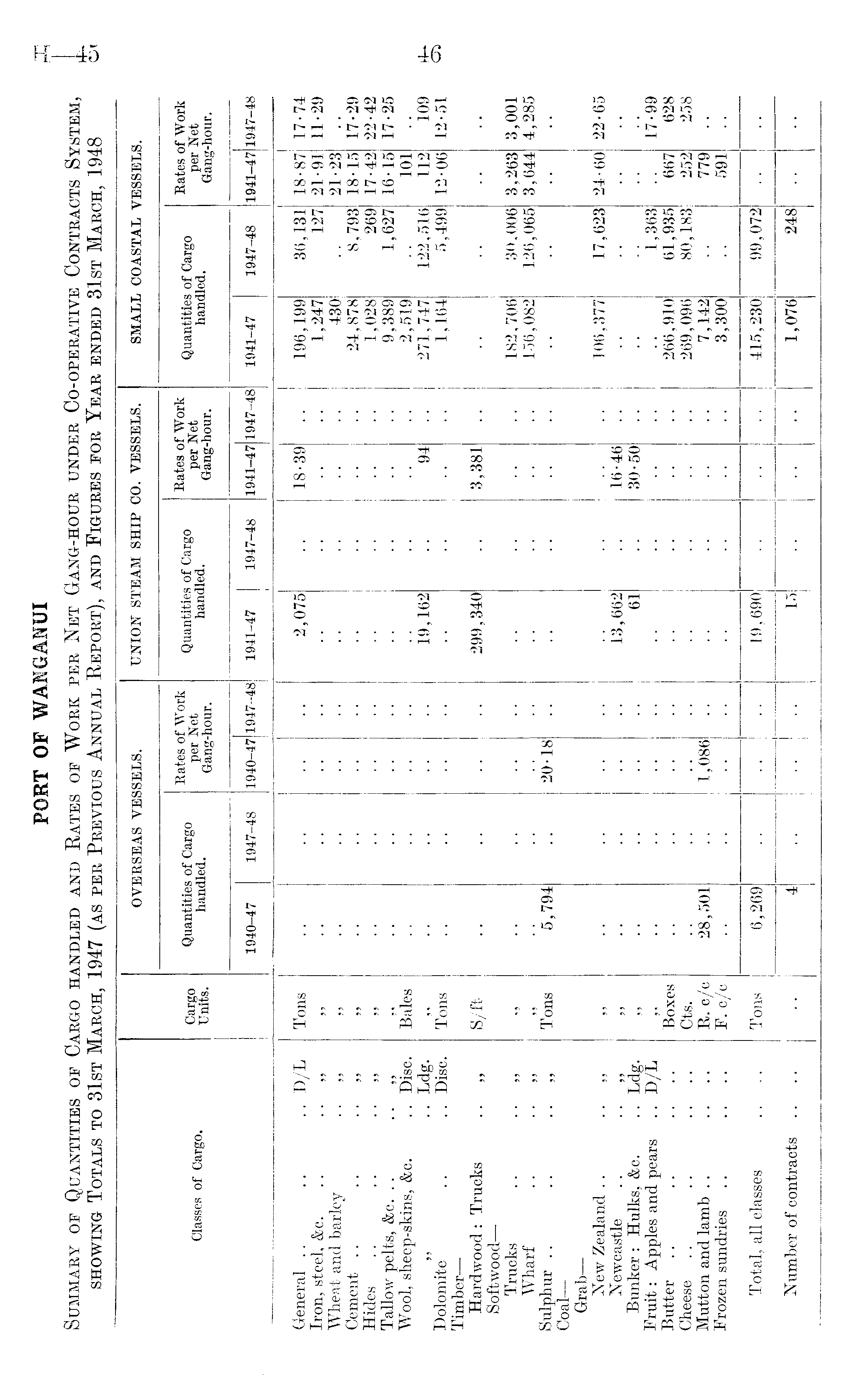 PORT OF WANGANUI Summary of Quantities of Cargo handled and Rates of Work per Net Gang-hour under Co-operative Contracts System, showing Totals to 31st March, 1947 (as per Previous Annual Report), and Figures for Year ended 31st March, 1948