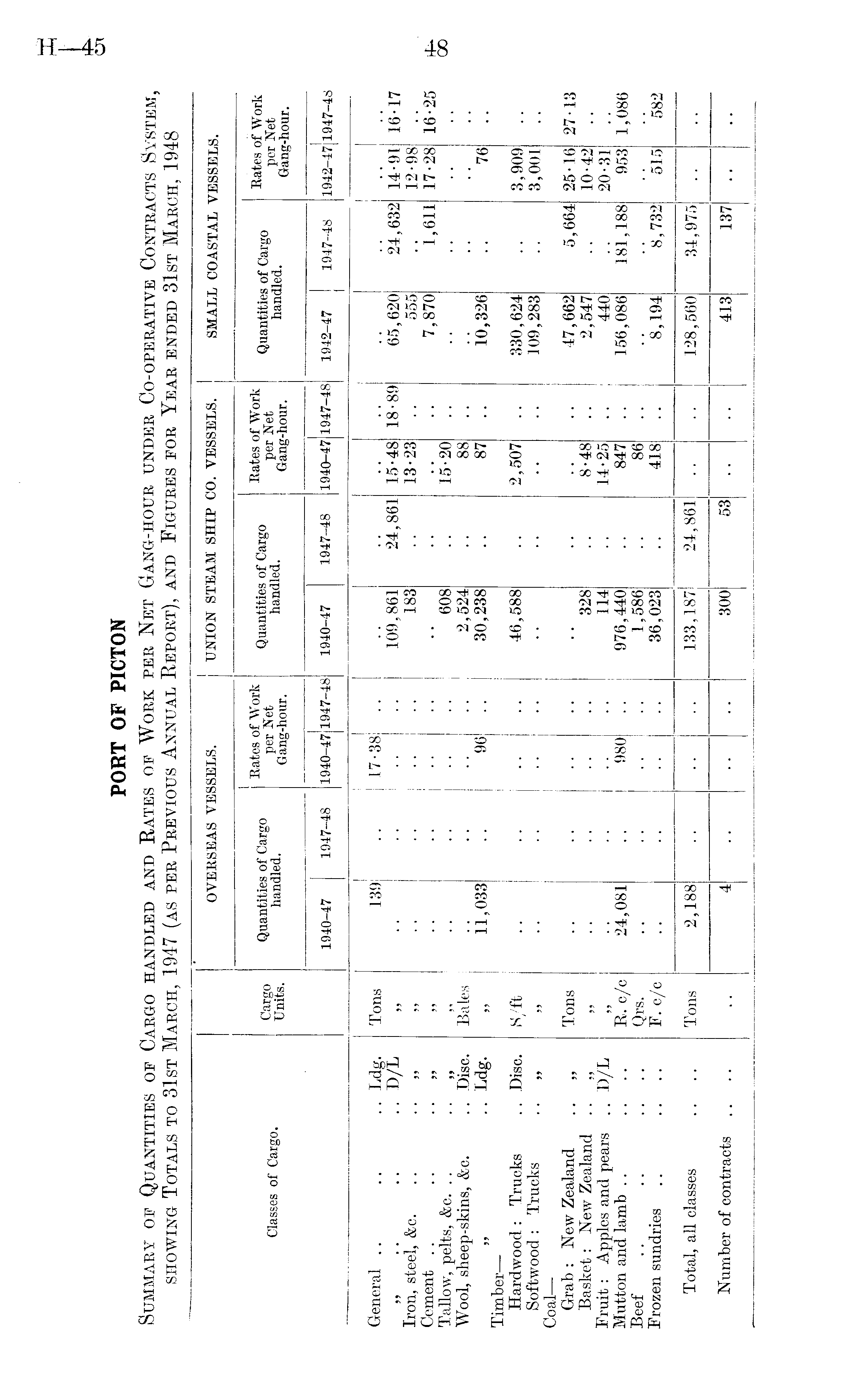 PORT OF PICTON Summary of Quantities of Cargo handled and Rates of Work per Net Gang-hour under Co-operative Contracts System, showing Totals to 31st March, 1947 (as per Previous Annual Report), and Figures for Year ended 31st March, 1948
