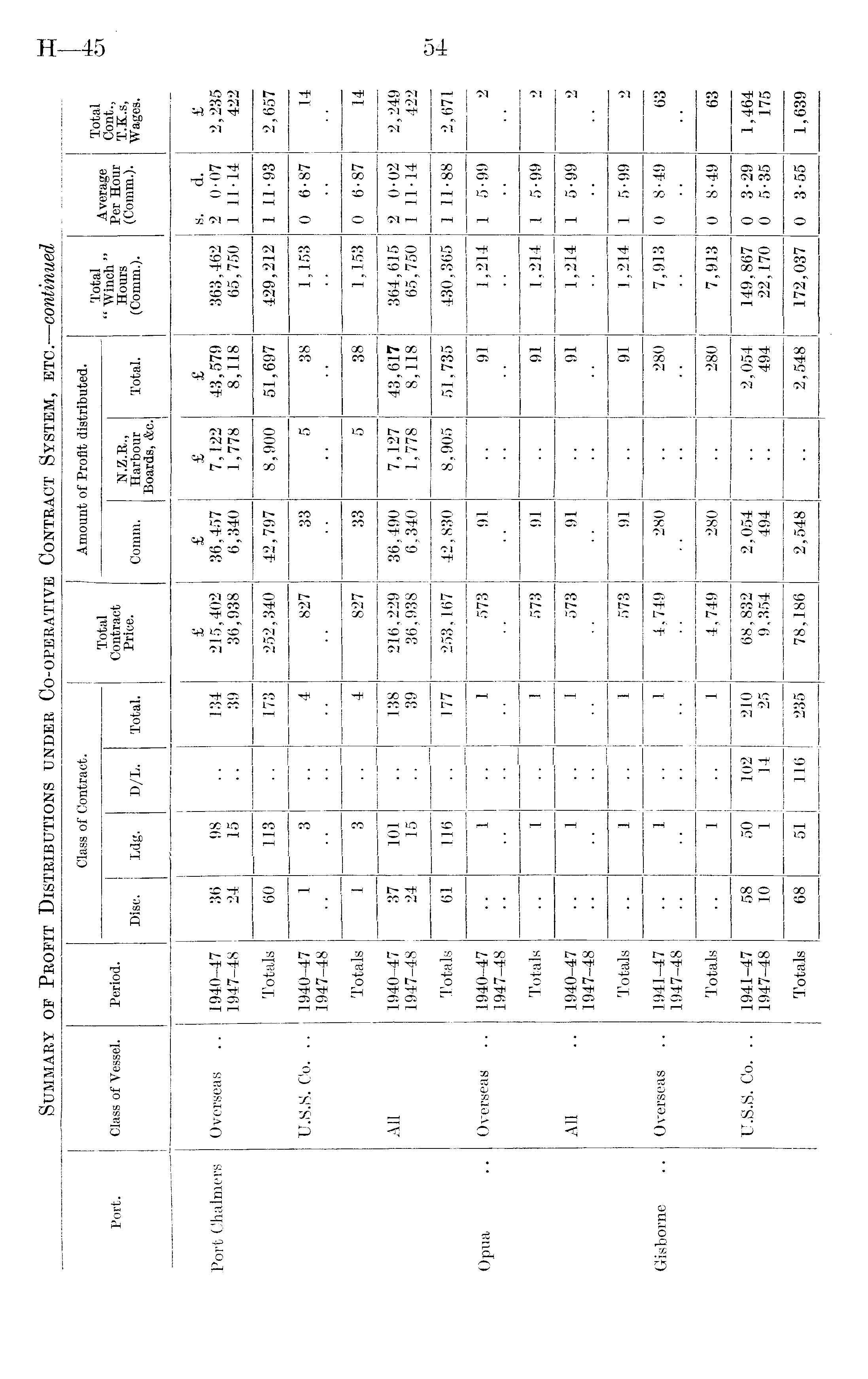 Class of Contract. Total Contract Price. Amount of Profit distributed. Total Average Per Hour (Comm.). Total Port. Class of Vessel. Period. Disc. Ldg. D/L. Total. Comm. N.Z.R., Harbour Boards, &c. Total. " Winch " Hours (Comm.). Cont., T.K.s, Wages. Port Chalmers Overseas 1940-47 1947-48 36 24 98 15 134 39 £ 215,402 36,938 £ 36,457 6,340 £ 7,122 1,778 £ 43,579 8,118 363,462 65,750 s. d. 2 0-07 1 11-14 £ 2,235 422 Totals 60 113 173 252,340 42,797 8,900 51,697 429,212 1 11-93 2,657 U.S.S. Co. .. 1940-47 1947-48 1 3 4 827 33 5 38 1,153 0 6-87 14 Totals 1 3 4 827 33 5 38 1,153 0 6-87 14 All 1940-47 1947-48 37 24 101 15 138 39 216,229 36,938 36,490 6,340 7,127 1,778 43,617 8,118 364,615 65,750 2 0-02 1 11-14 2,249 422 Totals 61 116 177 253,167 42,830 8,905 51,735 430,365 1 11-88 2,671 Opua Overseas 1940-47 1947-48 1 1 573 91 91 1,214 1 5-99 2 Totals 1 1 573 91 91 1,214 1 5-99 2 All 1940-47 1947-48 1 1 573 91 91 1,214 1 5-99 2 Totals 1 1 573 91 91 1,214 1 5-99 2 Gisborne Overseas 1941-47 1947-48 1 1 4,749 280 280 7,913 0 8-49 63 Totals 1 1 4,749 280 280 7,913 0 8-49 63 U.S.S. Co. .. 1941-47 1947-48 58 10 50 1 102 14 210 25 68,832 9,354 2,054 494 2,054 494 149,867 22,170 0 3-29 0 5-35 1,464 175 Totals 68 51 116 235 78,186 2,548 2,548 172,037 0 3-55 1,639