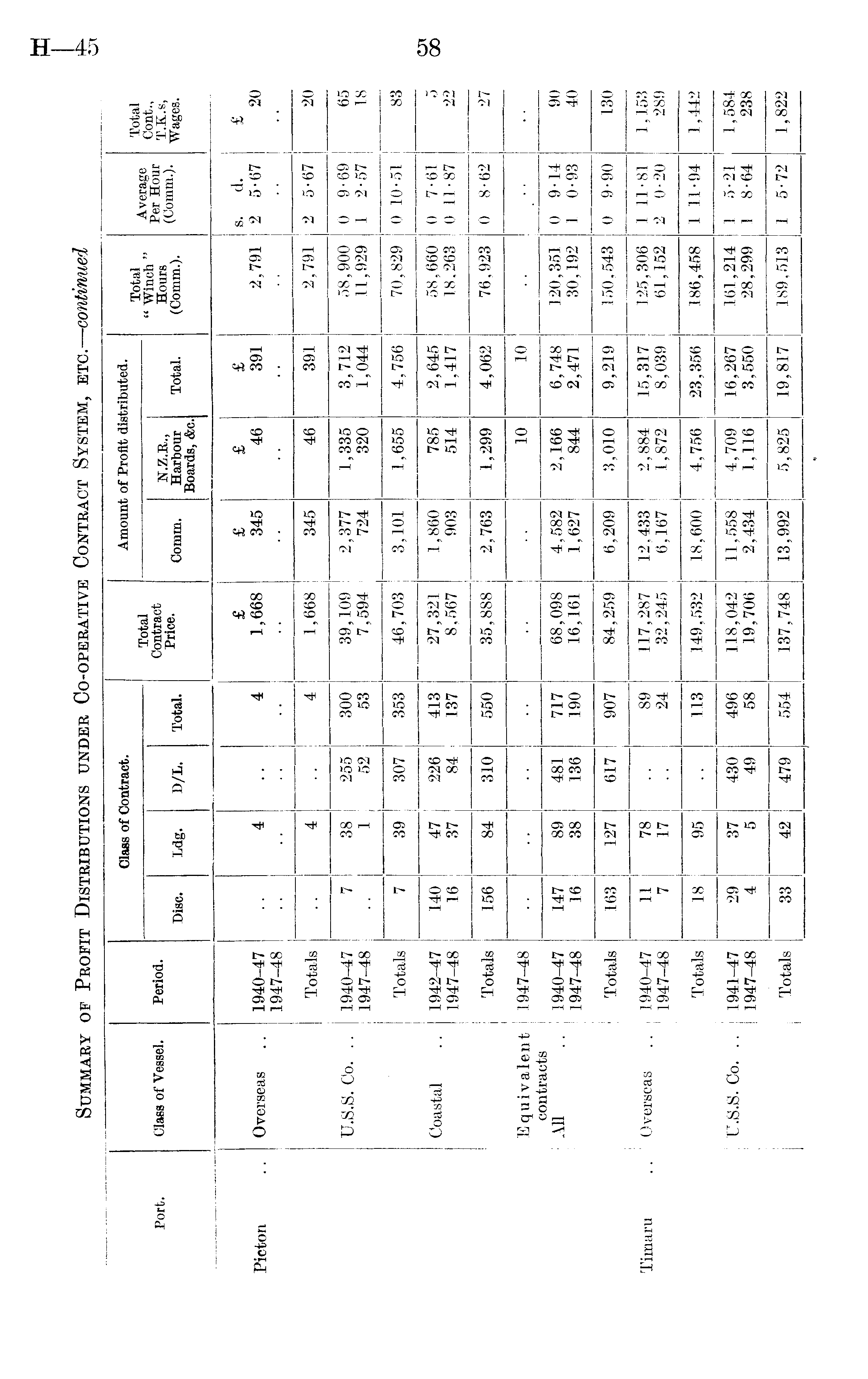 Class of Contract. Total Contract Price. Amount of Profit distributed. Total Average Per Hour (Comm.). Total Port. Class of Vessel. Period. Disc. Ldg. D/L. Total. Comm. N.Z.R., Harbour Boards, <fec. Total. " Winch " Hours (Comm.). Cont., T.K.s, Wages. Picton Overseas 1940-47 1947-48 4 4 £ 1,668 £ 345 £ 46 £ 391 2,791 S. d. 2 5-67 £ 20 Totals 4 4 1,668 345 46 391 2,791 2 5-67 20 U.S.S. Co. .. 1940-47 1947-48 7 38 1 255 52 300 53 39,109 7,594 2,377 724 1,335 320 3,712 1,044 58,900 11,929 0 9-69 1 2-57 65 18 Totals 7 39 307 353 46,703 3,101 1,655 4,756 70,829 0 10-51 83 Coastal 1942-47 1947-48 140 16 47 37 226 84 413 137 27,321 8,567 1,860 903 785 514 2,645 1,417 58,660 18,263 0 7-61 0 11-87 5 22 Totals 156 84 310 550 35,888 2,763 1,299 4,062 76,923 0 8-62 27 Equivalent contracts All | 1947-48 10 10 1940-47 1947-48 147 16 89 38 481 136 717 190 68,098 16,161 4,582 1,627 2,166 844 6,748 2,471 120,351 30,192 0 9-14 1 0-93 90 40 Totals 163 127 617 907 84,259 6,209 3,010 9,219 150,543 0 9-90 130 Timaru Overseas 1940-47 1947-48 11 7 78 17 89 24 117,287 32,245 12,433 6,167 2,884 1,872 15,317 8,039 125,306 61,152 1 11-81 2 0-20 1,153 289 Totals 18 95 113 149,532 18,600 4,756 23,356 186,458 1 11-94 1,442 U.S.S. Co. .. 1941-47 1947-48 29 4 37 5 430 49 496 58 118,042 19,706 11,558 2,434 4,709 1,116 16,267 3,550 161,214 28,299 1 5-21 1 8-64 1,584 238 Totals 33 42 479 554 137,748 13,992 5,825 19,817 189,513 1 5-72 1,822