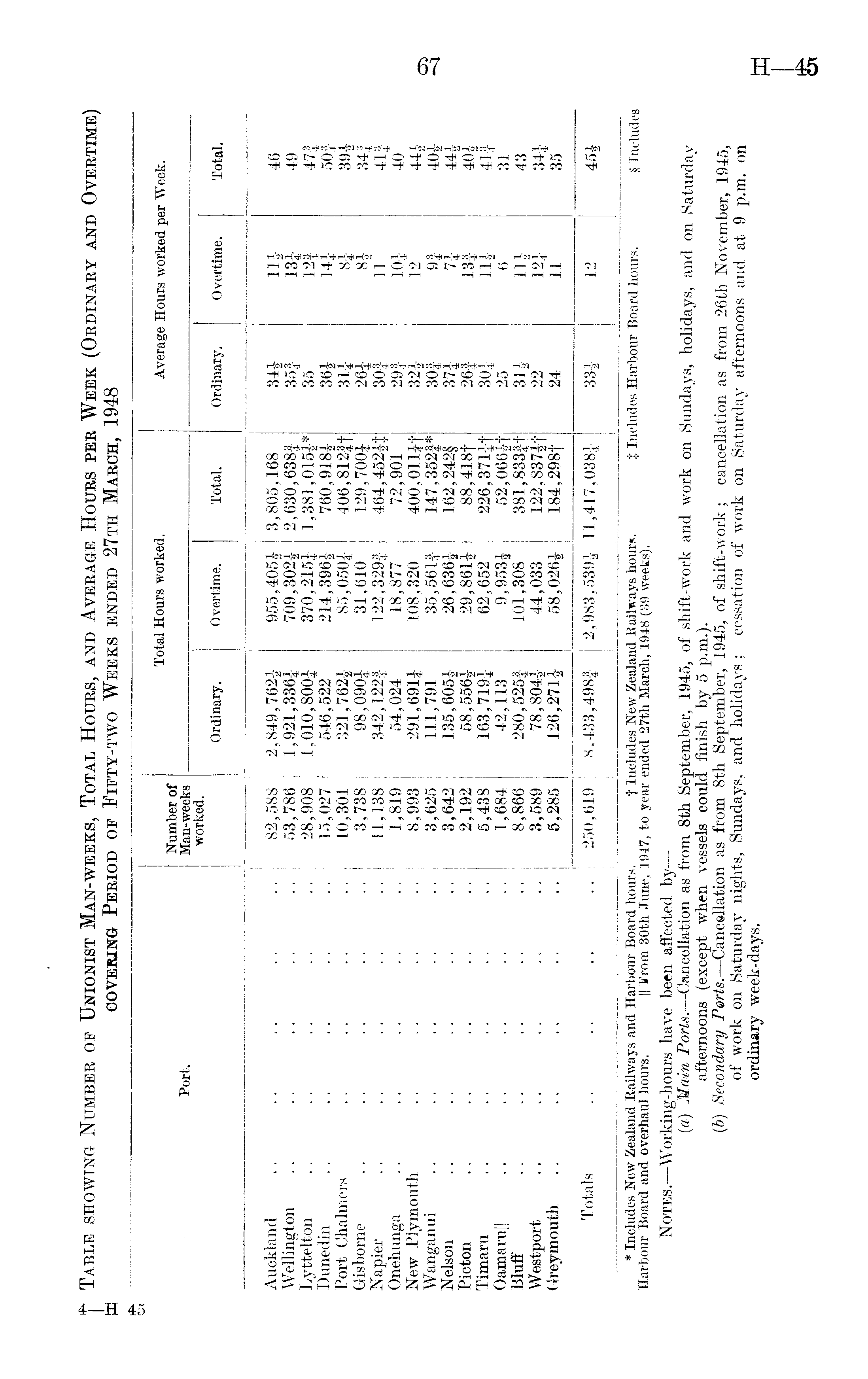 Notes.— Working-hours have been affected by—(а) Main Ports. —Cancellation as from Bth September, 1945, of shift-work and work on Sundays, holidays, and on Saturday afternoons (except when vessels could finish by 5 p.m.). (б) Secondary Parts.—Cancellation as from Bth September, 1945, of shift-work ; cancellation as from 26th November, 1945, of work on Saturday nights, Sundays, and holidays ; cessation of work on Saturday afternoons and at 9 p.m. on ordinary week-days.