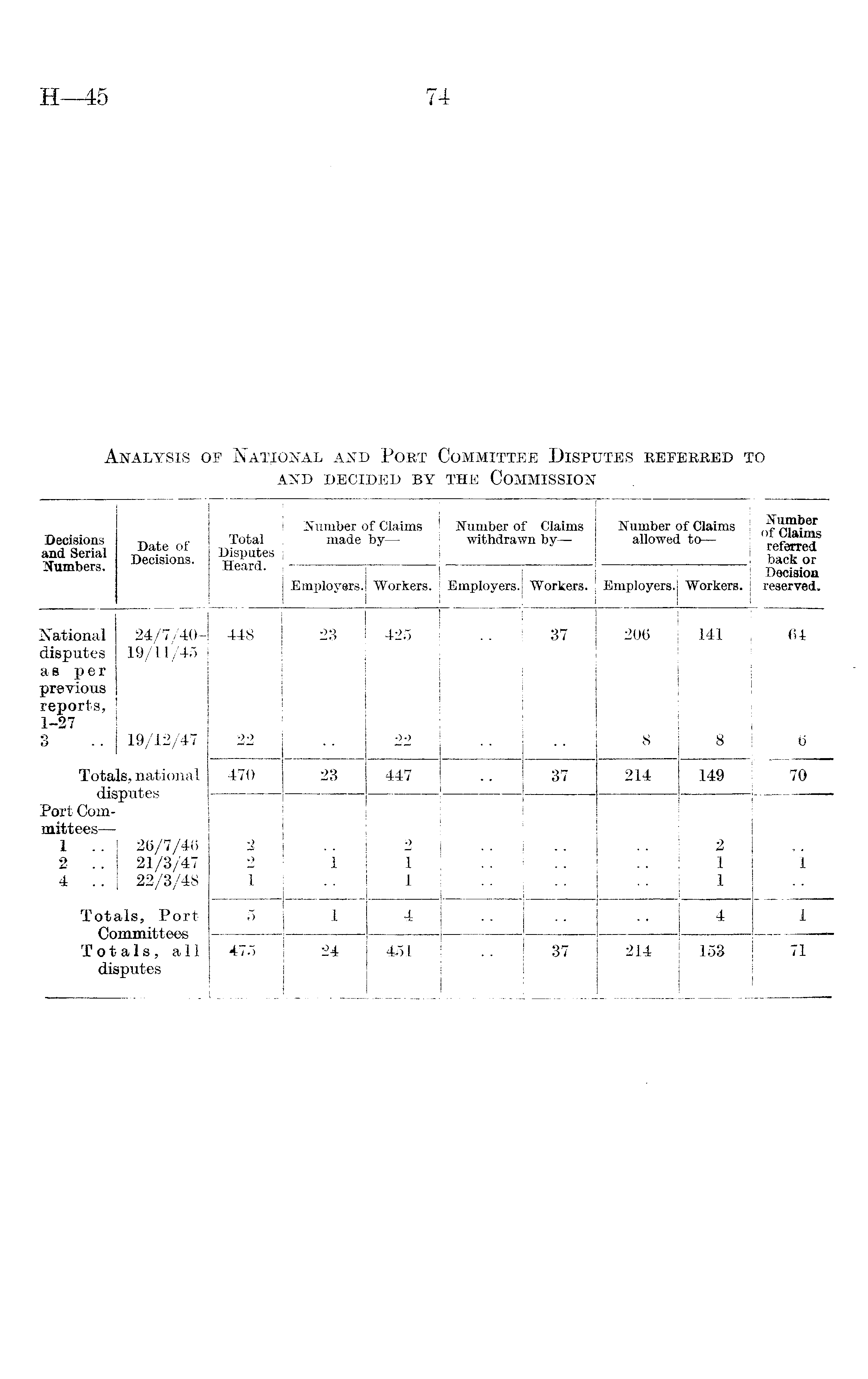 Decisions and Serial Numbers. Date of Decisions. Total Disputes Heard. Number of Claims made by— Number of Claims withdrawn by— Number of Claims allowed to— Number of Claims referred back or Employers. Workers. Employers. Workers. Employers. Workers. Decision reserved. National disputes as per previous reports, 1-27 3 24/7/4019/11/45 19/12/47 448 22 23 425 22 37 206 8 141 8 64 6 Totals, national 470 23 447 37 214 149 70 VAJLC Port Committees— 1 .. 2 .. 4 .. 26/7/46 21/3/47 22/3/48 2 2 1 1 2 1 1 2 1 1 i Totals, Port Committees Totals, all disputes 5 1 4 4 1 475 24 451 37 214 153 71