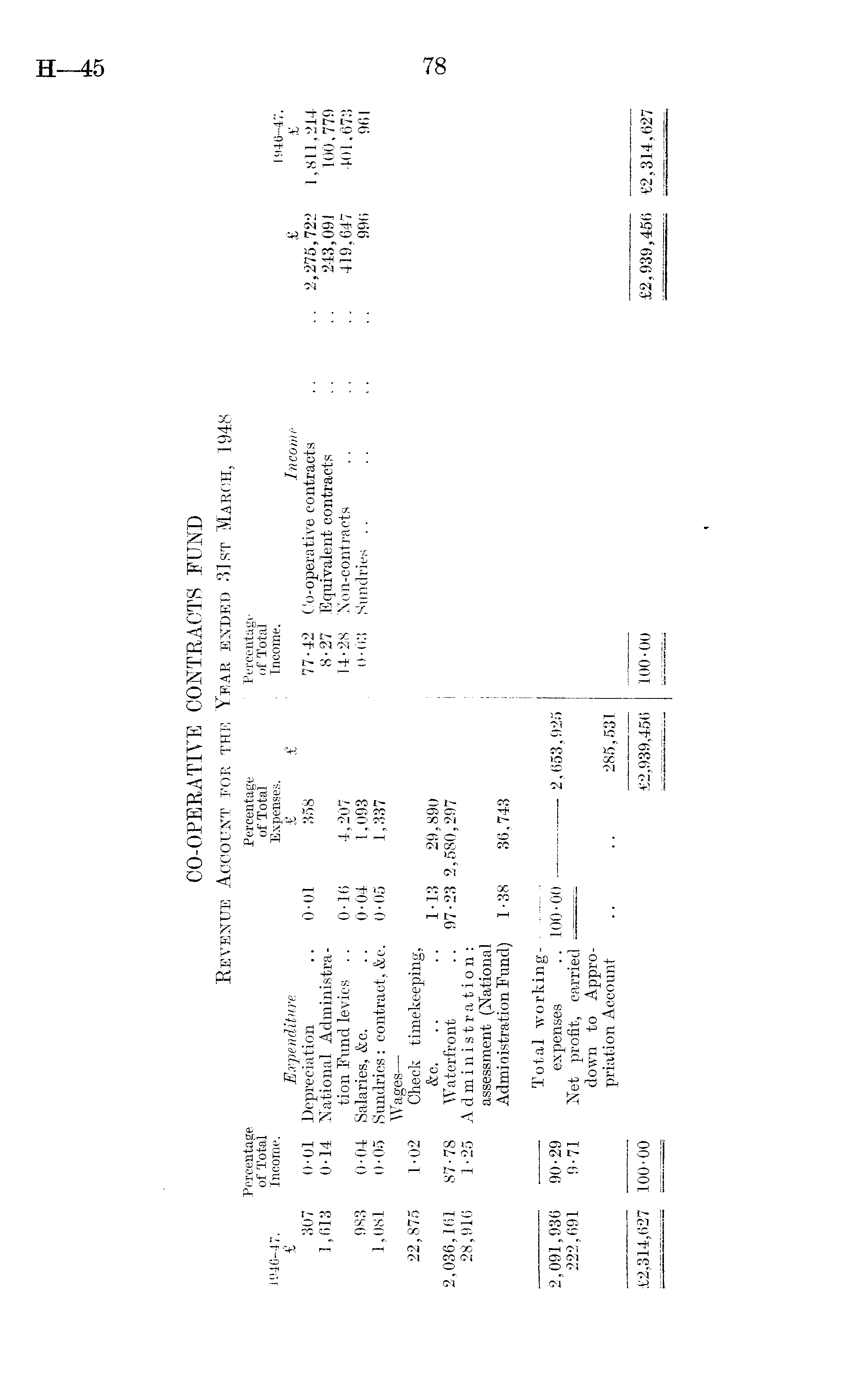 CO-OPERATIVE CONTRACTS FUND Revenue Account for the Year ended 31st March, 1948 Percentage Percentage I Percentage of Total of Total of Total 1946-47. Income. Expenses. Income. 1946-47. £ Expenditure £ £ I Income £ £ 307 0-01 Depreciation .. 0-01 358 77-42 Co-operative contracts .. .. 2,275,722 1,811,214 1,613 o*l4 National Administra- 8*27 Equivalent contracts .. .. 243,091 100,779 tion Fund levies .. 0-16 4,207 : 14-28 Non-contracts .. .. .. 419,647 401,673 983 0-04 Salaries, &c. .. 0-04 1,093 I 0-03 Sundries .. .. .. .. 996 961 1,081 0-05 Sundries: contract, &c. 0-05 1,337 Wages— 22,875 1-02 Check timekeeping, &c. .. .. 1-13 29,890 2,036,161 87-78 Waterfront .. 97-23 2,580,297 28,916 1-25 Administration: assessment (National Administration Fund) 1-38 36,743 Total working2,091,936 90-29 expenses ..100-00 2,653,925 222,691 9-71 Net profit, carried ' down to Appropriation Account .. .. 285,531 £2,314,627 100-00 £2,939,456 100-00 £2,939,456 £2,314,627