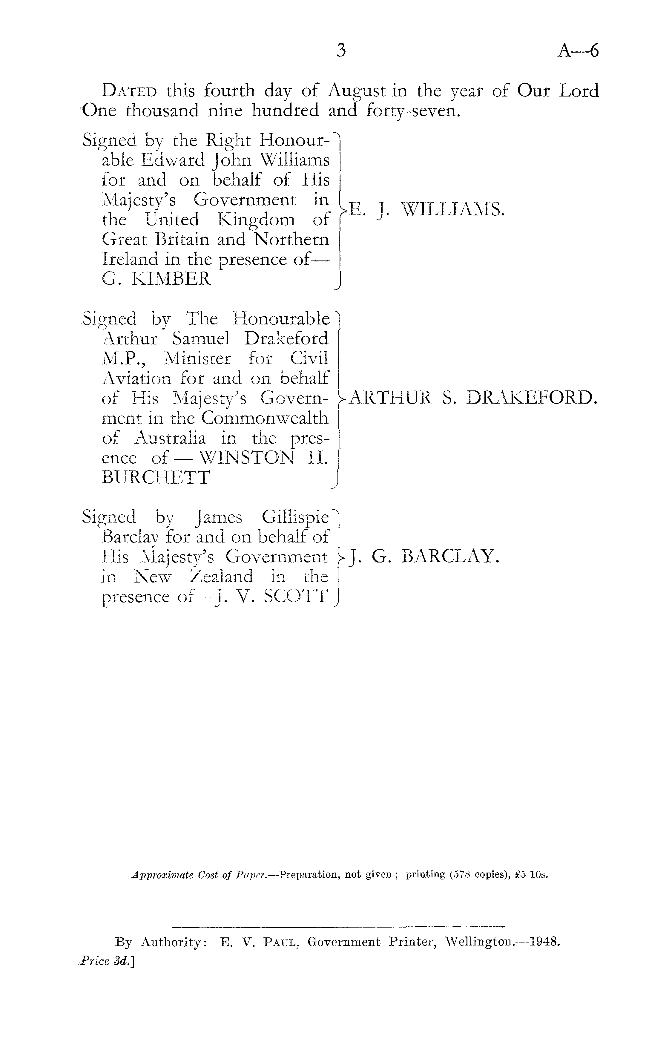 Dated this fourth day of August in the year of Our Lord One thousand nine hundred and forty-seven. Signed by the Right Honour-" able Edward John Williams for and on behalf of His Majesty's Government in r? T W/TT T TA , rc the United Kingdom of f K J* WILLIAMS - Great Britain and Northern Ireland in the presence of— G. KIMBER .Signed by The Honourable" Arthur Samuel Drakeford M.P., Minister for Civil Aviation for and on behalf of His Majesty's Govern- S. DRAKEFORD. ment in the Commonwealth | of Australia in the pres- | ence of—WINSTON H. j BURCHETT J Signed by James Gillispie" Barclay for and 011 behalf of His Majesty's Government >J. G. BARCLAY, in New Zealand in the presence of—J. V. SCOTT^