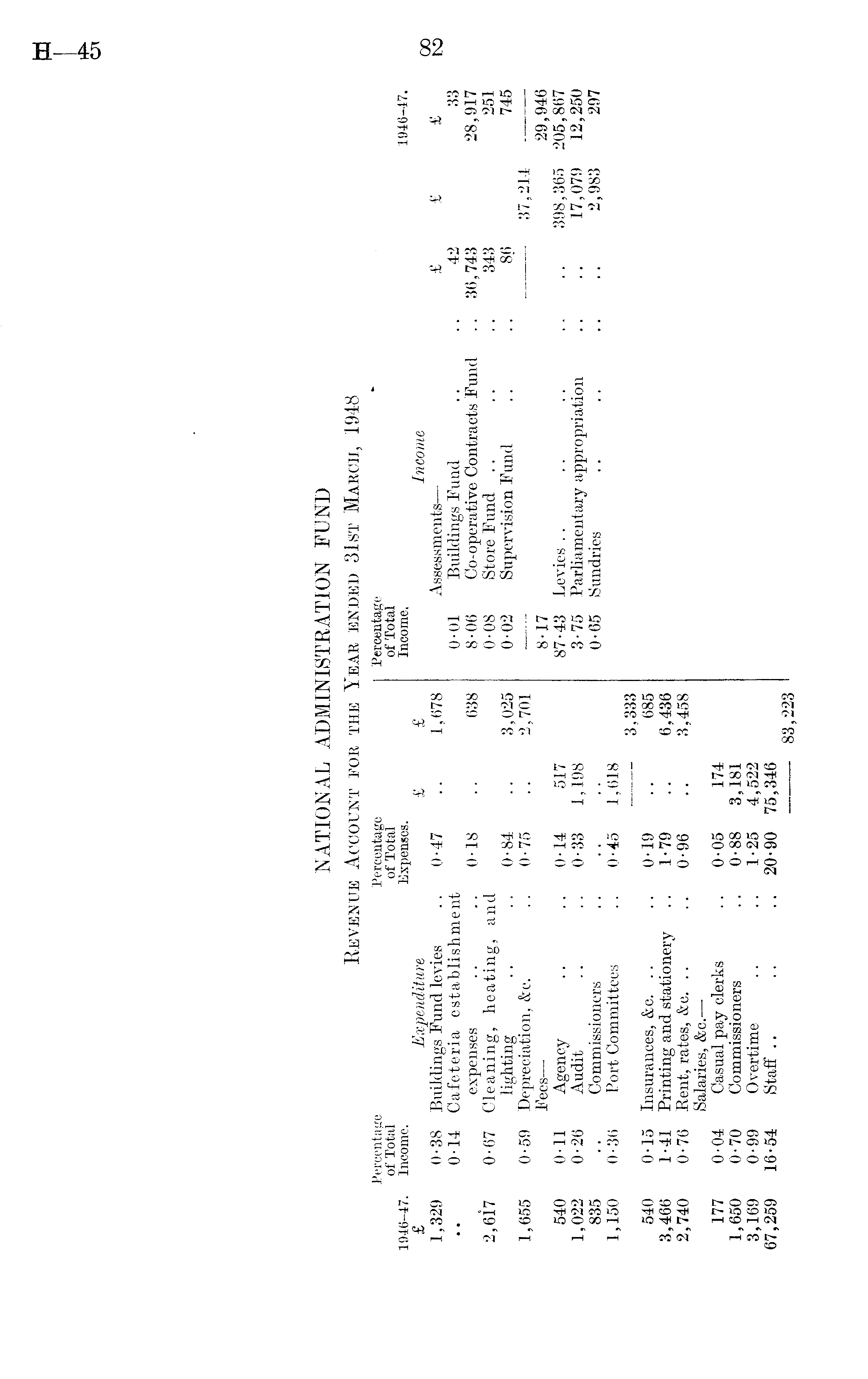 NATIONAL ADMINISTRATION FUND Revenue Account for the Year ended 31st March, "1948 Percentage Percentage Percentage of Total of Total of Total 1946-47. Income. Expenses. Income. 1946-47. £ Expenditure £ £ Income 1,329 0-38 Buildings Fund levies .. 0-47 .. 1,678 Assessments— £ £ £ 0-14 Cafeteria establishment 0-01 Buildings Fund .. ..42 33 expenses .. .. 0' 18 .. 638 8-06 Co-operative Contracts Fund .. 36,743 28,917 2,6i7 0-67 Cleaning, heating, and 0-08 Store Fund .. .. .. 343 251 lighting ~ .. 0-84 .. 3,025 0-02 Supervision Fund .. .. 86 745 1,655 0-59 Depreciation, &c. .. 0-75 .. 2,701 37,214 Fees— 8-17 29,946 540 0-11 Agency .. .. 0-14 517 87*43 Levies.. .. .. .. .. 398,365 205,867 1,022 0-26 Audit .. .. 0• 33 1,198 3-75 Parliamentary appropriation .. .. 17,079 12,250 835 .. Commissioners .. .. .. 0-65 Sundries .. .. .. .. 2,983 297 1,150 0-36 Port Committees .. 0-45 1,618 3,333 540 0-15 Insurances, &c. .. .. o*l9 .. 685 3,466 I*4l Printing and stationery .. 1-79 .. 6,436 2,740 0-76 Rent, rates, &c. .. .. 0-96 .. 3,458 Salaries, &c.— 177 0-04 Casual pay clerks .. 0-05 174 1,650 0-70 Commissioners .. 0-88 3,181 3,169 0-99 Overtime .. .. 1-25 4,522 67,259 16-54 Staff.. .. .. 20-90 75,346 83,223