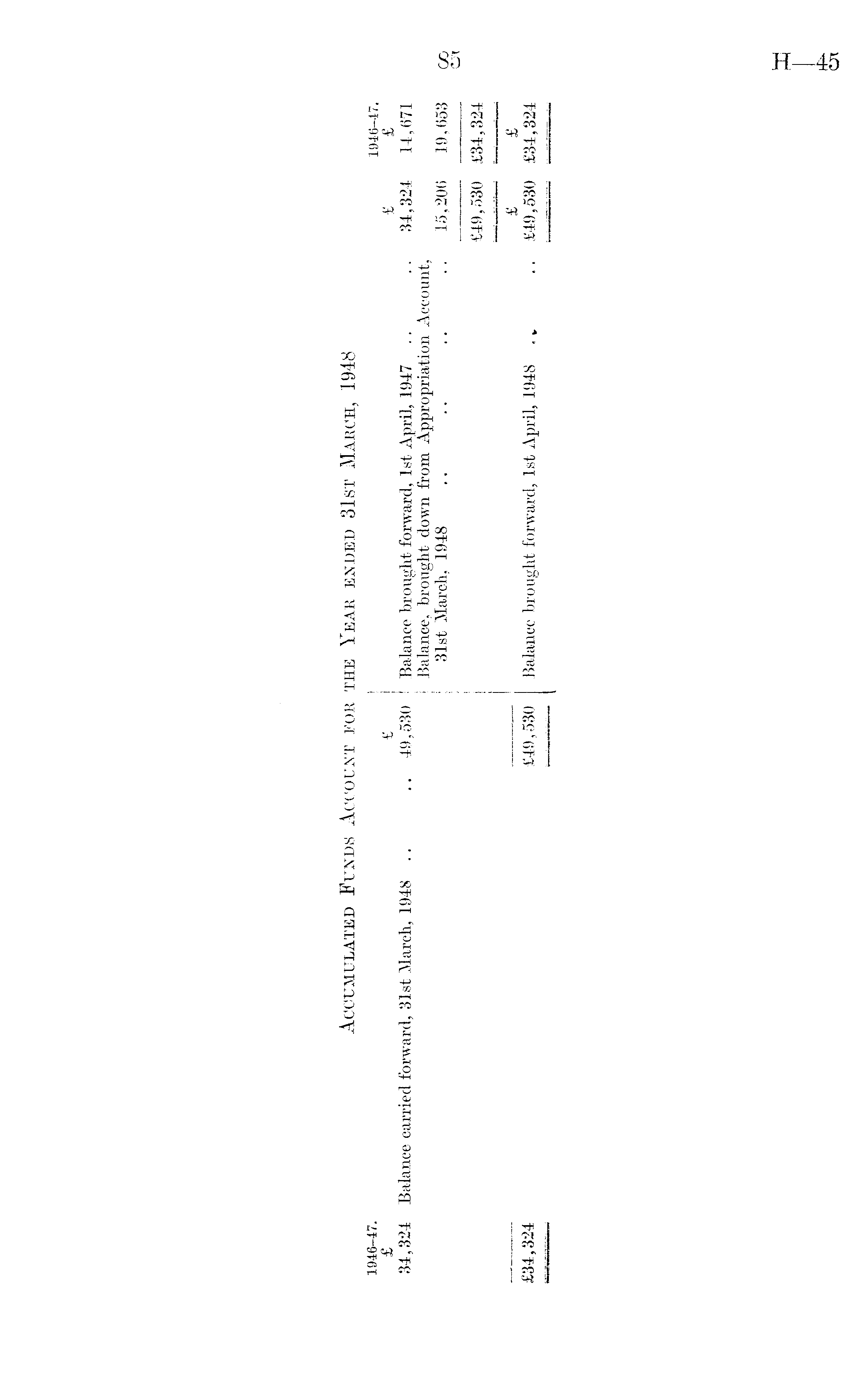 Accumulated Funds Account for the Year ended 31st March, 1948 1946-47. 1946-47. £ £ £ £ 34,324 Balance carried forward, 31st March, 1948 .. .. 49,530 Balance brought forward, Ist April, 1947 .. .. 34,324 14,671 Balance, brought down from Appropriation Account, 31st March, 1948 .. .. .. .. 15,206 19,653 00 O7 £49,530 £34,324 • £ £ £34,324 £49,530 Balance brought forward, Ist April, 1948 .. £49,530 £34,324