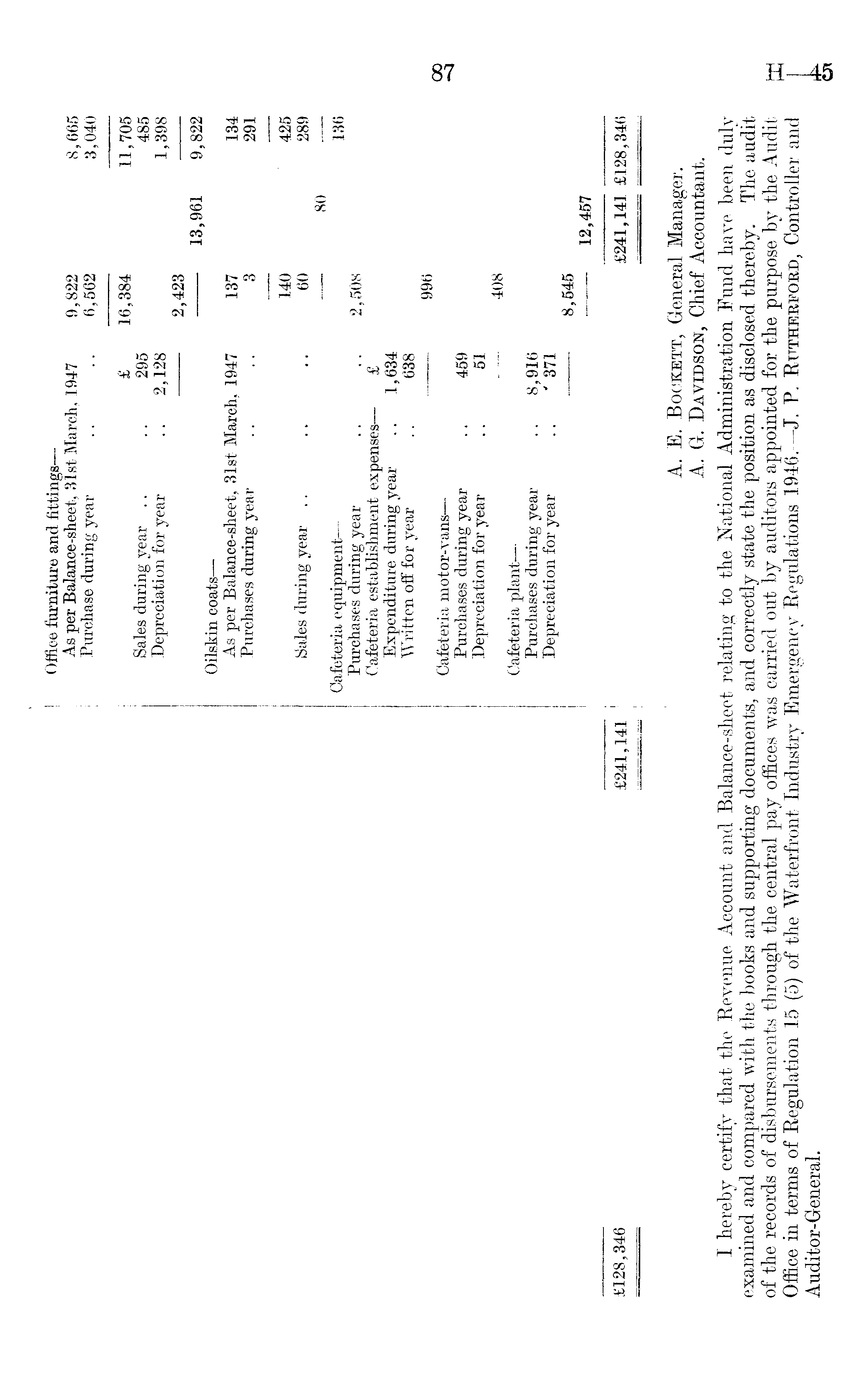 I Office furniture and fittings— As per Balance-sheet, 31st March, 1947 9,822 8,665 Purchase during year .. .. 6,562 3,040 £ 16,384 11,705 Sales during year .. .. 295 485 Depreciation for year .. 2,128 1,398 2,423 13,961 9,822 Oilskin coats— As per Balance-sheet, 31st March, 1947 137 134 Purchases during year .. .. 3 291 140 425 Sales during year .. .. .. 60 289 BO Cafeteria equipment— 136 Purchases during year .. .. 2,508 Cafeteria establishment expenses— £ Expenditure during year .. 1,634 Written off for year .. 638 996 Cafeteria motor-vans— Purchases during year .. 459 Depreciation for year .. 51 4OB Cafeteria plant— Purchases during year .. 8,916 Depreciation for year .. '371 8,545 12,457 £128,346 £241,141 £241,141 £128,346 A. E. Bockett, General Manager. A. G-. Davidson, Chief Accountant. I hereby certify that the Revenue Account and Balance-sheet relating to the National Administration Fund have been duly examined and compared with the books and supporting documents, and correctly state the position as disclosed thereby. The audit of the records of disbursements through the central pay offices was carried out by auditors appointed for the purpose by the Audit Office in terms of Regulation 15 (5) of the Waterfront Industry Emergency Regulations 1946.— J. P. Rutherford, Controller and Auditor-General.
