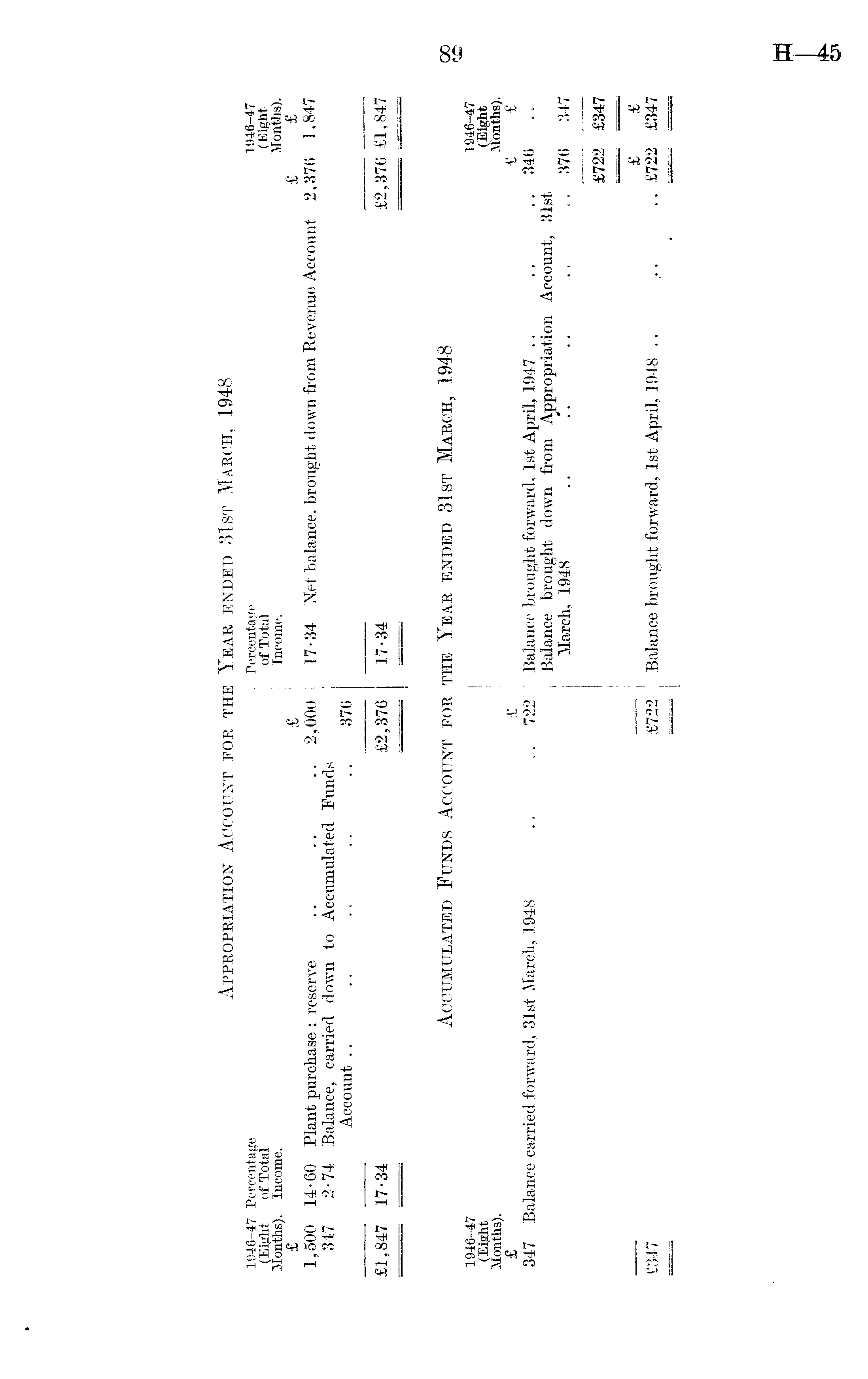 Appropriation Account for the Year ended 31st March, 1948 1946-47 Percentage i Percentage 1946-47 (Eight of Total I of Total (Eight Months). Income. Income. Months). £ £ £ £ 1,500 14-60 Plant purchase : reserve .. .. .. 2,000 I 17-34 Net balance, brought down from Revenue Account 2,376 1,847 347 2-74 Balance, carried down to Accumulated Funds Account .. .. .. .. .. 376 £1,847 17-34 £2,376 17-34 £2,376 £1,847 Accumulated Funds Account for the Year ended 31st March, 1948 1946-47 | 1946-47 (Eight (Eight Months). I Months). £ £ £ £ 347 Balance carried forward, 31st March, 1948 .. .. 722 i Balance brought forward, Ist April, 1947 .. .. .. 346 Balance brought down from Appropriation Account, 31st March, 1948 .. .. .. . . . . 376 347 £722 £347 £ £ £347 £722 Balance brought forward, Ist April, 1948 .. . .. £722 £347