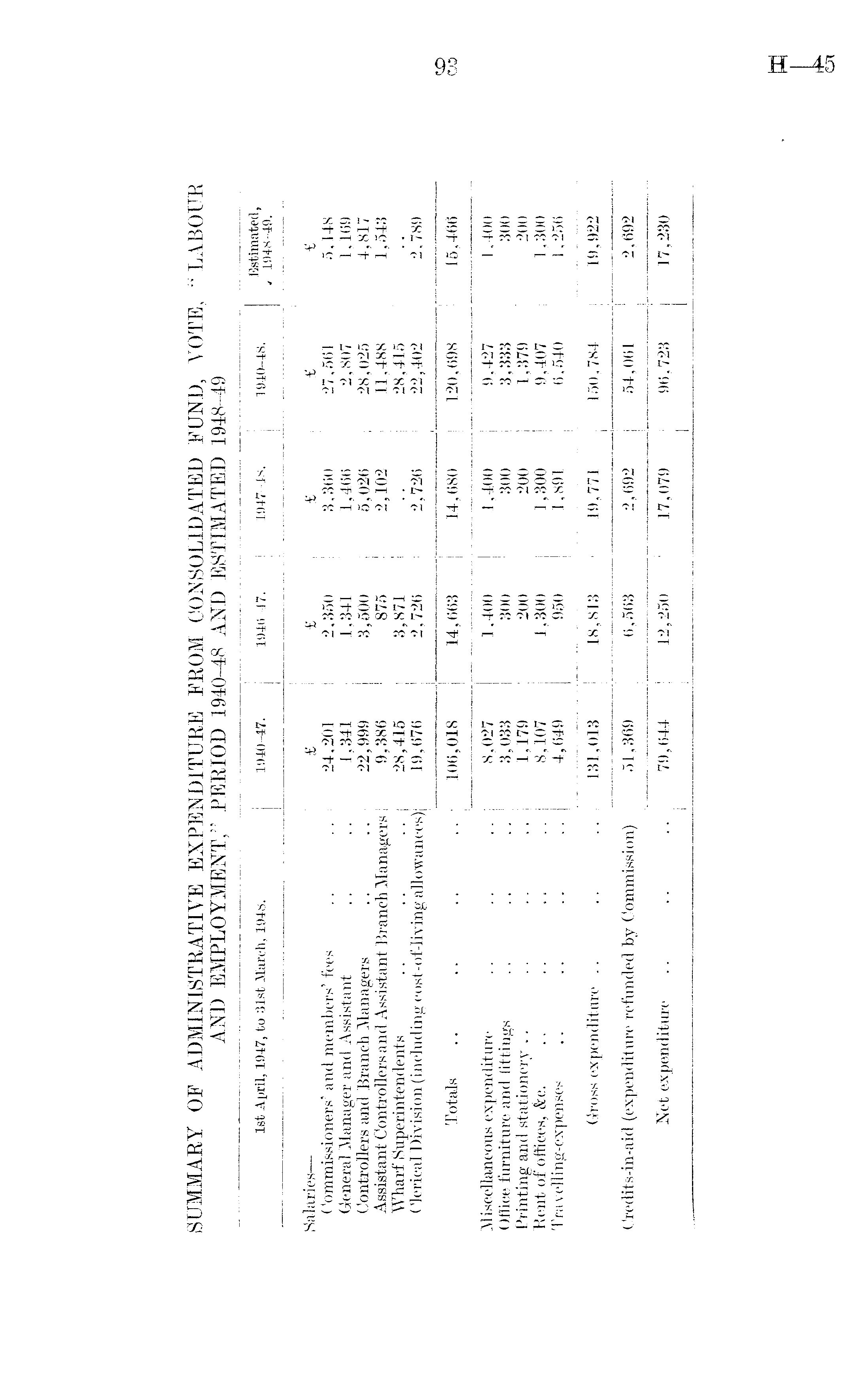 1st April, 1947, to 31st March, 1948. 1940-47. 1946-47. j 1947-48. 1940-48. Estimated, , 1948-49. Salaries — £ £ £ £ £ Commissioners' and members' fees 24,201 2,350 3,360 27,561 5,148 General Manager and Assistant 1,341 1,341 1,466 2,807 1,169 Controllers and Branch Managers 22,999 3,500 5,026 28,025 4,817 Assistant Controllers and Assistant Branch Managers 9,386 875 2,102 11,488 1,543 Wharf Superintendents 28,415 3,871 28,415 Clerical Division (including cost-of-living allowances) 19,676 2,726 2,726 22,402 2,789 Totals 106,018 14,663 14,680 120,698 15,466 Miscellaneous expenditure 8,027 1,400 1,400 9,427 1,400 Office furniture and fittings 3,033 300 300 3,333 300 Printing and stationery 1,179 200 200 1,379 200 Bent of offices, &c. 8,107 1,300 1,300 9,407 .1,300 Travelling-expenses 4,649 950 1,891 6,540 1,256 Gross expenditure 131,013 18,813 1 19,771 150,784 19,922 Credits-in-aid (expenditure refunded by Commission) Net expenditure 51,369 6,563 2,692 54,061 2,692 79,644 12,250 17,079 96,723 17,230