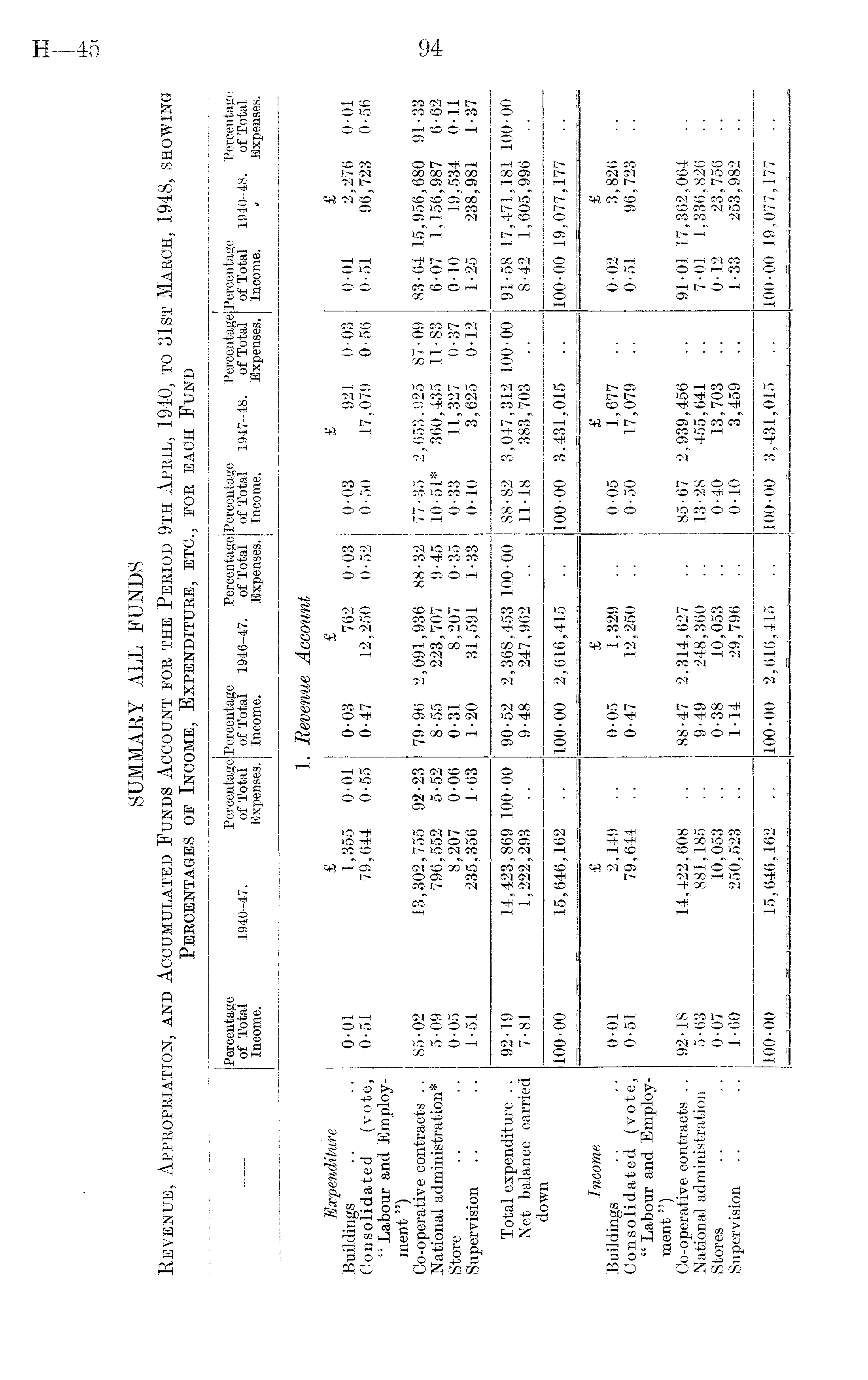 SUMMARY ALL FUNDS Revenue, Appropriation, and Accumulated Funds Account for the Period 9th April, 1940, to 31st March, 1948, showing Percentages of Income, Expenditure, etc., for each Fund