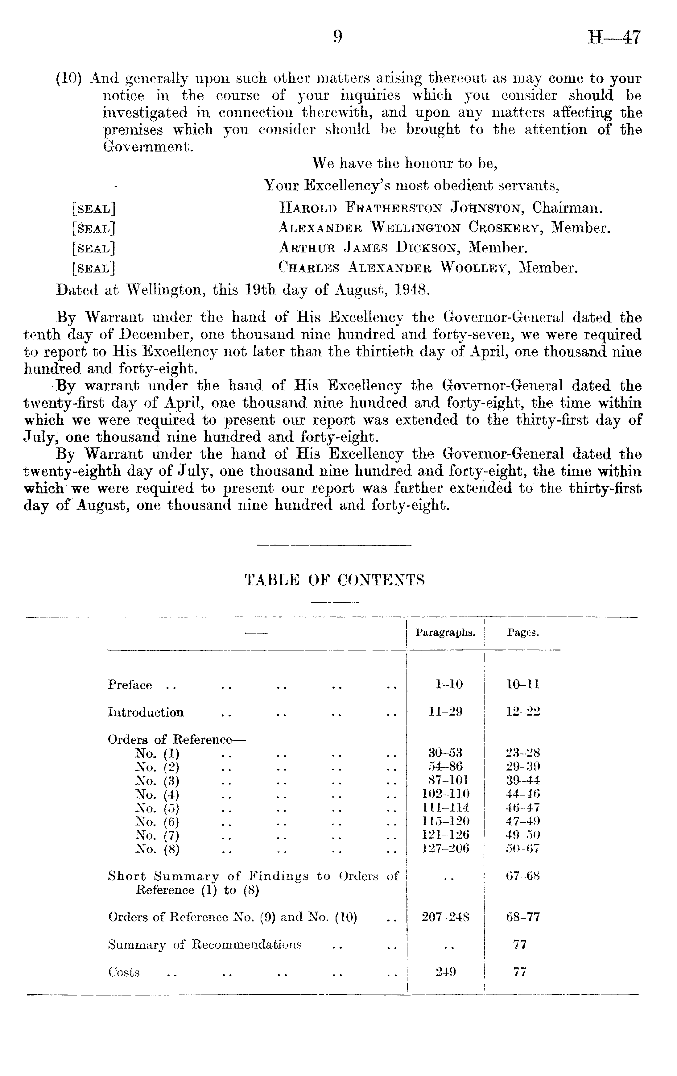 (10) And generally upon such other matters arising thereout as may come to your notice in the course of your inquiries which you consider should be investigated in connection therewith, and upon any matters affecting the premises which you consider should be brought to the attention of the Government. We have the honour to be, Your Excellency's most obedient servants, [seal] Harold FbatherstOn Johnston, Chairman. [seal] Alexander Wellington CrOskery, Member. [seal] Arthur James Dickson, Member. [seal] Charles Alexander Woolley, Member. Dated at Wellington, this 19th day of August, 1948. By Warrant under the hand of His Excellency the Governor-General dated the tenth day of December, one thousand nine hundred and forty-seven, we were required to report to His Excellency not later than the thirtieth day of April, one thousand nine hundred and forty-eight. By warrant under the hand of His Excellency the Governor-General dated the twenty-first day of April, one thousand nine hundred and forty-eight, the time within which we were required to present our report was extended to the thirty-first day of July, one thousand nine hundred and forty-eight. By Warrant under the hand of His Excellency the Governor-General dated the twenty-eighth day of July, one thousand nine hundred and forty-eight, the time within which we were required to present our report was further extended to the thirty-first day of August, one thousand nine hundred and forty-eight.