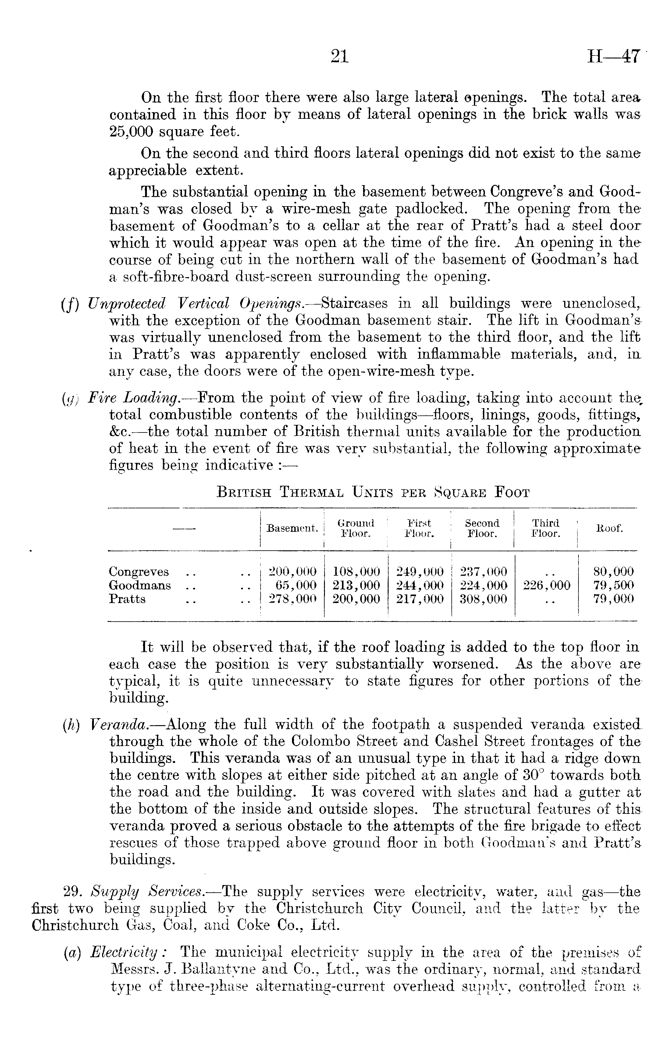 On the first floor there were also large lateral openings. The total area contained in this floor by means of lateral openings in the brick walls was 25,000 square feet. On the second and third floors lateral openings did not exist to the same appreciable extent. The substantial opening in the basement between Congreve's and Goodman's was closed by a wire-mesh gate padlocked. The opening from the basement of Goodman's to a cellar at the rear of Pratt's had a steel door which it would appear was open at the time of the fire. An opening in the course of being cut in the northern wall of the basement of Goodman's had a soft-fibre-board dust-screen surrounding the opening. (/) Unprotected Vertical Openings. —Staircases in all buildings were unenclosed,, with the exception of the Goodman basement stair. The lift in Goodman's was virtually unenclosed from the basement to the third floor, and the lift in Pratt's was apparently enclosed with inflammable materials, and, in any case, the doors were of the open-wire-mesh type. (g) Fire Loading. —From the point of view of fire loading, taking into account the, total combustible contents of the buildings—floors, linings, goods, fittings, &c.—the total number of British thermal units available for the production of heat in the event of fire was very substantial, the following approximate figures being indicative :