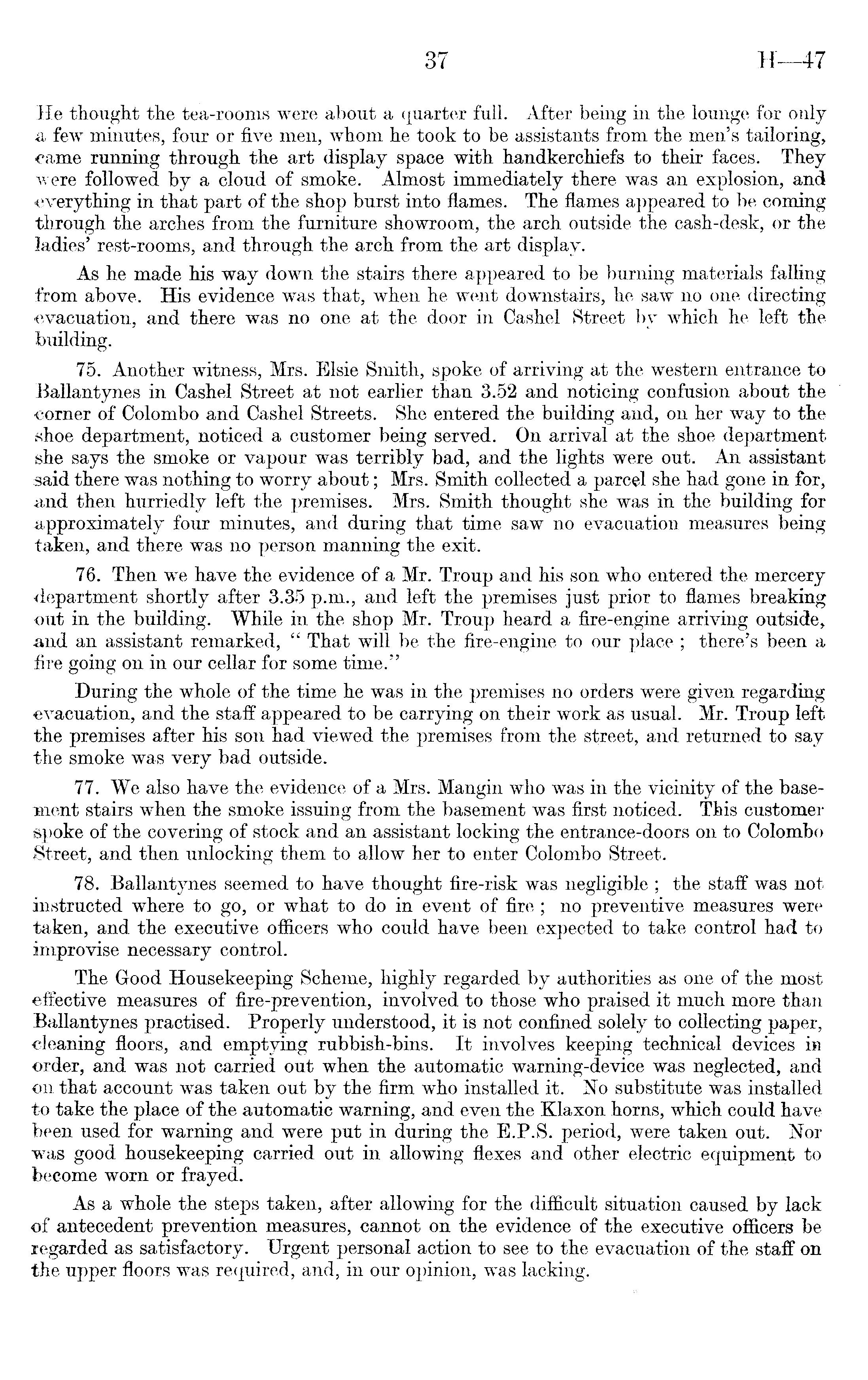 He thought the tea-rooms were about a quarter full. After being in the lounge for only a few minutes, four or five men, whom he took to be assistants from the men's tailoring, came running through the art display spaee with handkerchiefs to their faces. They were followed by a cloud of smoke. Almost immediately there was an explosion, and everything in that part of the shop burst into flames. The flames appeared to be coming through the arches from the furniture showroom, the arch outside the cash-desk, or the ladies' rest-rooms, and through the arch from the art display. As he made his way down the stairs there appeared to be burning materials falling from above. His evidence was that, when he went downstairs, he saw no one directing evacuation, and there was no one at the door in Cashel Street by which he left the building. 75. Another witness, Mrs. Elsie Smith, spoke of arriving at the western entrance to Ballantynes in Cashel Street at not earlier than 3.52 and noticing confusion about the corner of Colombo and Cashel Streets. She entered the building and, on her way to the shoe department, noticed a customer being served. On arrival at the shoe department she says the smoke or vapour was terribly bad, and the lights were out. An assistant said there was nothing to worry about; Mrs. Smith collected a parcel she had gone in for, and then hurriedly left the premises. Mrs. Smith thought she was in the building for approximately four minutes, and during that time saw no evacuation measures being taken, and there was no person manning the exit. 76. Then we have the evidence of a Mr. Troup and his son who entered the mercery department shortly after 3.35 p.m., and left the premises just prior to flames breaking out in the building. While in the shop Mr. Troup heard a fire-engine arriving outside, and an assistant remarked, " That will be the fire-engine to our place ; there's been a fire going on in our cellar for some time." During the whole of the time he was in the premises no orders were given regarding evacuation, and the staff appeared to be carrying on their work as usual. Mr. Troup left the premises after his son had viewed the premises from the street, and returned to say the smoke was very bad outside. 77. We also have the evidence of a Mrs. Mangin who was in the vicinity of the basement stairs when the smoke issuing from the basement was first noticed. This customer spoke of the covering of stock and an assistant locking the entrance-doors on to Colombo Street, and then unlocking them to allow her to enter Colombo Street. 78. Ballantynes seemed to have thought fire-risk was negligible ; the staff was not instructed where to go, or what to do in event of fire ; no preventive measures were taken, and the executive officers who could have been expected to take control had to improvise necessary control. The Good Housekeeping Scheme, highly regarded by authorities as one of the most effective measures of fire-prevention, involved to those who praised it much more than Ballantynes practised. Properly understood, it is not confined solely to collecting paper, cleaning floors, and emptying rubbish-bins. It involves keeping technical devices in order, and was not carried out when the automatic warning-device was neglected, and on that account was taken out by the firm who installed it. No substitute was installed to take the place of the automatic warning, and even the Klaxon horns, which could have been used for warning and were put in during the E.P.S. period, were taken out. Nor was good housekeeping carried out in allowing flexes and other electric equipment to become worn or frayed. As a whole the steps taken, after allowing for the difficult situation caused by lack of antecedent prevention measures, cannot on the evidence of the executive officers be regarded as satisfactory. Urgent personal action to see to the evacuation of the staff on the upper floors was required, and, in our opinion, was lacking.