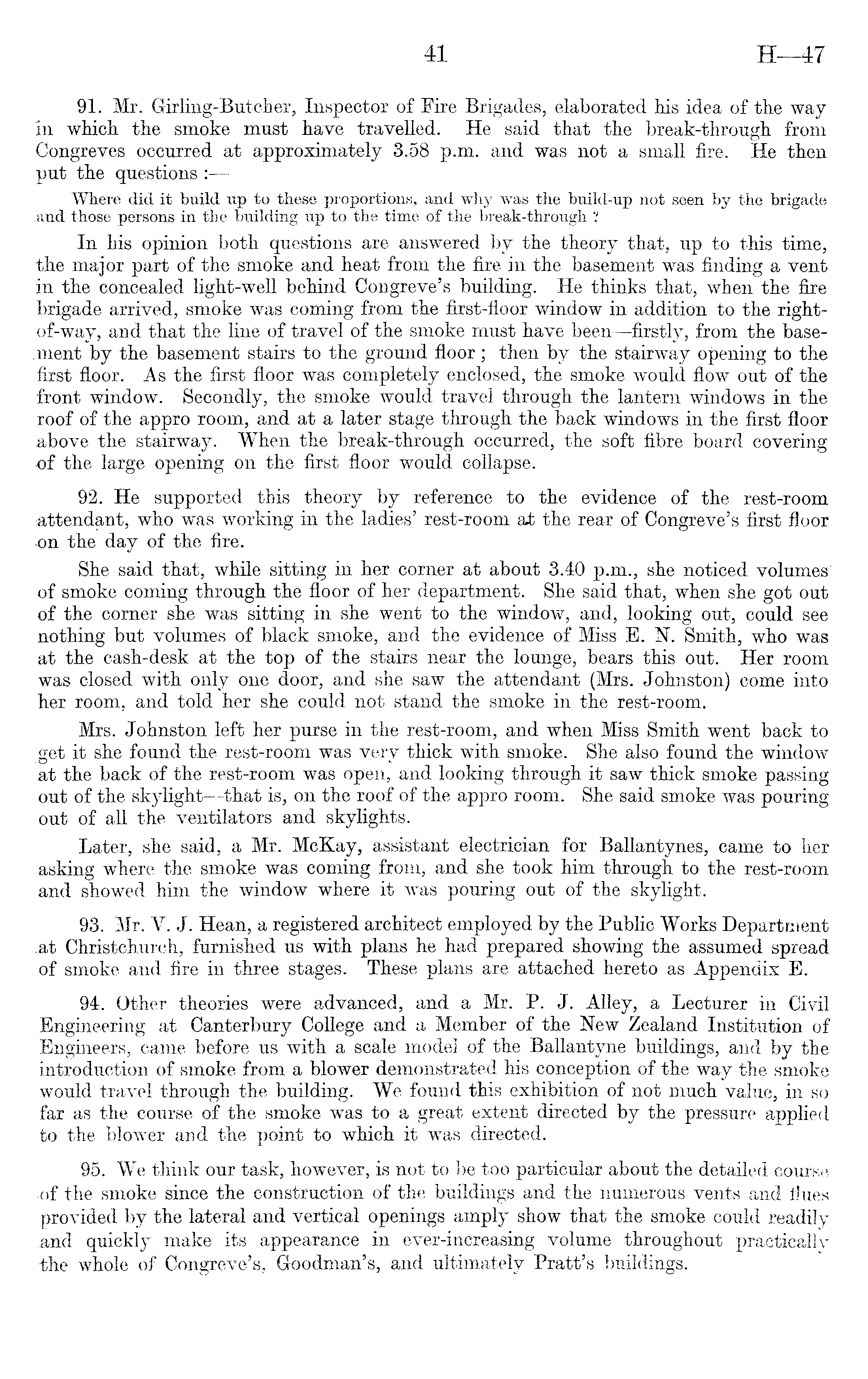 91. Mr. Girling-Butcher, Inspector of Fire Brigades, elaborated his idea of the way in which the smoke must have travelled. He said that the break-through from Congreves occurred at approximately 3.58 p.m. and was not a small fire. He then put the questions : Where did it build up to these proportions, and why was the build-up not seen by the brigade and those persons in the building up to the time of the break-through ? In his opinion both questions are answered by the theory that, up to this time, the major part of the smoke and heat from the fire in the basement was finding a vent in the concealed light-well behind Congreve's building. He thinks that, when the fire brigade arrived, smoke was coming from the first-floor window in addition to the right-of-way, and that the line of travel of the smoke must have been —firstly, from the base.ment by the basement stairs to the ground floor ; then by the stairway opening to the first floor. As the first floor was completely enclosed, the smoke would flow out of the front window. Secondly, the smoke would travel through the lantern windows in the roof of the appro room, and at a later stage through the back windows in the first floor above the stairway. When the break-through occurred, the soft fibre board covering of the large opening on the first floor would collapse. 92. He supported this theory by reference to the evidence of the rest-room attendant, who was working in the ladies' rest-room at the rear of Congreve's first floor •on the day of the fire. She said that, while sitting in her corner at about 3.40 p.m., she noticed volumes' -of smoke coming through the floor of her department. She said that, when she got out of the corner she was sitting in she went to the window, and, looking out, could see nothing but volumes of black smoke, and the evidence of Miss E. N. Smith, who was at the cash-desk at the top of the stairs near the lounge, bears this out. Her room was closed with only one door, and she saw the attendant (Mrs. Johnston) come into her room, and told her she could not stand the smoke in the rest-room. Mrs. Johnston left her purse in the rest-room, and when Miss Smith went back to get it she found the rest-room was very thick with smoke. She also found the window at the back of the rest-room was open, and looking through it saw thick smoke passing out of the skylight—that is, on the roof of the appro room. She said smoke was pouring out of all the ventilators and skylights. Later, she said, a Mr. McKay, assistant electrician for Ballantynes, came to her .asking where the smoke was coming from, and she took him through to the rest-room and showed him the window where it was pouring out of the skylight. 93. Mr. V. J. Hean, a registered architect employed by the Public Works Department .at Christchurch, furnished us with plans he had prepared showing the assumed spread of smoke and fire in three stages. These plans are attached hereto as Appendix E. 94. Other theories were advanced, and a Mr. P. J. Alley, a Lecturer in Civil Engineering at Canterbury College and a Member of the New Zealand Institution of Engineers, came before us with a scale model of the Ballantyne buildings, and by the introduction of smoke from a blower demonstrated his conception of the way the smoke would travel through the building. We found this exhibition of not much value, in so far as the course of the smoke was to a great extent directed by the pressure applied to the blower and the point to which it was directed. 95. We think our task, however, is not to be too particular about the detailed course of the smoke since the construction of the buildings and the numerous vents and flues provided by the lateral and vertical openings amply show that the smoke could readily .and quickly make its appearance in ever-increasing volume throughout practically the whole of Goodman's, and ultimately Pratt's buildings.