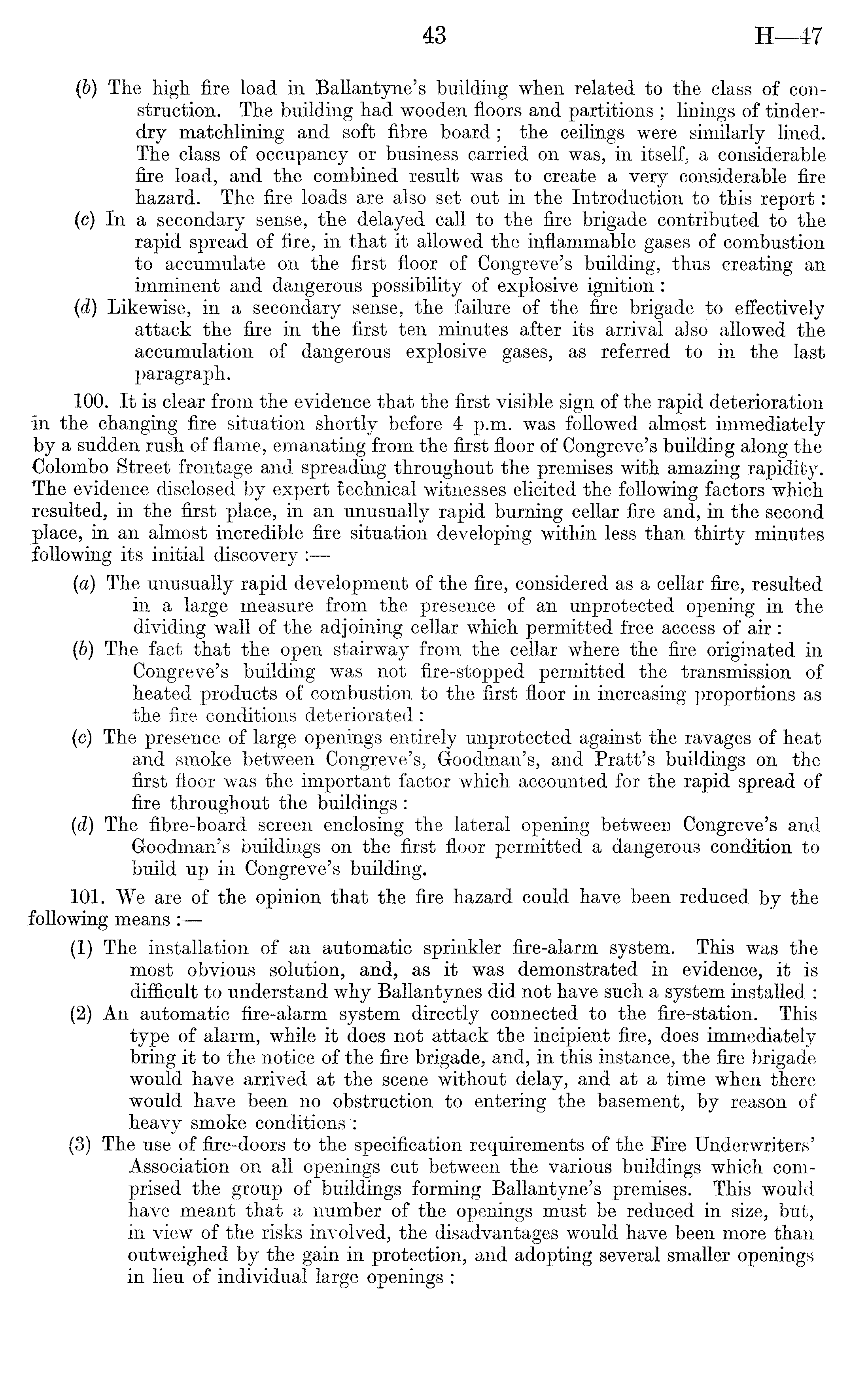 (b) The high fire load in Ballantyne's building when related to the class of construction. The building had wooden floors and partitions ; linings of tinderdry matchlining and soft fibre board ; the ceilings were similarly lined. The class of occupancy or business carried on was, in itself, a considerable fire load, and the combined result was to create a very considerable fire hazard. The fire loads are also set out in the Introduction to this report: (c) In a secondary sense, the delayed call to the fire brigade contributed to the rapid spread of fire, in that it allowed the inflammable gases of combustion to accumulate on the first floor of Congreve's building, thus creating an imminent and dangerous possibility of explosive ignition : (d) Likewise, in a secondary sense, the failure of the fire brigade to effectively attack the fire in the first ten minutes after its arrival also allowed the accumulation of dangerous explosive gases, as referred to in the last paragraph. 100. It is clear from the evidence that the first visible sign of the rapid deterioration in the changing fire situation shortly before 4 p.m. was followed almost immediately by a sudden rush of flame, emanating from the first floor of Congreve's building along the Colombo Street frontage and spreading throughout the premises with amazing rapidity. The evidence disclosed by expert technical witnesses elicited the following factors which resulted, in the first place, in an unusually rapid burning cellar fire and, in the second place, in an almost incredible fire situation developing within less than thirty minutes following its initial discovery : (a) The unusually rapid development of the fire, considered as a cellar fire, resulted in a large measure from the presence of an unprotected opening in the dividing wall of the adjoining cellar which permitted free access of air : (b) The fact that the open stairway from the cellar where the fire originated in Congreve's building was not fire-stopped permitted the transmission of heated products of combustion to the first floor in increasing proportions as the fire conditions deteriorated : (c) The presence of large openings entirely unprotected against the ravages of heat and smoke between Congreve's, Goodman's, and Pratt's buildings on the first floor was the important factor which accounted for the rapid spread of fire throughout the buildings : (d) The fibre-board screen enclosing the lateral opening between Congreve's and Goodman's buildings on the first floor permitted a dangerous condition to build up in Congreve's building. 101. We are of the opinion that the fire hazard could have been reduced by the following means : (1) The installation of an automatic sprinkler fire-alarm system. This was the most obvious solution, and, as it was demonstrated in evidence, it is difficult to understand why Ballantynes did not have such a system installed : (2) An automatic fire-alarm system directly connected to the fire-station. This type of alarm, while it does not attack the incipient fire, does immediately bring it to the notice of the fire brigade, and, in this instance, the fire brigade would have arrived at the scene without delay, and at a time when there would have been no obstruction to entering the basement, by reason of heavy smoke conditions : (3) The use of fire-doors to the specification requirements of the Fire Underwriters' Association on all openings cut between the various buildings which comprised the group of buildings forming Ballantyne's premises. This would nave meant that a number of the openings must be reduced in size, but, in view of the risks involved, the disadvantages would have been more than outweighed by the gain in protection, and adopting several smaller openings in lieu of individual large openings :