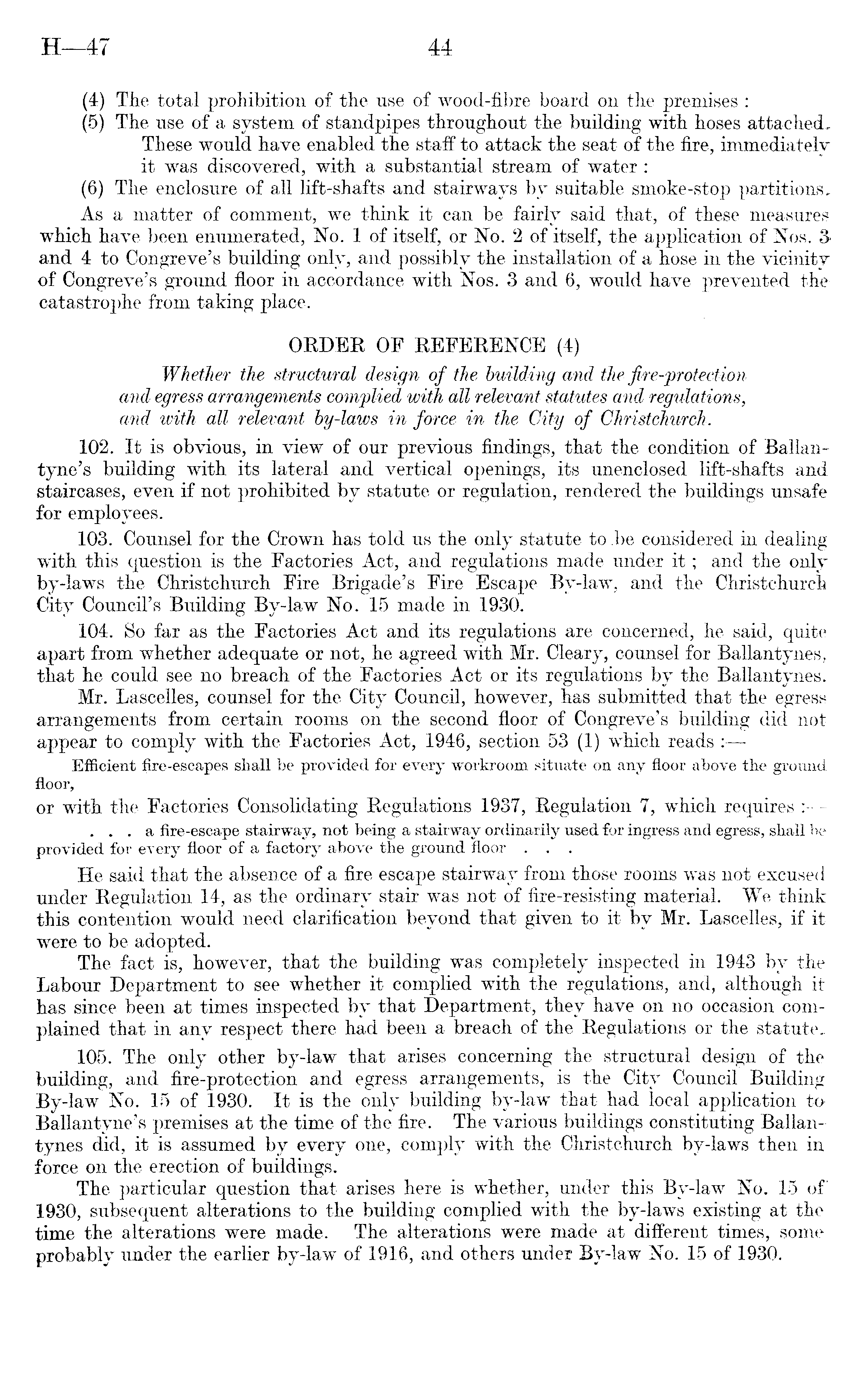 (4) The total prohibition of the use of wood-fibre board on the premises : (5) The use of a system of standpipes throughout the building with hoses attached. These would have enabled the staff to attack the seat of the fire, immediately it was discovered, with a substantial stream of water : (6) The enclosure of all lift-shafts and stairways by suitable smoke-stop partitions. As a matter of comment, we think it can be fairly said that, of these measures which have been enumerated, No. 1 of itself, or No. 2 of itself, the application of Nos. & and 4 to Congreve's building only, and possibly the installation of a hose in the vicinity of Congreve's ground floor in accordance with Nos. 3 and 6, would have prevented the catastrophe from taking place. ORDER OF REFERENCE (4) Whether the structural design of the building and the fire-protection and egress arrangements complied with all relevant statutes and regulations, and ivith all relevant by-laws in force in the City of Christchurch. 102. It is obvious, in view of our previous findings, that the condition of Ballantyne's building with its lateral and vertical openings, its unenclosed lift-shafts and staircases, even if not prohibited by statute or regulation, rendered the buildings unsafe for employees. 103. Counsel for the Crown has told us the only statute to be considered in dealing with this question is the Factories Act, and regulations made under it; and the only by-laws the Christchurch Fire Brigade's Fire Escape By-law, and the Christchurch City Council's Building By-law No. 15 made in 1930. 104. So far as the Factories Act and its regulations are concerned, he said, quite apart from whether adequate or not, he agreed with Mr. Cleary, counsel for Ballantynes, that he could see no breach of the Factories Act or its regulations by the Ballantynes. Mr. Lascelles, counsel for the City Council, however, has submitted that the egress arrangements from certain rooms on the second floor of Congreve's building did not appear to comply with the Factories Act, 1946, section 53 (1) which reads : Efficient fire-escapes shall be provided for every workroom situate on any floor above the ground floor, or with the Factories Consolidating Regulations 1937, Regulation 7, which requires : ... a fire-escape stairway, not being a stairway ordinarily used for ingress and egress, shall be provided for every floor of a factory above the ground floor . . . He said that the absence of a fire escape stairway from those rooms was not excused under Regulation 14, as the ordinary stair was not of fire-resisting material. We think this contention would need clarification beyond that given to it by Mr. Lascelles, if it were to be adopted. The fact is, however, that the building was completely inspected in 1943 by the Labour Department to see whether it complied with the regulations, and, although it has since been at times inspected by that Department, they have on no occasion complained that in any respect there had been a breach of the Regulations or the statute.. 105. The only other by-law that arises concerning the structural design of the building, and fire-protection and egress arrangements, is the City Council Building By-law No. 15 of 1930. It is the only building by-law that had local application to Ballantyne's premises at the time of the fire. The various buildings constituting Ballantynes did, it is assumed by every one, comply with the Christchurch by-laws then in force on the erection of buildings. The particular question that arises here is whether, under this By-law No. 15 of 1930, subsequent alterations to the building complied with the by-laws existing at the time the alterations were made. The alterations were made at different times, some probably under the earlier by-law of 1916, and others under By-law No. 15 of 1930.
