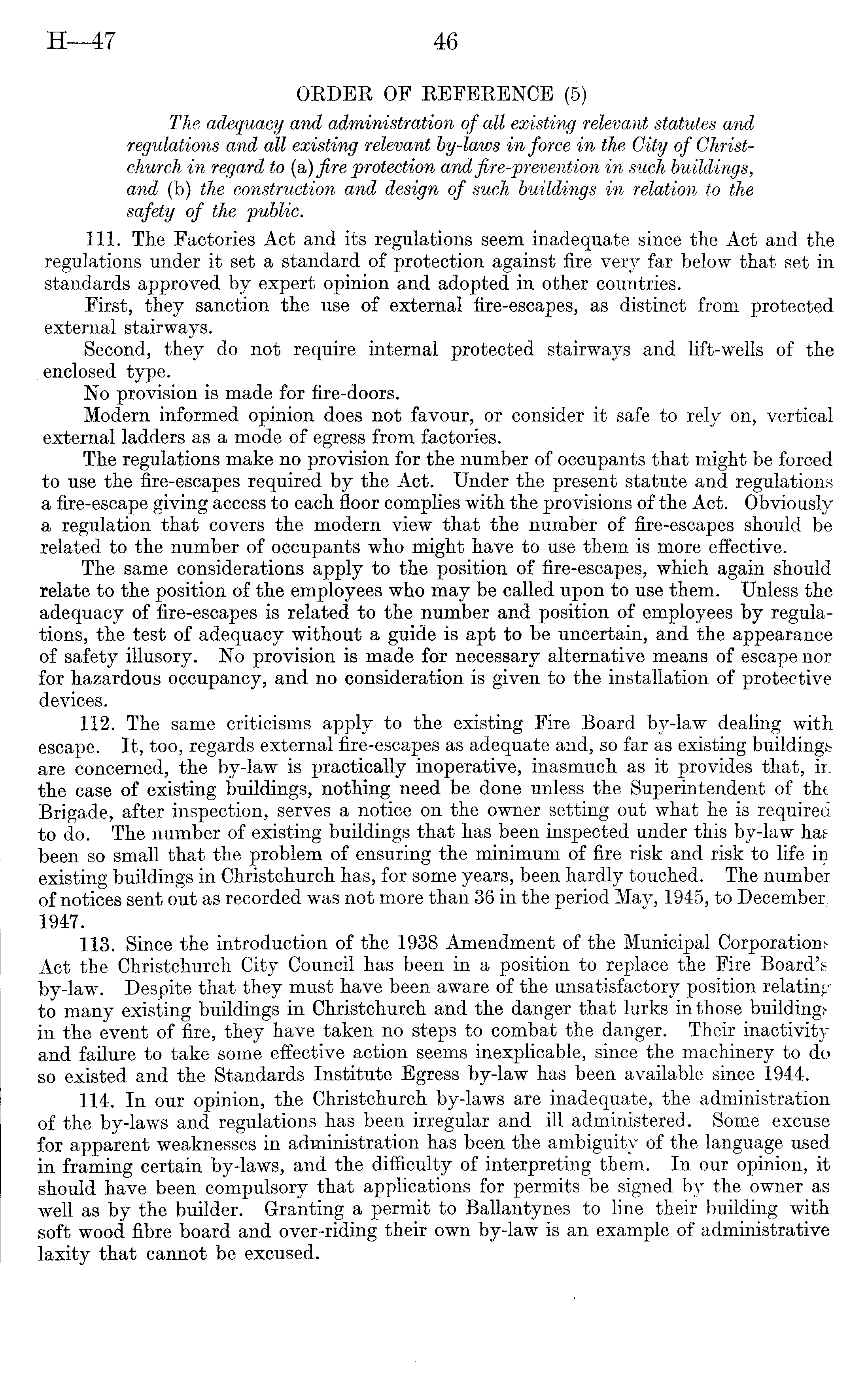 ORDER OF REFERENCE (5) The adequacy and administration of all existing relevant statutes and regulations and all existing relevant by-laws in force in the City of Christchurch in regard to (a,) fire protection and fire-prevention in such buildings, and (b) the construction and design of such buildings in relation to the safety of the public. 111. The Factories Act and its regulations seem inadequate since the Act and the regulations under it set a standard of protection against fire very far below that set in standards approved by expert opinion and adopted in other countries. First, they sanction the use of external fire-escapes, as distinct from protected external stairways. Second, they do not require internal protected stairways and lift-wells of the .enclosed type. No provision is made for fire-doors. Modern informed opinion does not favour, or consider it safe to rely on, vertical external ladders as a mode of egress from factories. The regulations make no provision for the number of occupants that might be forced to use the fire-escapes required by the Act. Under the present statute and regulations a fire-escape giving access to each floor complies with the provisions of the Act. Obviously a regulation that covers the modern view that the number of fire-escapes should be related to the number of occupants who might have to use them is more effective. The same considerations apply to the position of fire-escapes, which again should relate to the position of the employees who may be called upon to use them. Unless the adequacy of fire-escapes is related to the number and position of employees by regulations, the test of adequacy without a guide is apt to be uncertain, and the appearance of safety illusory. No provision is made for necessary alternative means of escape nor for hazardous occupancy, and no consideration is given to the installation of protective devices. 112. The same criticisms apply to the existing Fire Board by-law dealing with escape. It, too, regards external fire-escapes as adequate and, so far as existing buildings are concerned, the by-law is practically inoperative, inasmuch as it provides that, ii. the case of existing buildings, nothing need be done unless the Superintendent of thf Brigade, after inspection, serves a notice on the owner setting out what he is required to do. The number of existing buildings that has been inspected under this by-law has been so small that the problem of ensuring the minimum of fire risk and risk to life irj existing buildings in Christchurch has, for some years, been hardly touched. The number of notices sent out as recorded was not more than 36 in the period May, 1945, to December. 1947. 113. Since the introduction of the 1938 Amendment of the Municipal Corporation.' Act the Christchurch City Council has been in a position to replace the Fire Board's by-law. Despite that they must have been aware of the unsatisfactory position relating to many existing buildings in Christchurch and the danger that lurks in those buildings in the event of fire, they have taken no steps to combat the danger. Their inactivity and failure to take some effective action seems inexplicable, since the machinery to do so existed and the Standards Institute Egress by-law has been available since 1944. 114. In our opinion, the Christchurch by-laws are inadequate, the administration of the by-laws and regulations has been irregular and ill administered. Some excuse for apparent weaknesses in administration has been the ambiguity of the language used in framing certain by-laws, and the difficulty of interpreting them. In our opinion, it should have been compulsory that applications for permits be signed by the owner as well as by the builder. Granting a permit to Ballantynes to line their building with soft wood fibre board and over-riding their own by-law is an example of administrative laxity that cannot be excused.